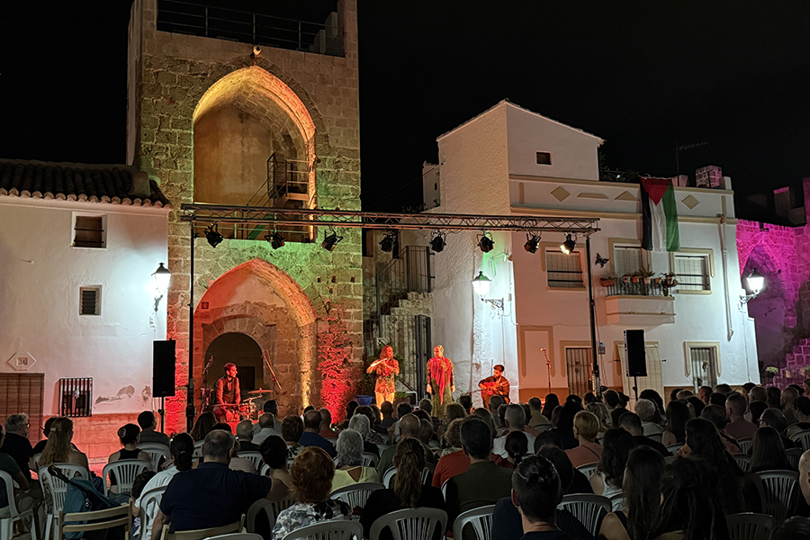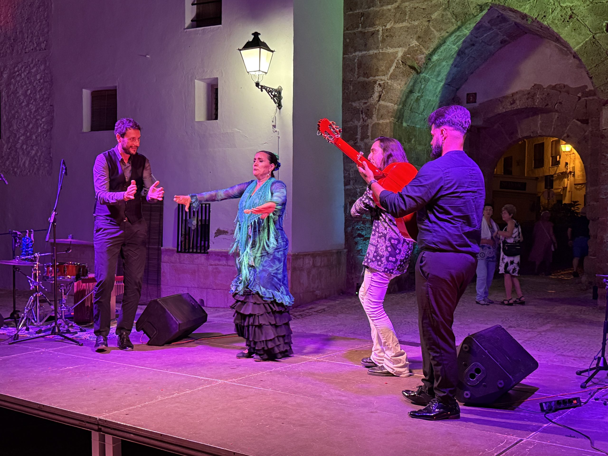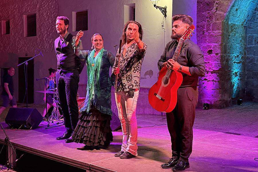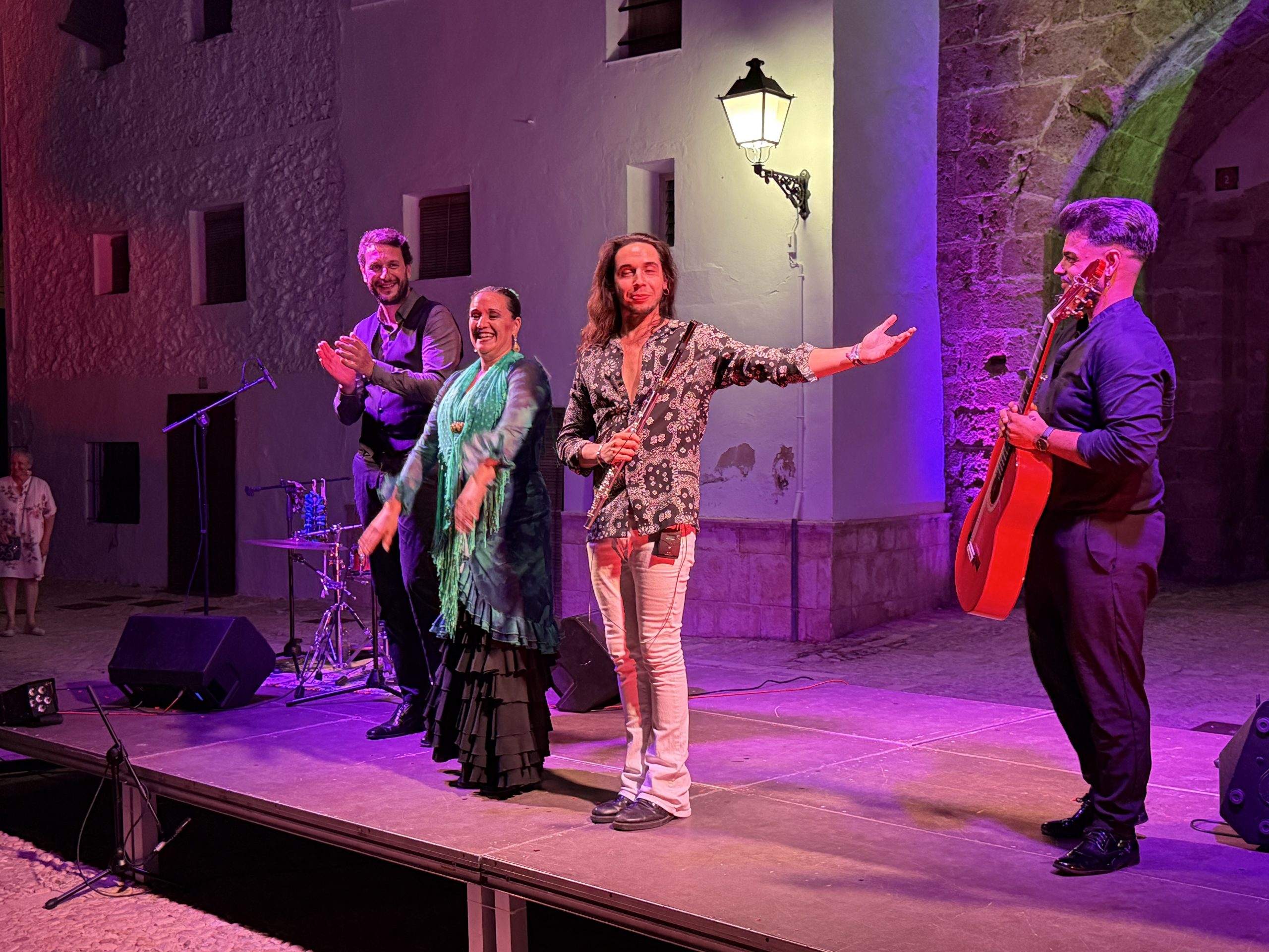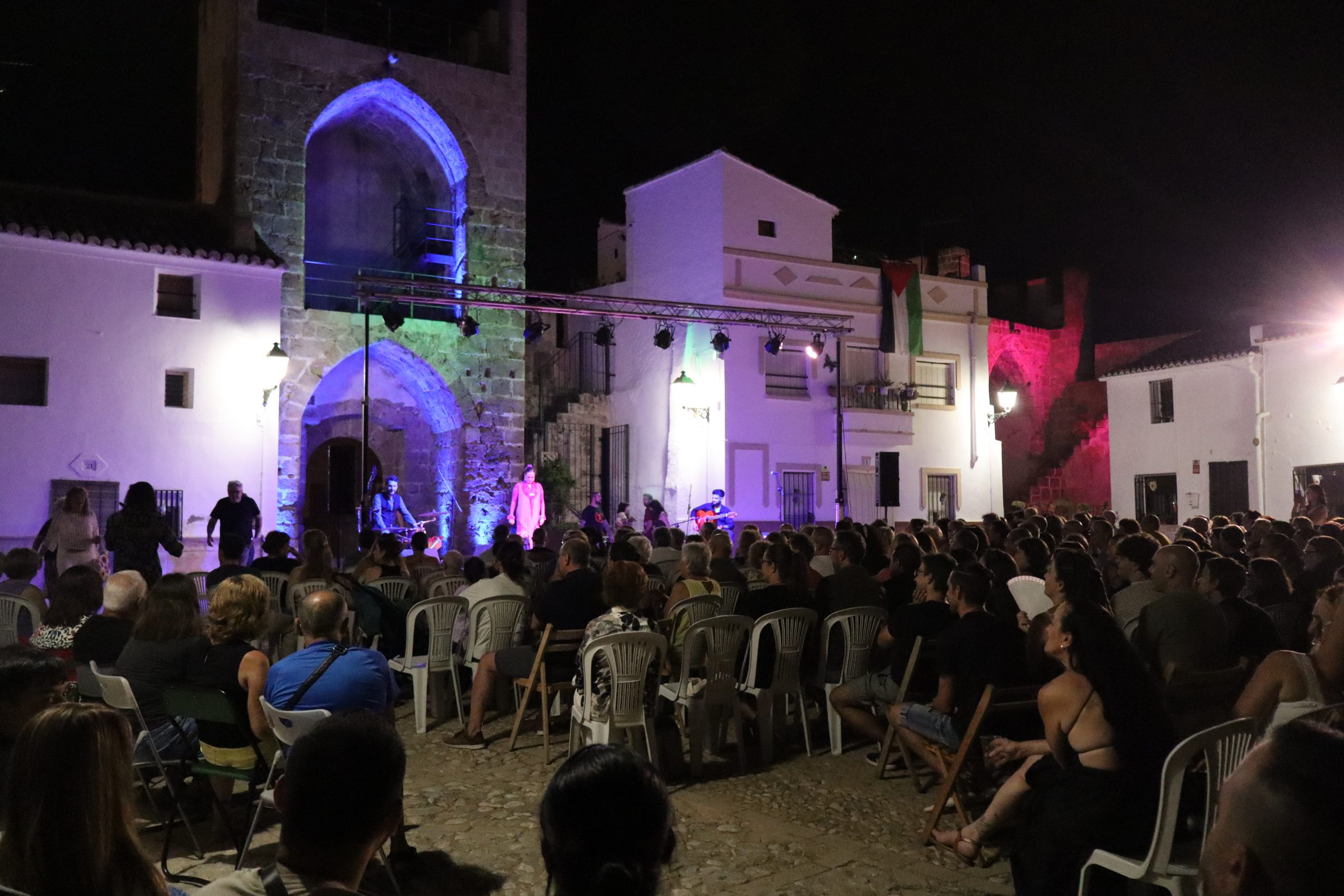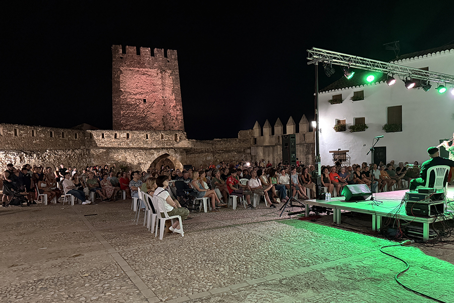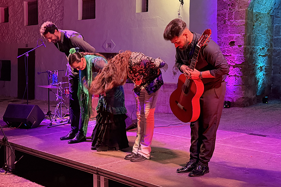 El público llenó cada rincón de la plaza, creando un ambiente íntimo y entregado que conectó desde el primer momento con los artistas. La mezcla de cante, toque, baile y la atmósfera del castillo iluminado con luces cálidas y colores vibrantes convirtieron la velada en una experiencia irrepetible.