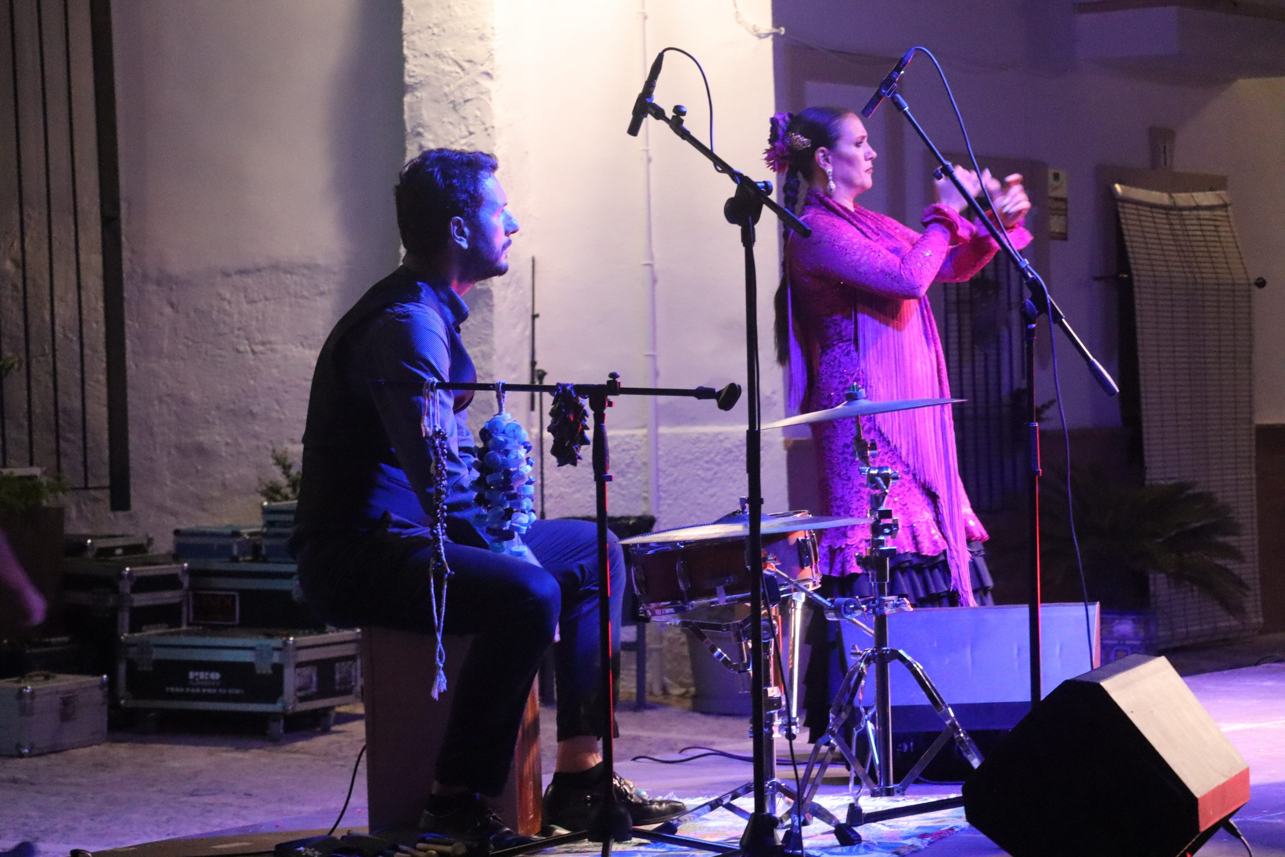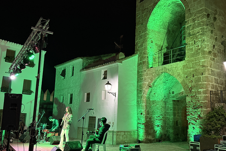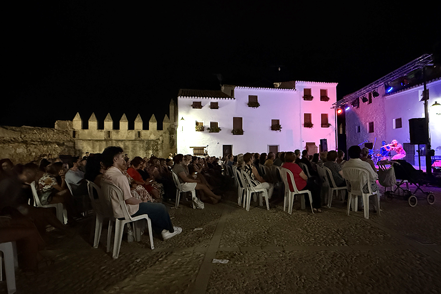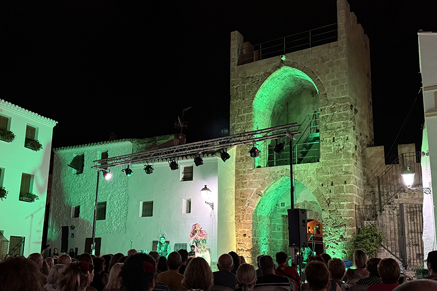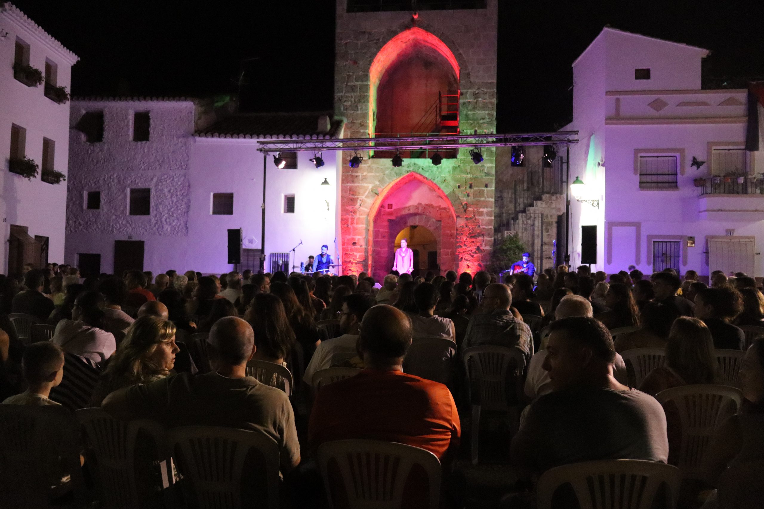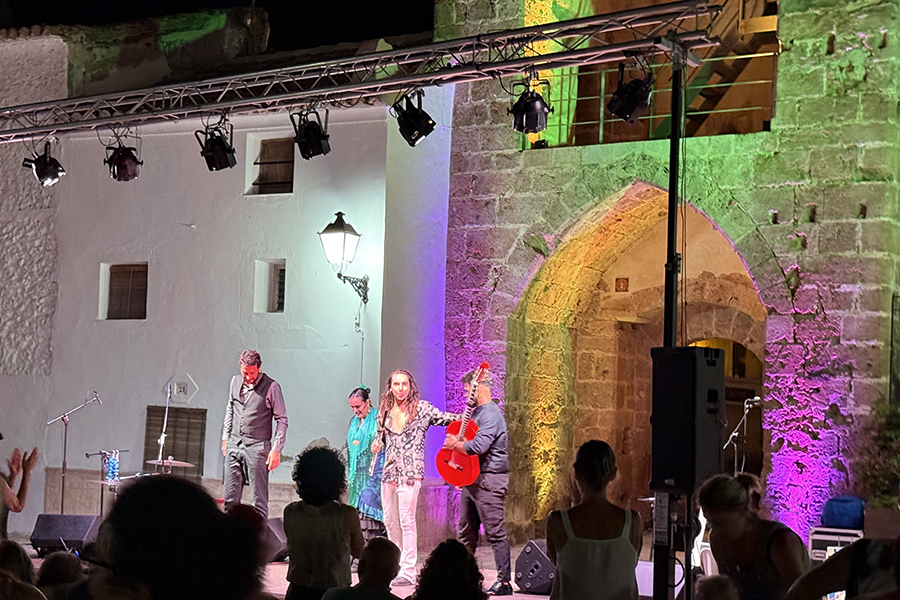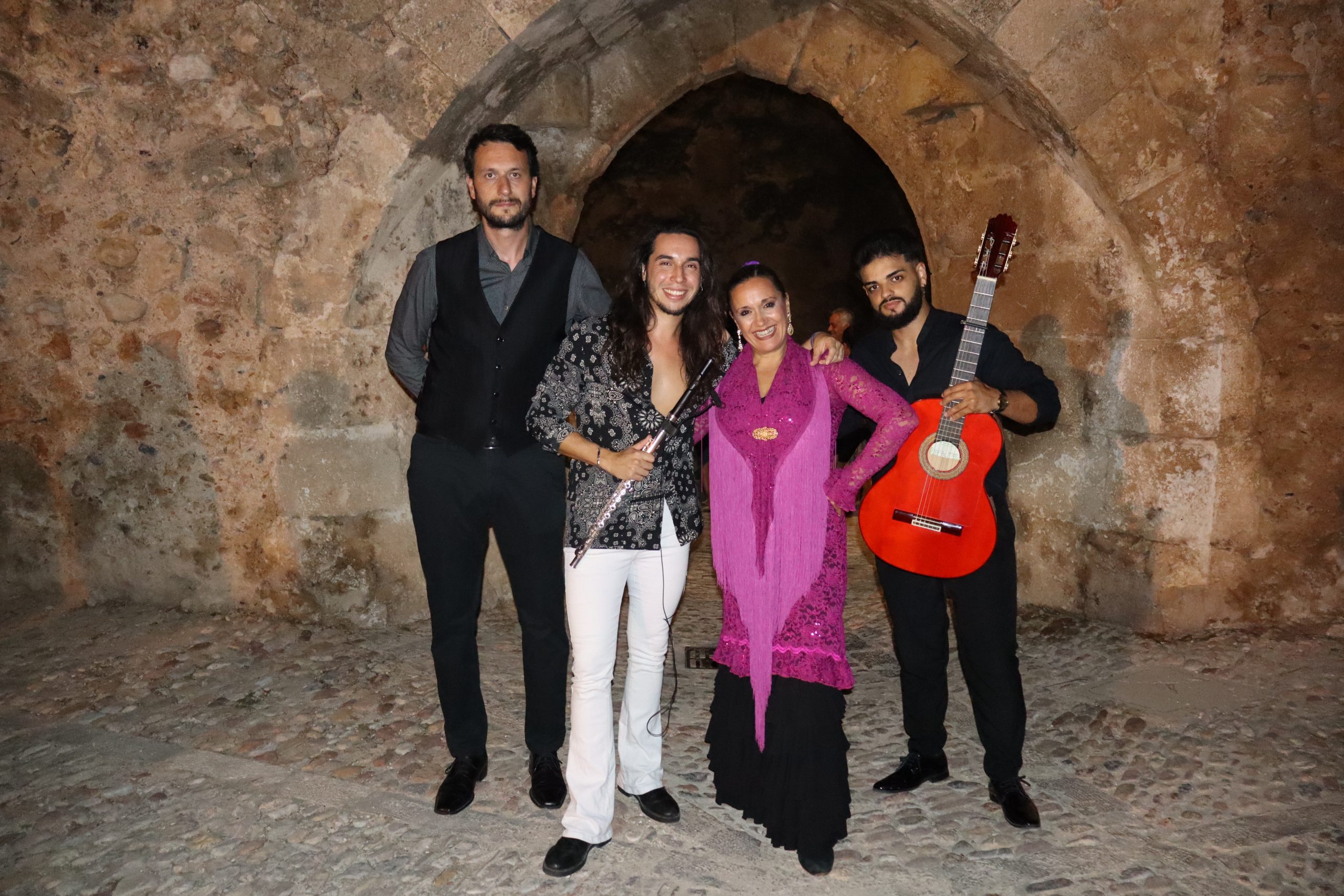 El público llenó cada rincón de la plaza, creando un ambiente íntimo y entregado que conectó desde el primer momento con los artistas. La mezcla de cante, toque, baile y la atmósfera del castillo iluminado con luces cálidas y colores vibrantes convirtieron la velada en una experiencia irrepetible.