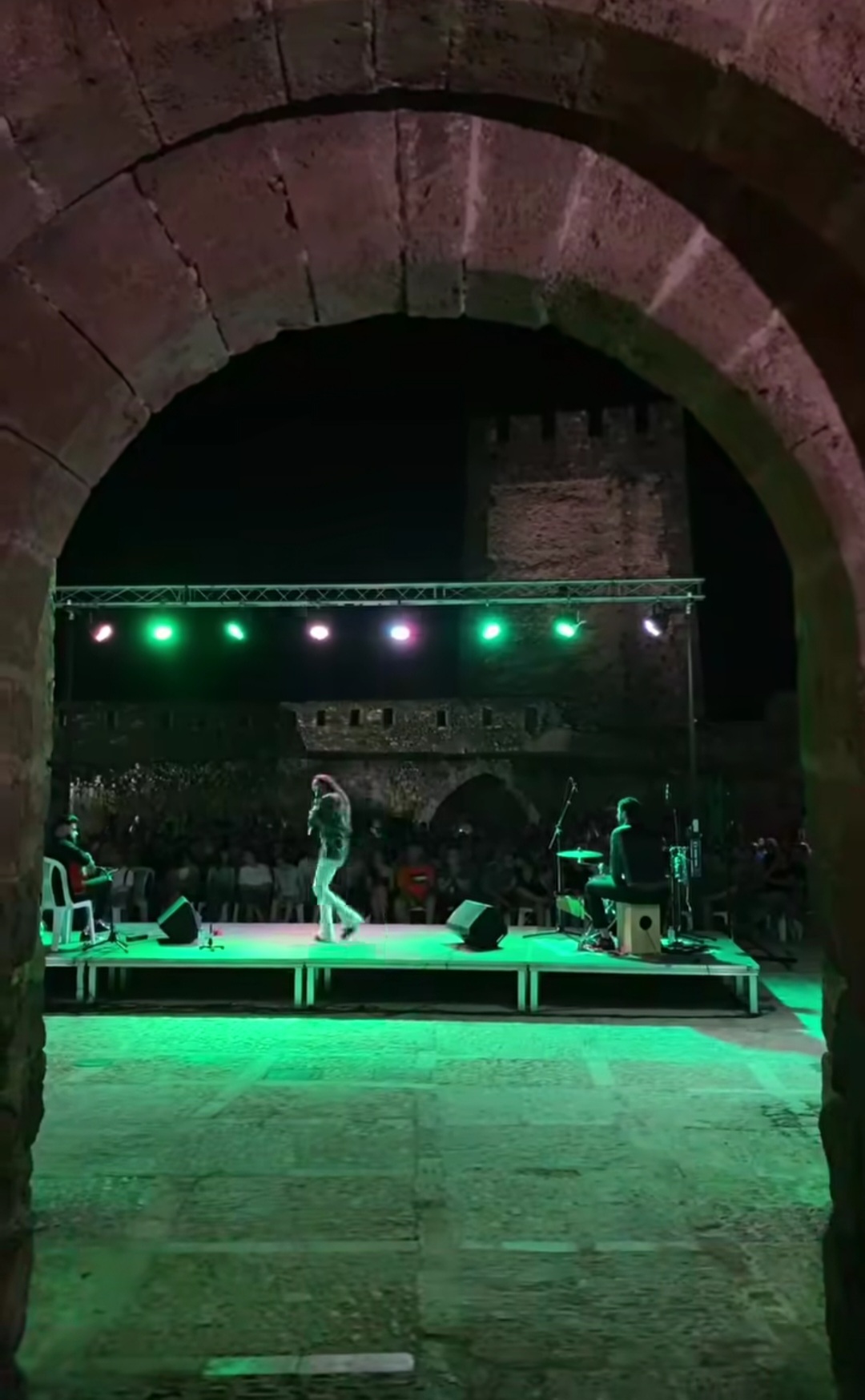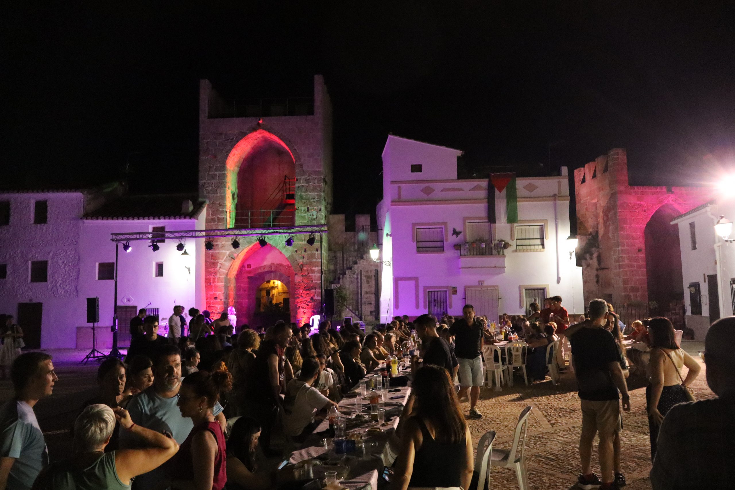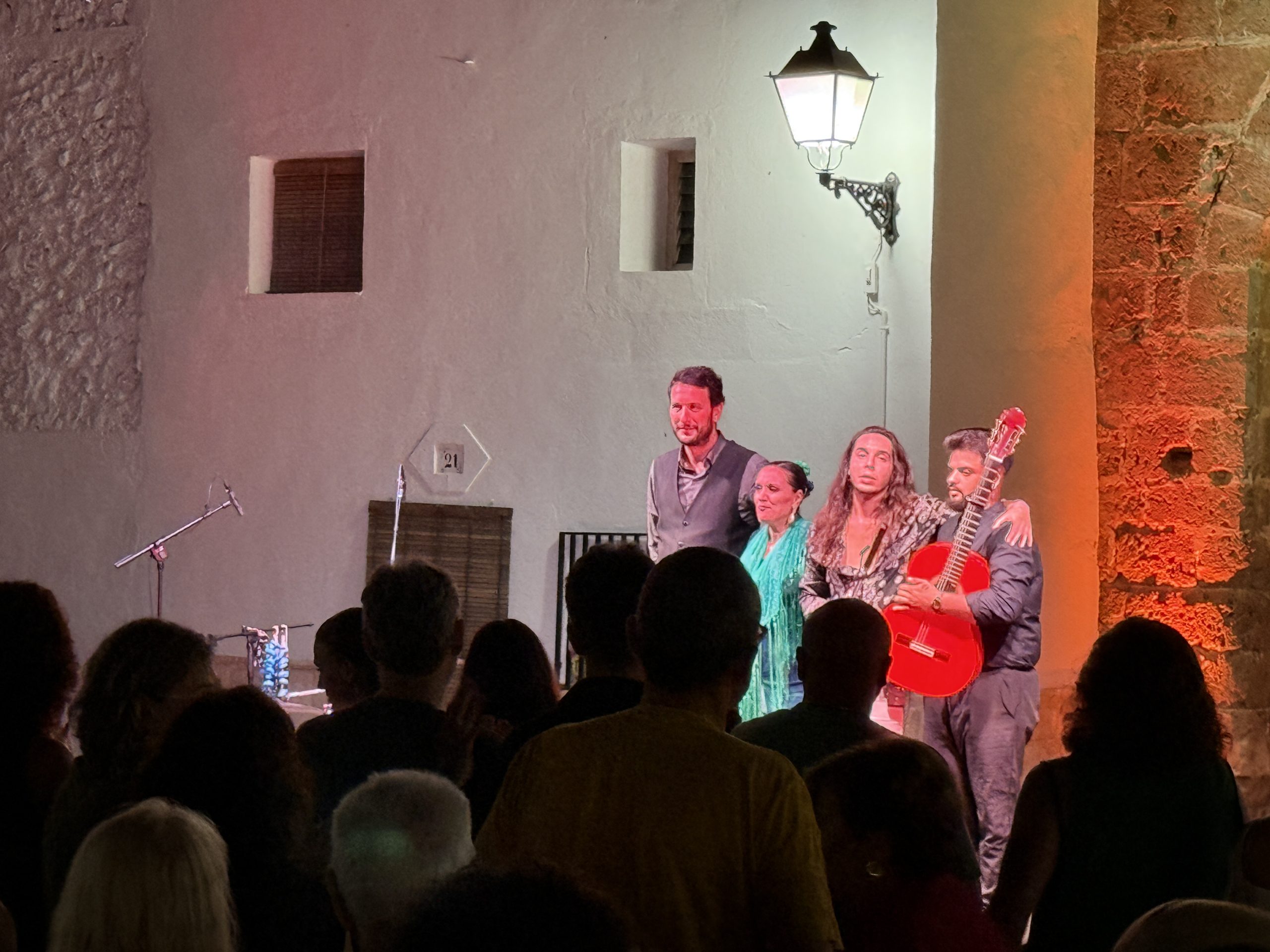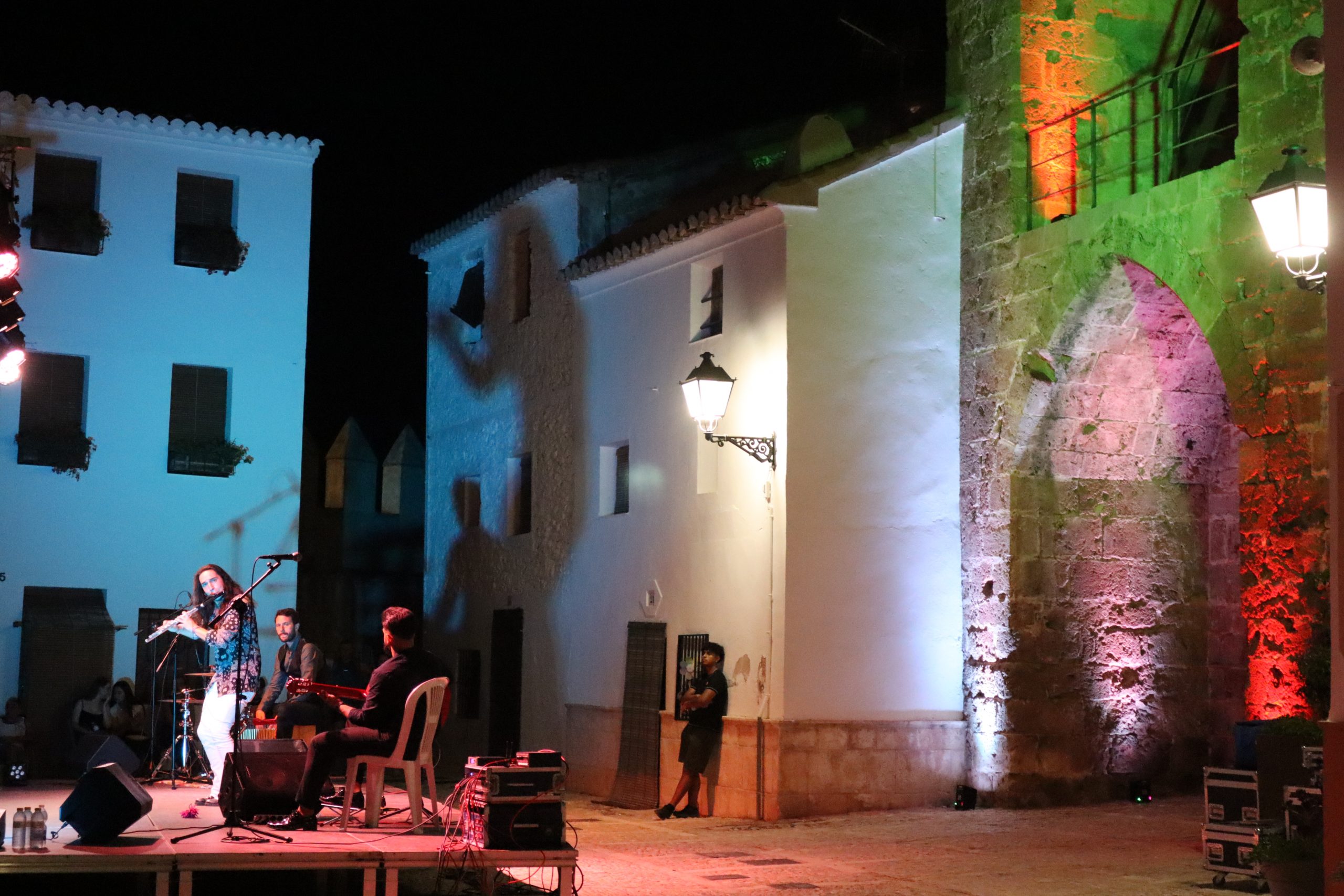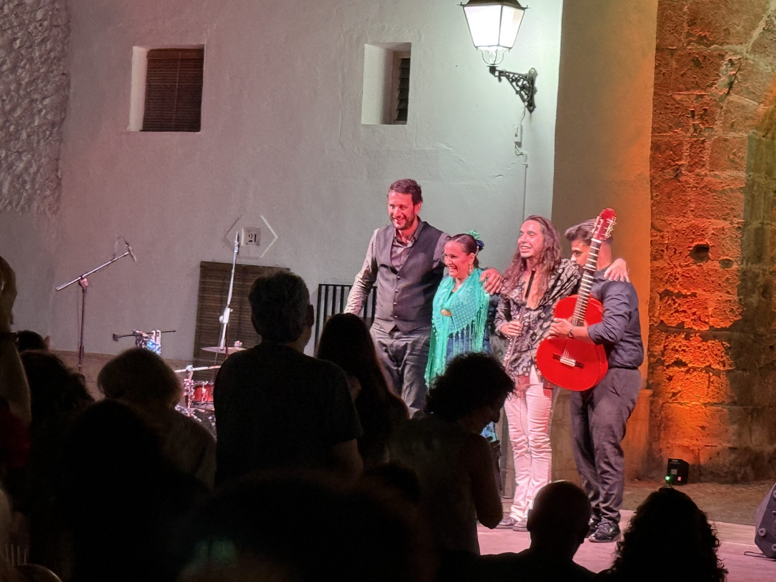 El público llenó cada rincón de la plaza, creando un ambiente íntimo y entregado que conectó desde el primer momento con los artistas. La mezcla de cante, toque, baile y la atmósfera del castillo iluminado con luces cálidas y colores vibrantes convirtieron la velada en una experiencia irrepetible.