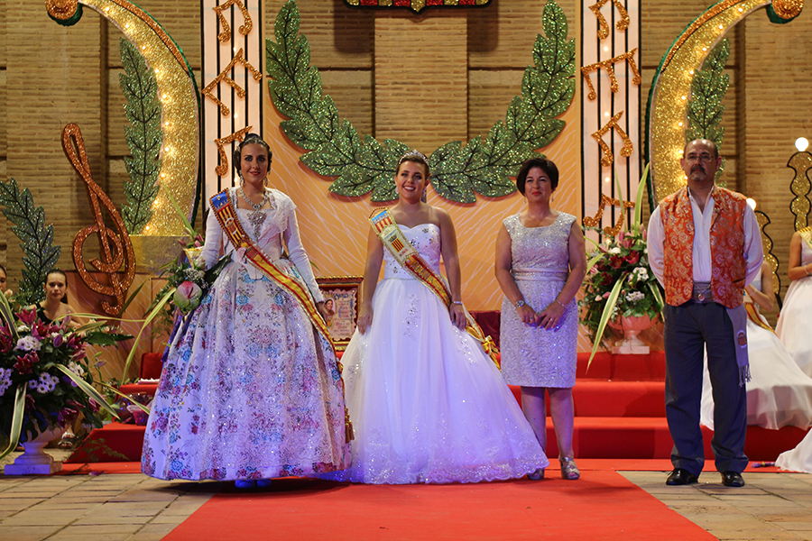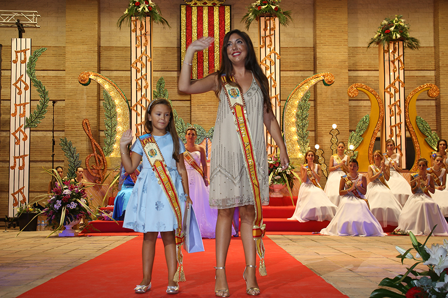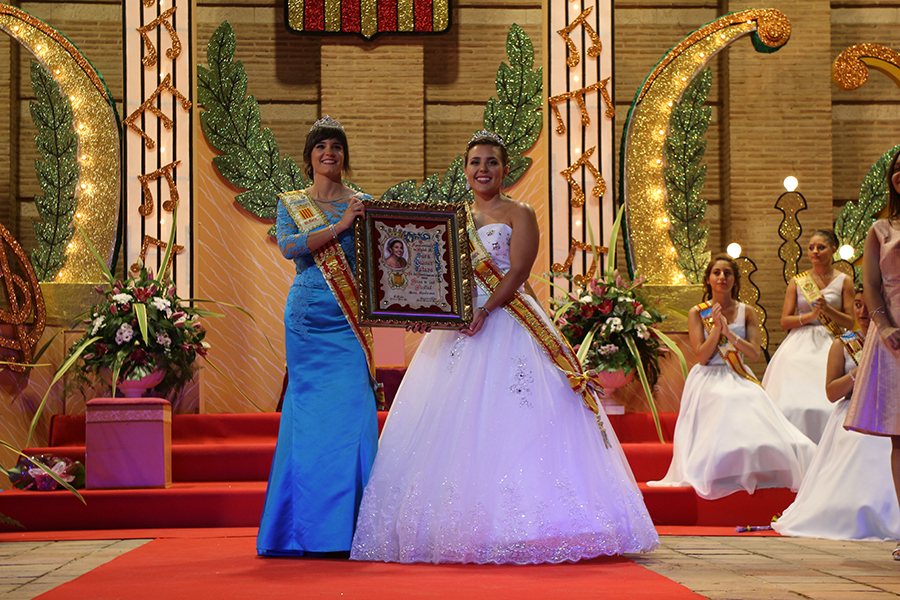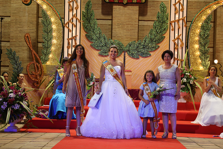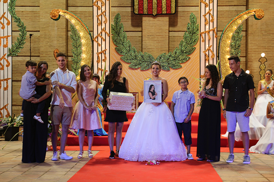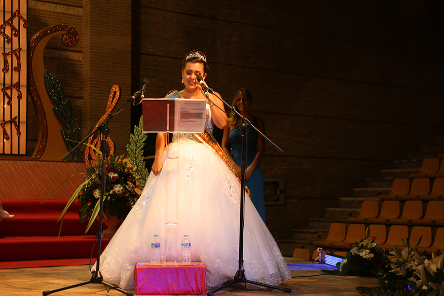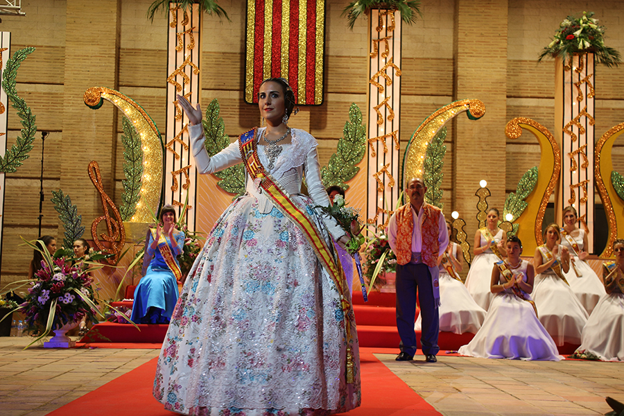 Toda presentación tiene una despedida, esa fue la de Mireia Pastor después de un intenso año. Con unas emotivas palabras cedió el testigo a Sara Palmer, que bajó las escaleras del Auditorio resplandeciente, con un vestido blanco maravilloso. Una vez llegó al escenario, entre el aplauso de los asistentes, le fue impuesta la banda, la corona y se le hizo entrega de un pergamino. Previamente a ella, fue su Corte de Honor la que apareció en el escenario. Unas jovencitas que van a ser sus compañeras de batallas durante este Feria y Fiestas.