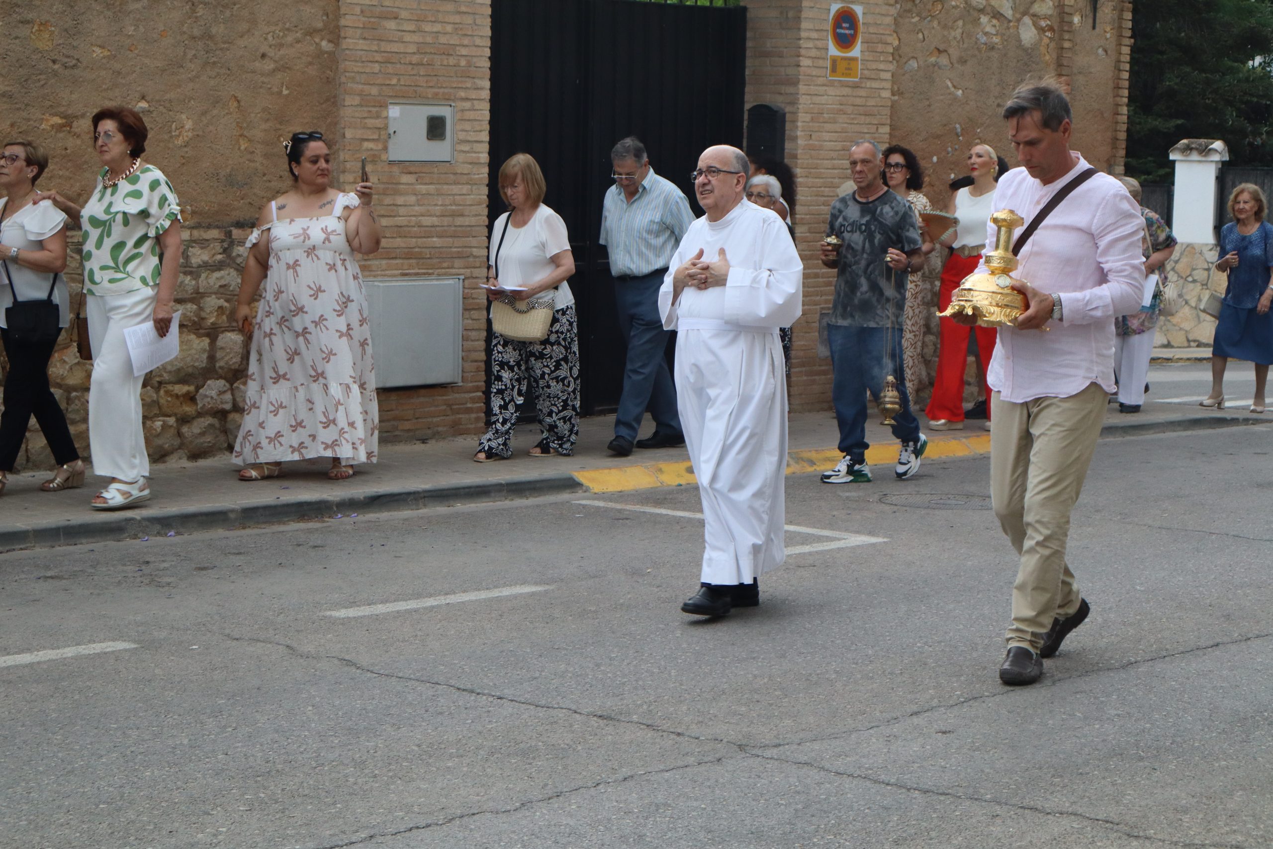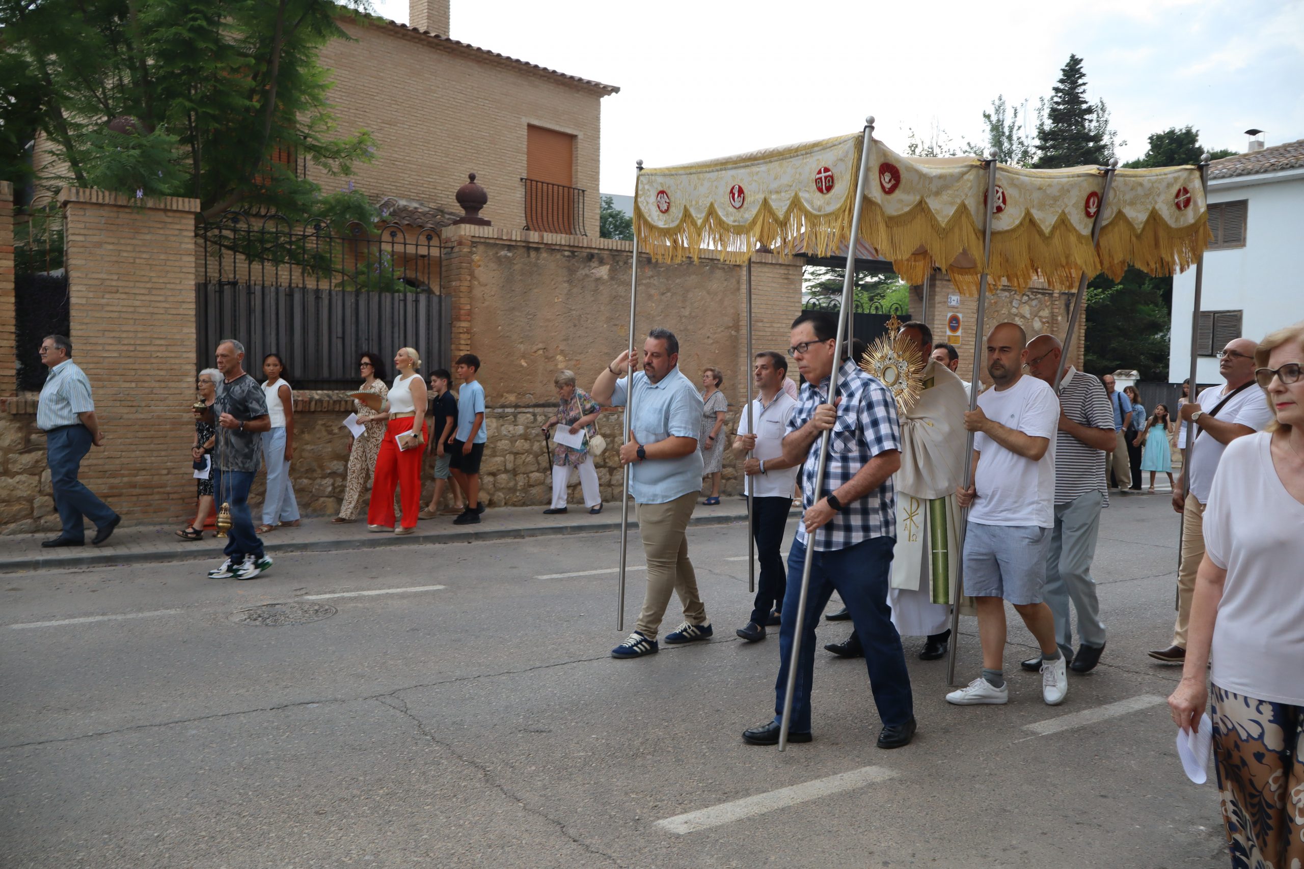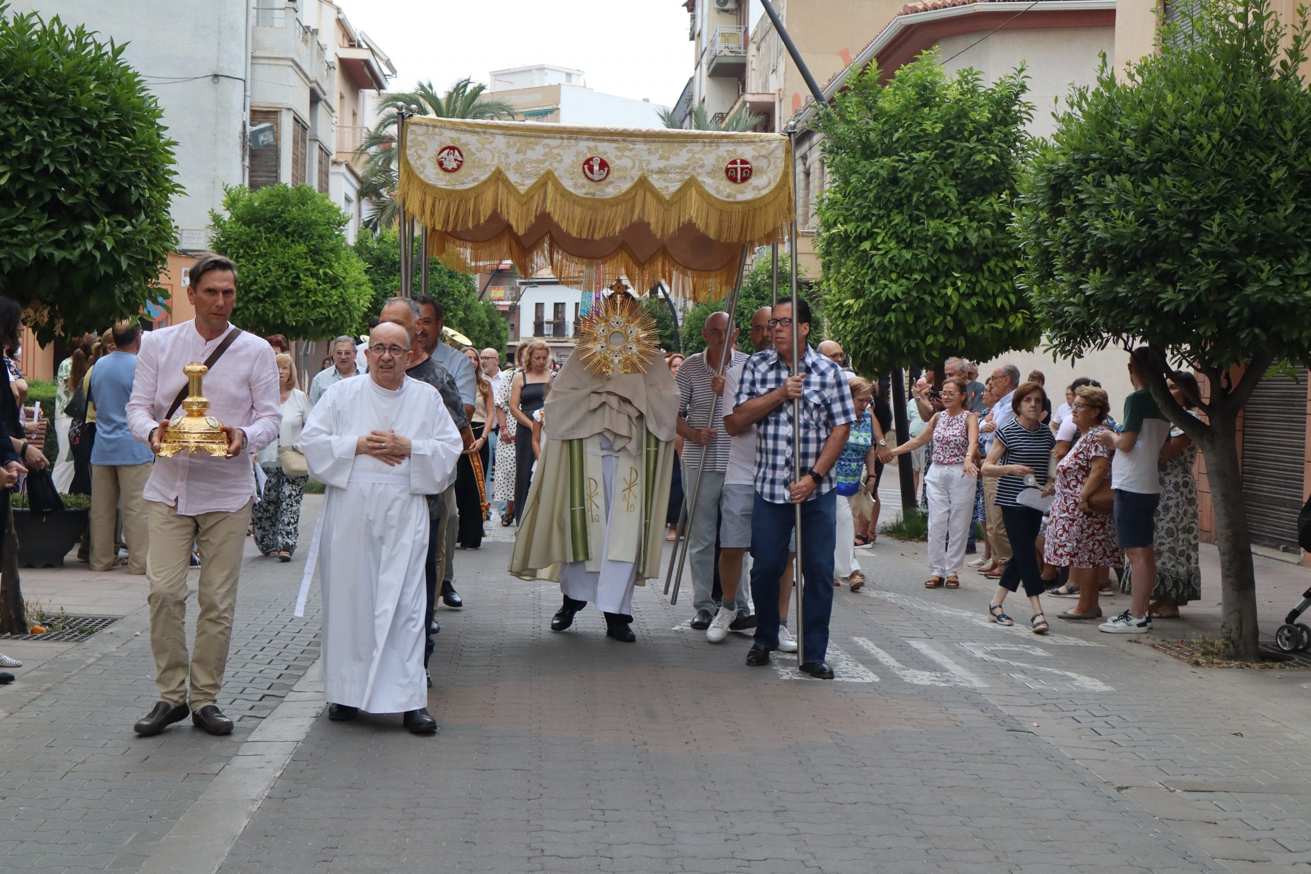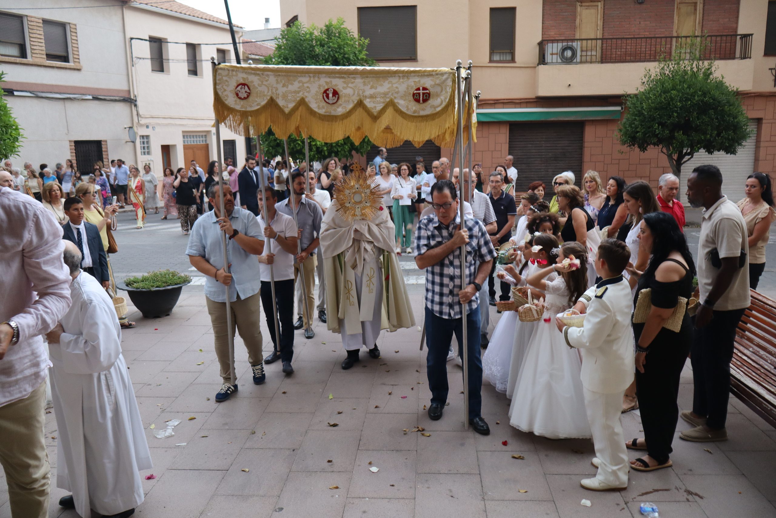 La comitiva partió con la cruz procesional, portada por Pepe, sacristán de la parroquia anfitriona. Le seguían los niños y niñas de ambas parroquias que este año han recibido su Primera Comunión, acompañados por familiares y fieles. La Custodia, que contenía el Santísimo Sacramento, fue llevada bajo palio por varios padres de los niños, y sostenida por el párroco Enrique Boronat. Durante todo el recorrido, el incensario estuvo a cargo de Luis Carrascosa, sacristán de la parroquia San Pedro Apóstol.
