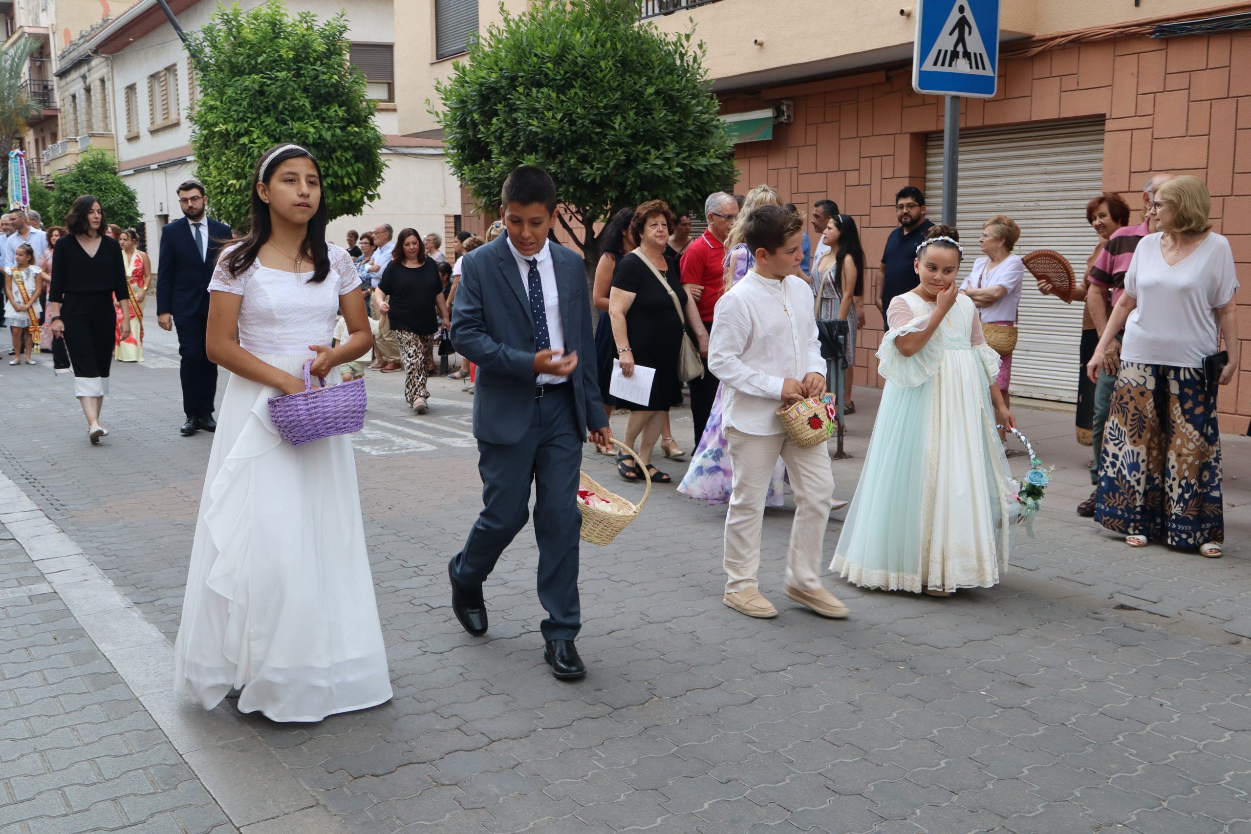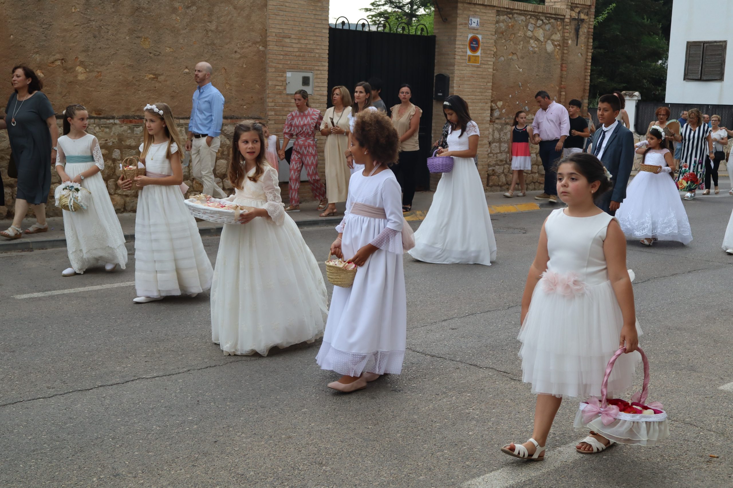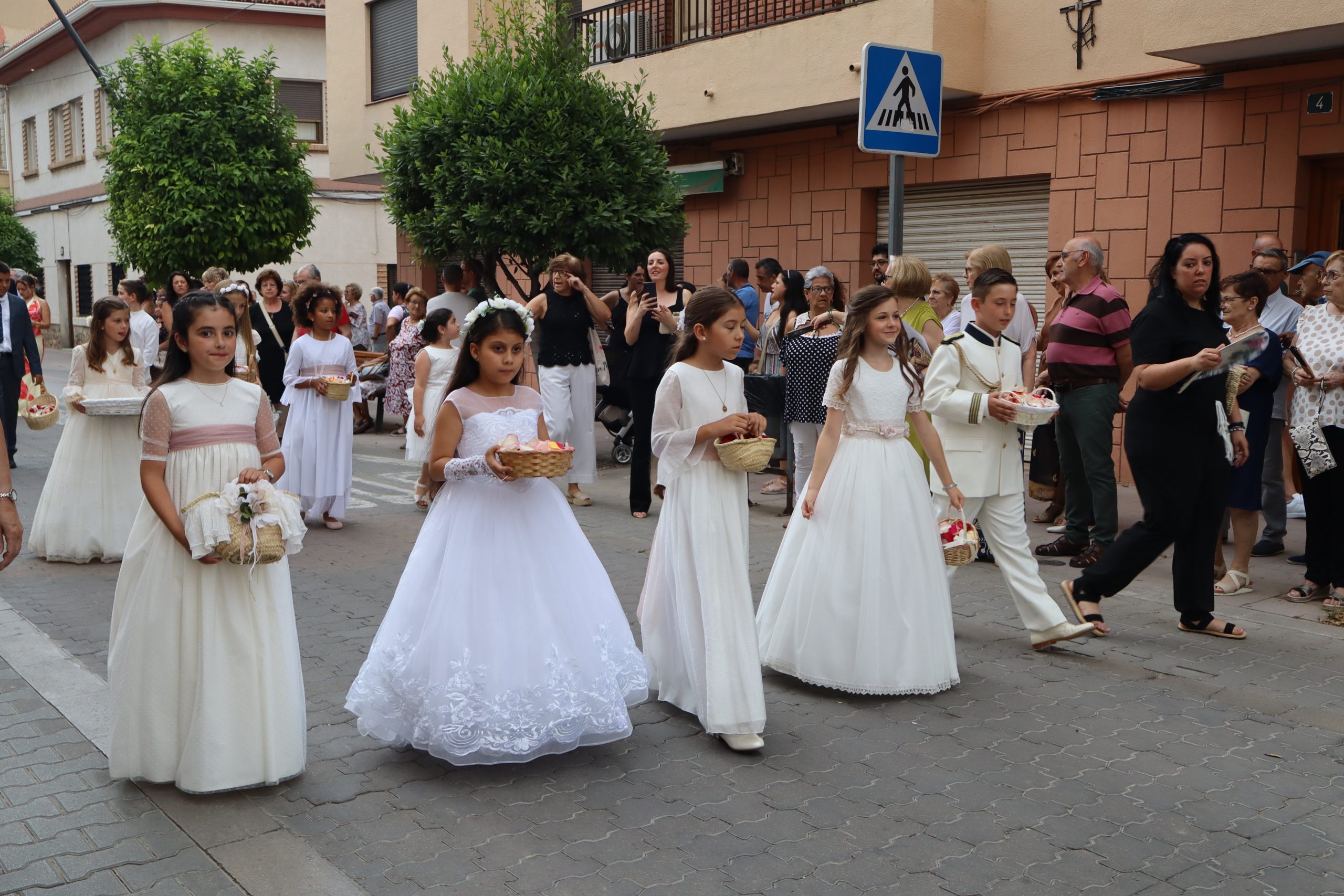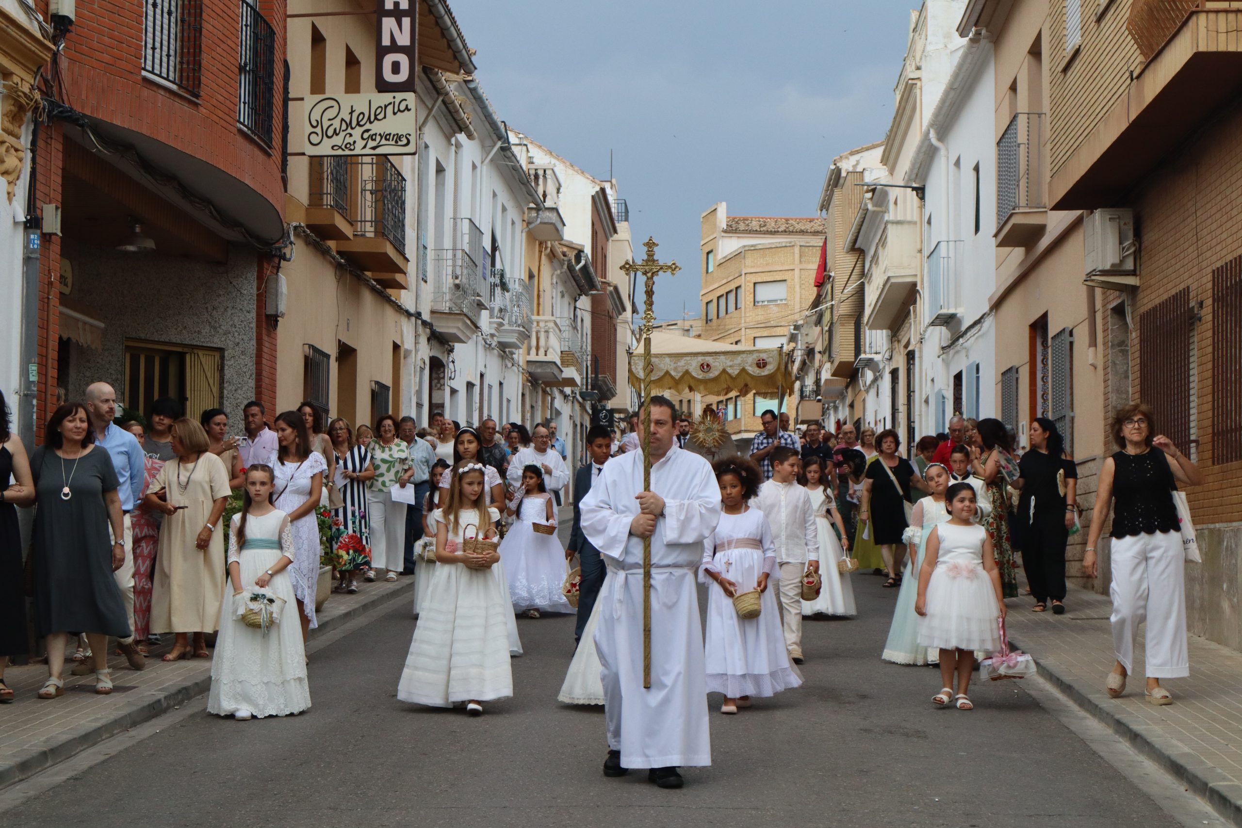 La comitiva partió con la cruz procesional, portada por Pepe, sacristán de la parroquia anfitriona. Le seguían los niños y niñas de ambas parroquias que este año han recibido su Primera Comunión, acompañados por familiares y fieles. La Custodia, que contenía el Santísimo Sacramento, fue llevada bajo palio por varios padres de los niños, y sostenida por el párroco Enrique Boronat. Durante todo el recorrido, el incensario estuvo a cargo de Luis Carrascosa, sacristán de la parroquia San Pedro Apóstol.