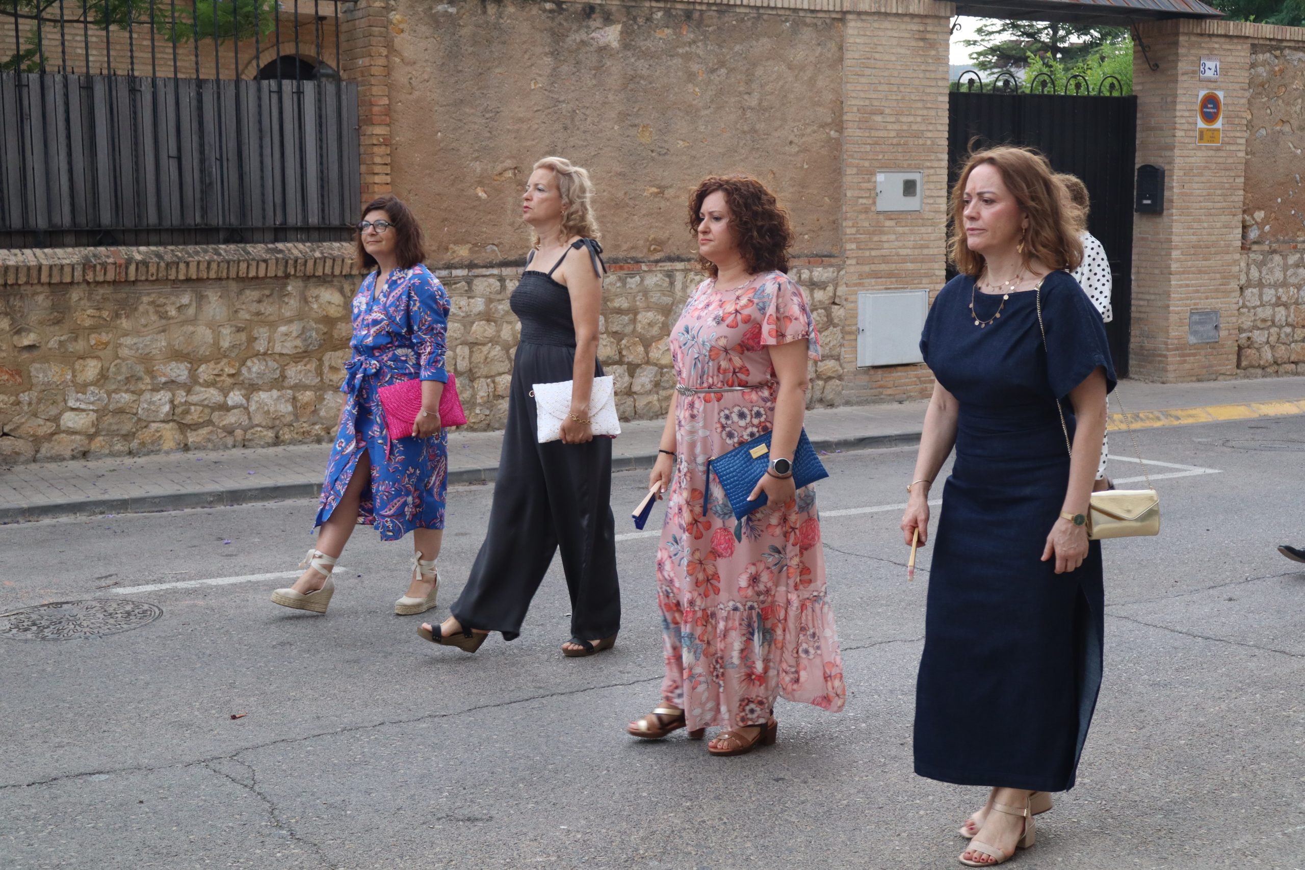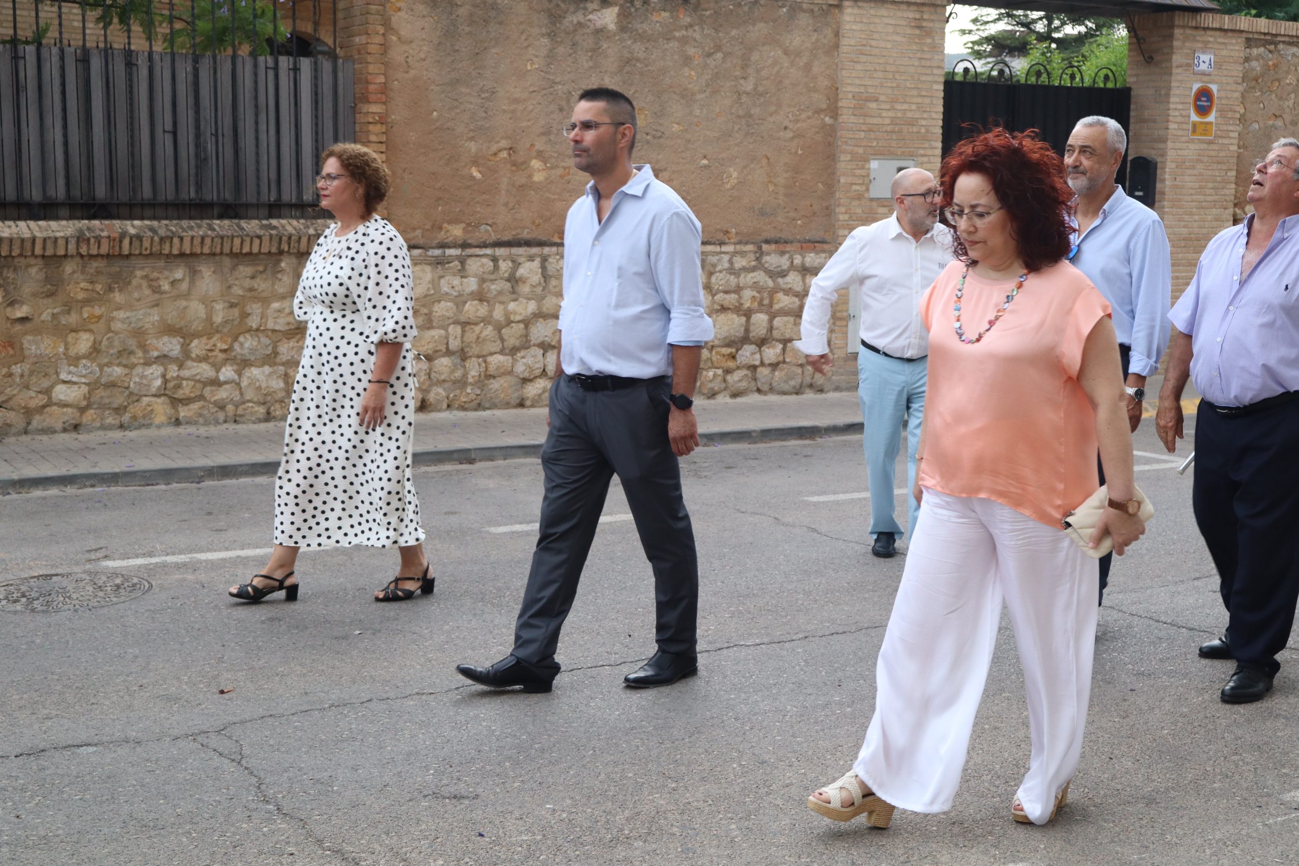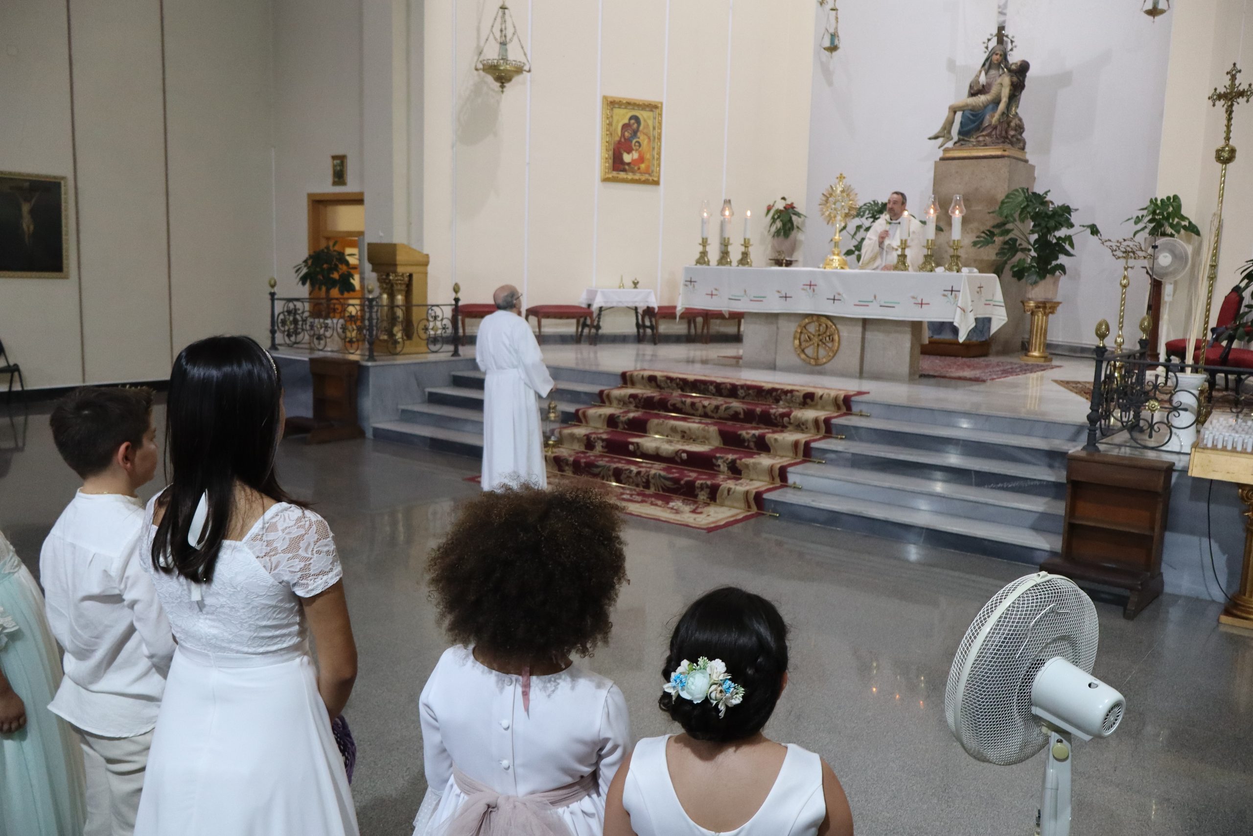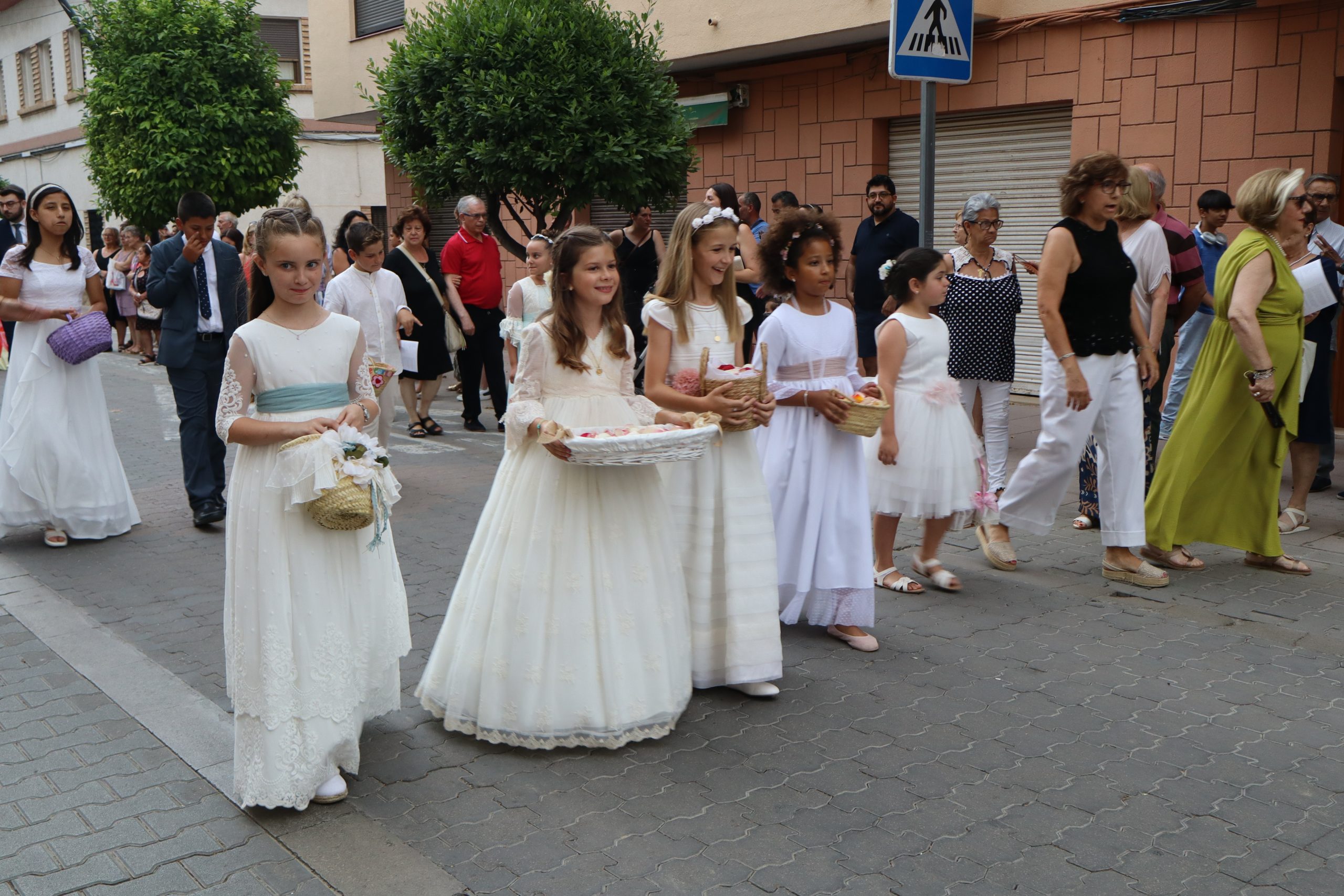 La comitiva partió con la cruz procesional, portada por Pepe, sacristán de la parroquia anfitriona. Le seguían los niños y niñas de ambas parroquias que este año han recibido su Primera Comunión, acompañados por familiares y fieles. La Custodia, que contenía el Santísimo Sacramento, fue llevada bajo palio por varios padres de los niños, y sostenida por el párroco Enrique Boronat. Durante todo el recorrido, el incensario estuvo a cargo de Luis Carrascosa, sacristán de la parroquia San Pedro Apóstol.