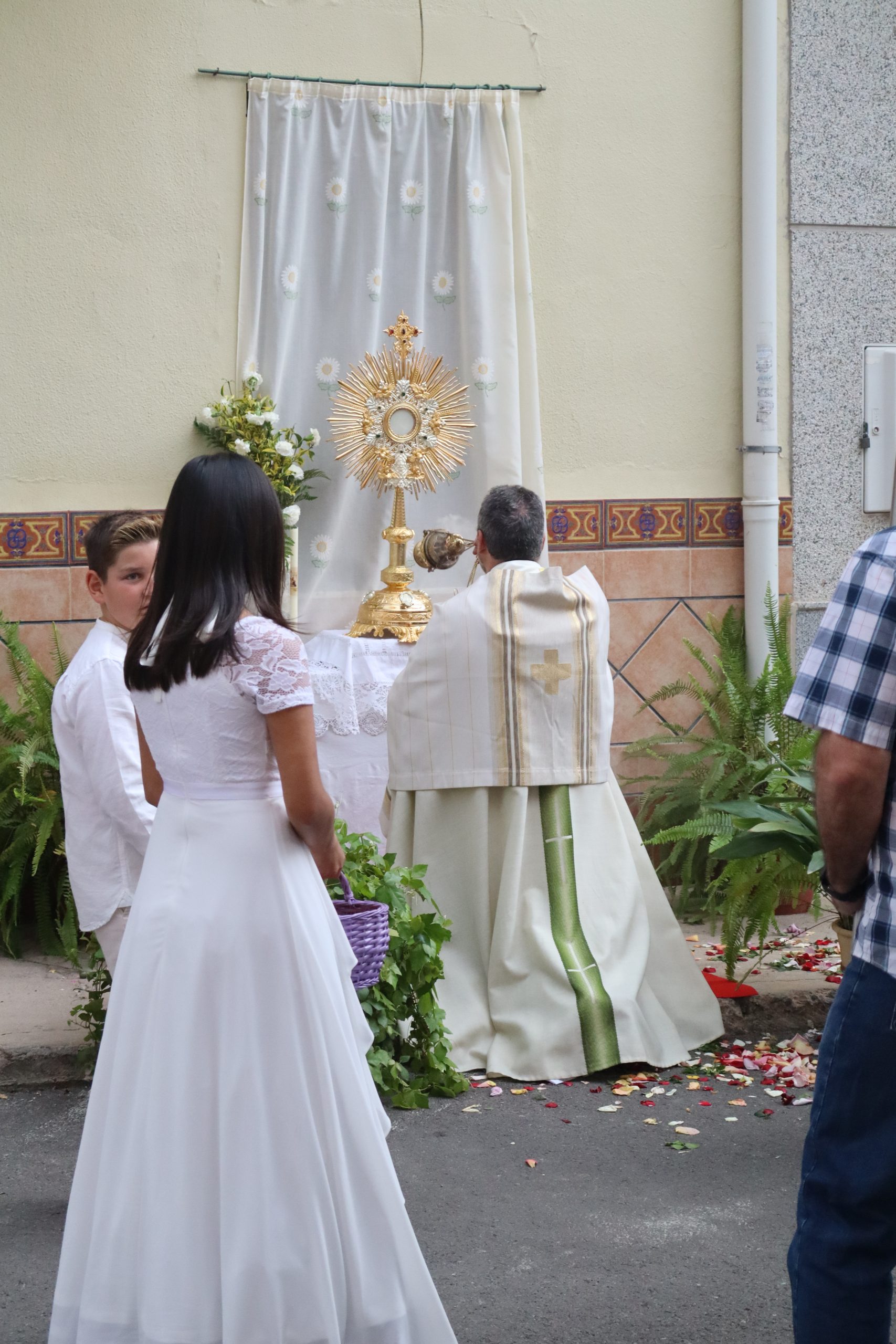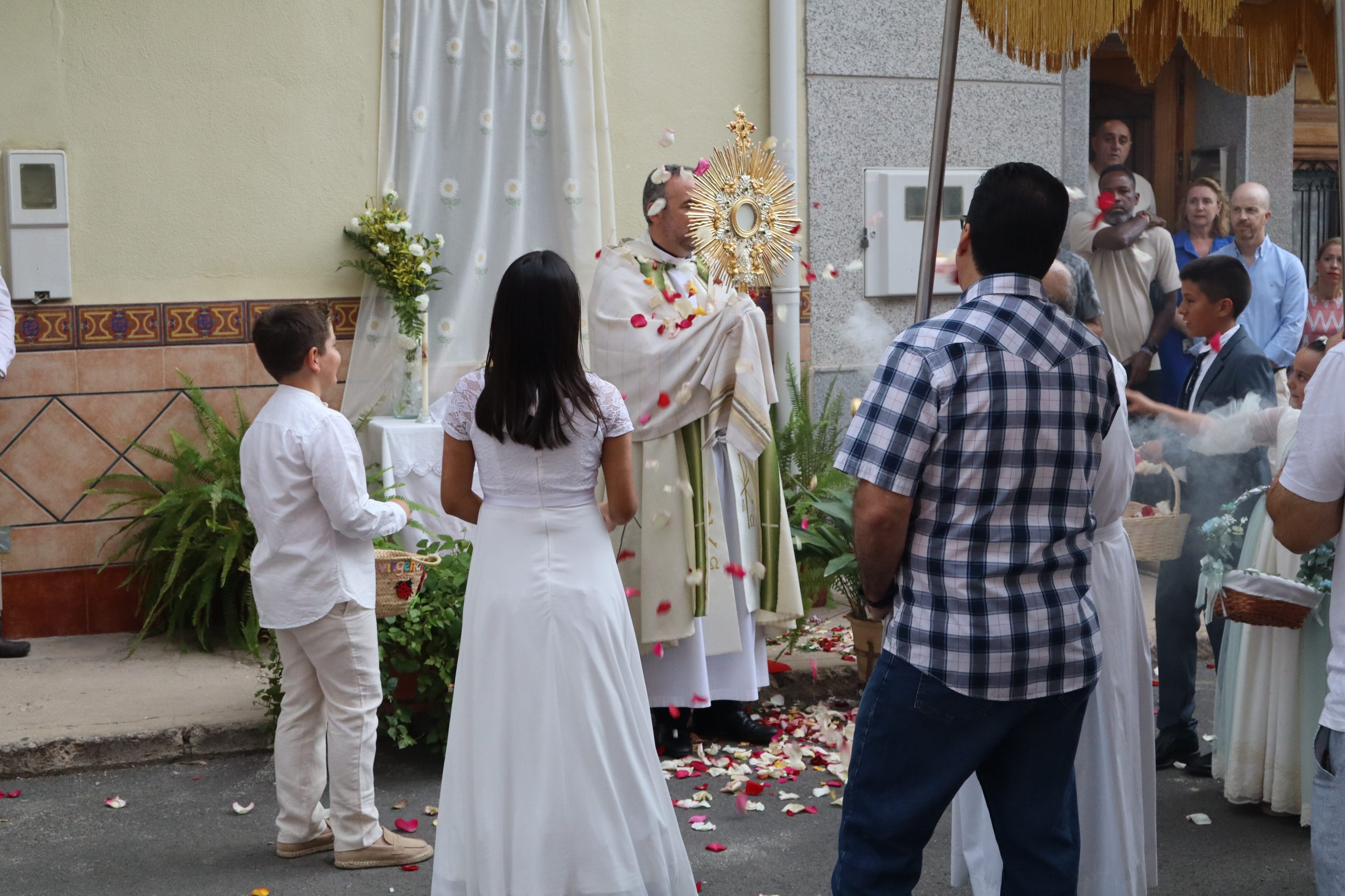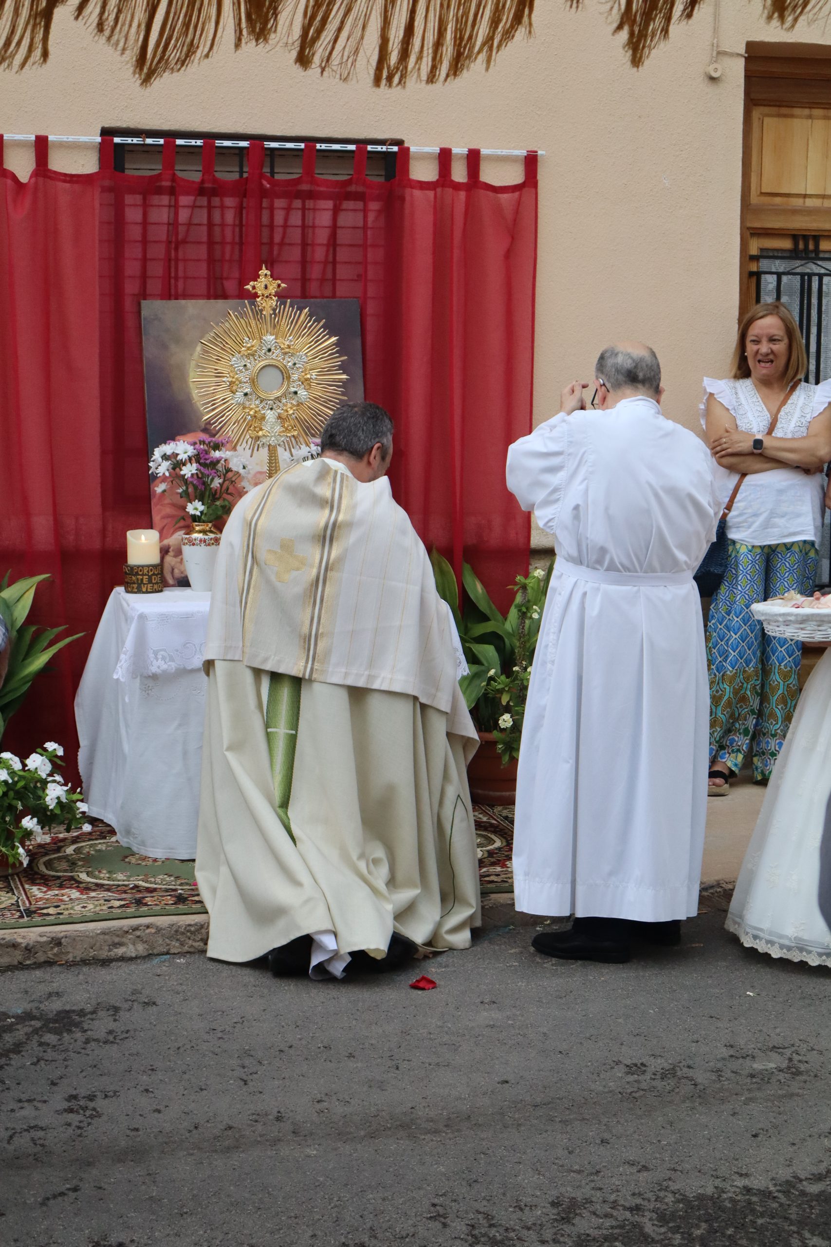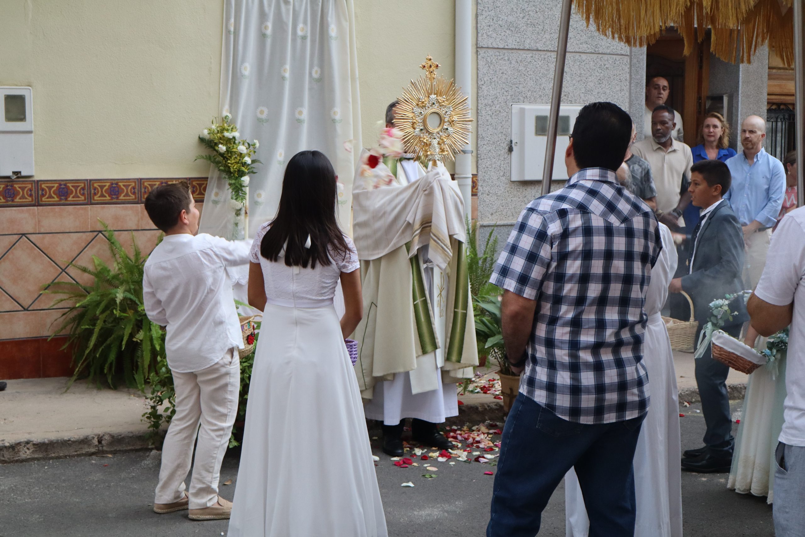 La procesión se detuvo en varios altares montados en las puertas de viviendas, preparados por los propios vecinos. En cada parada, el sacerdote alzaba la Custodia para bendecir a los presentes, mientras los niños lanzaban pétalos de rosa como muestra de veneración.