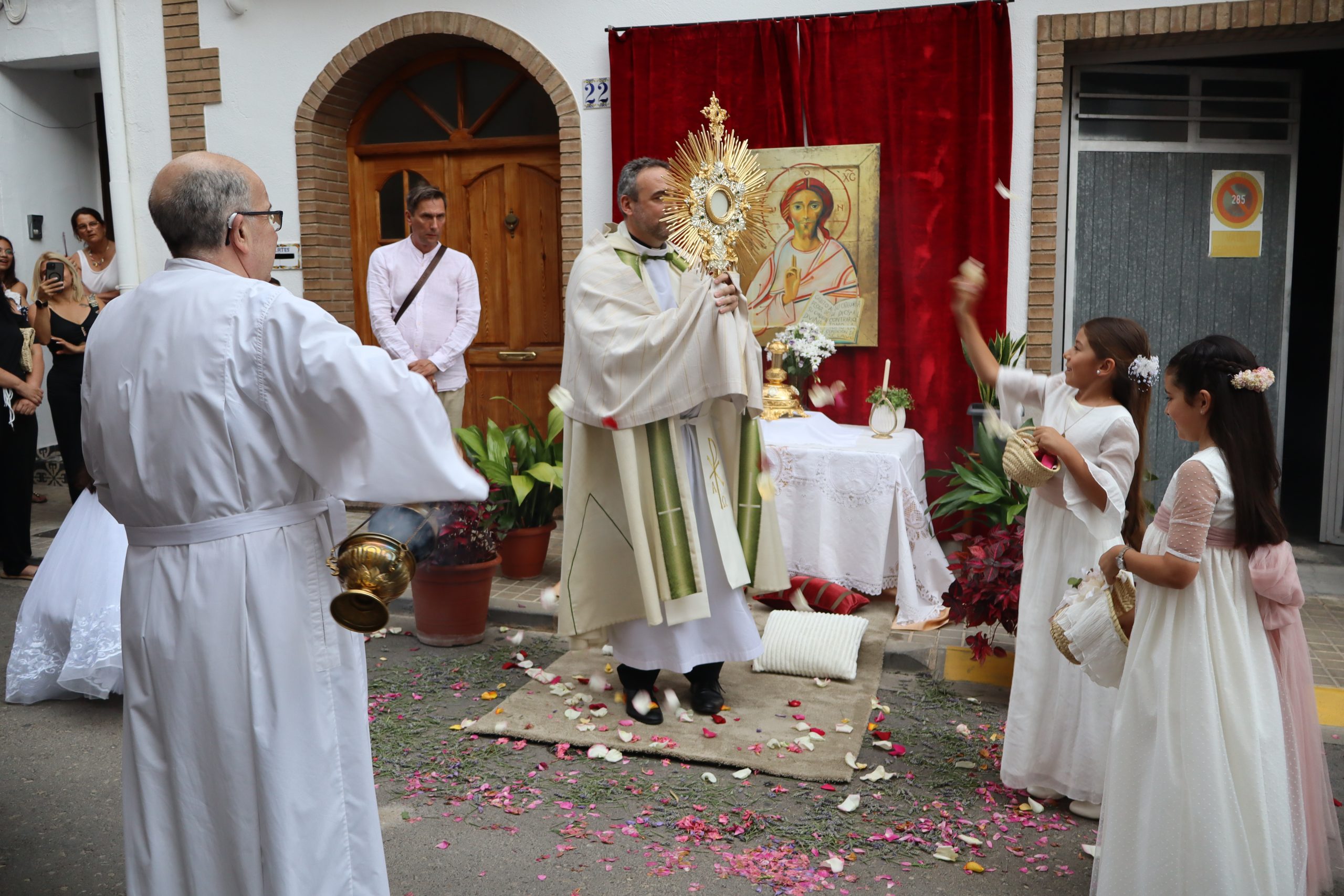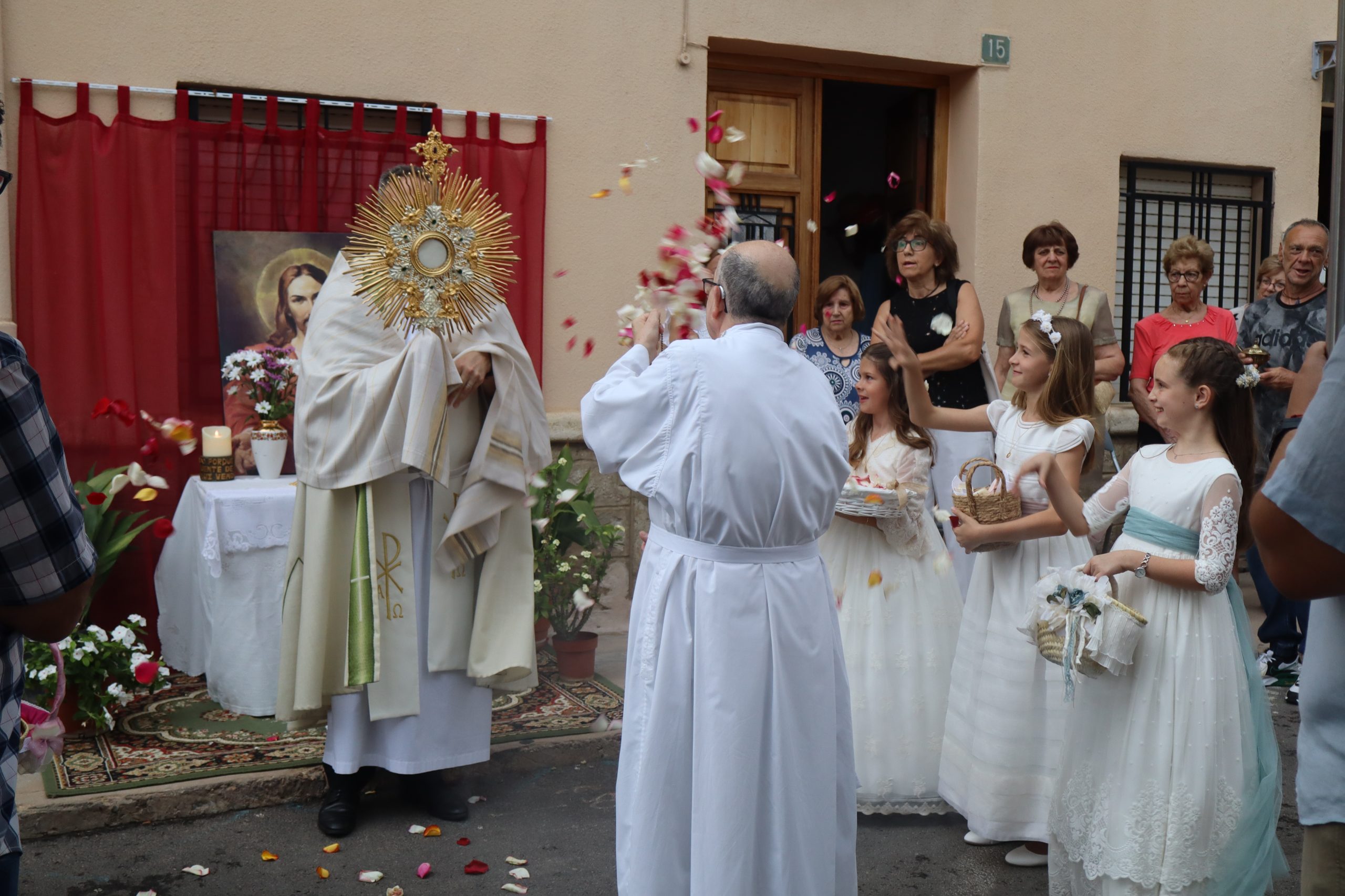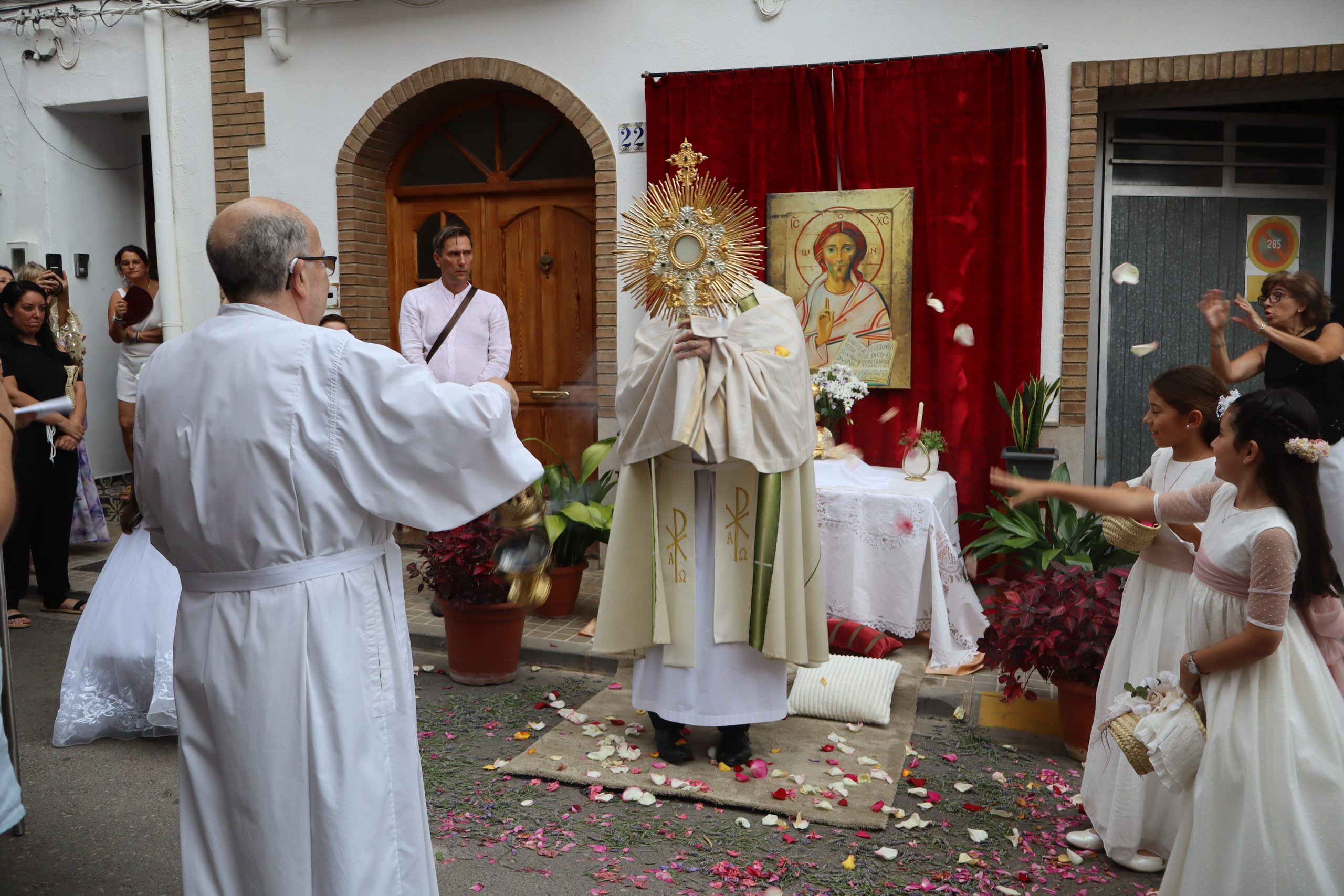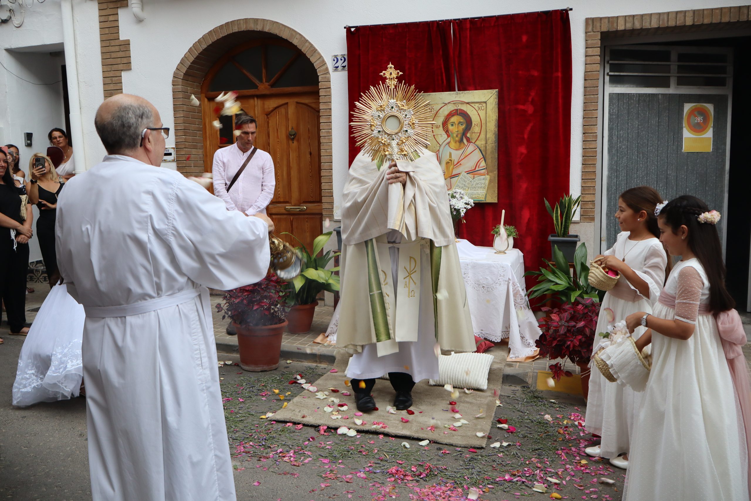 La procesión se detuvo en varios altares montados en las puertas de viviendas, preparados por los propios vecinos. En cada parada, el sacerdote alzaba la Custodia para bendecir a los presentes, mientras los niños lanzaban pétalos de rosa como muestra de veneración.