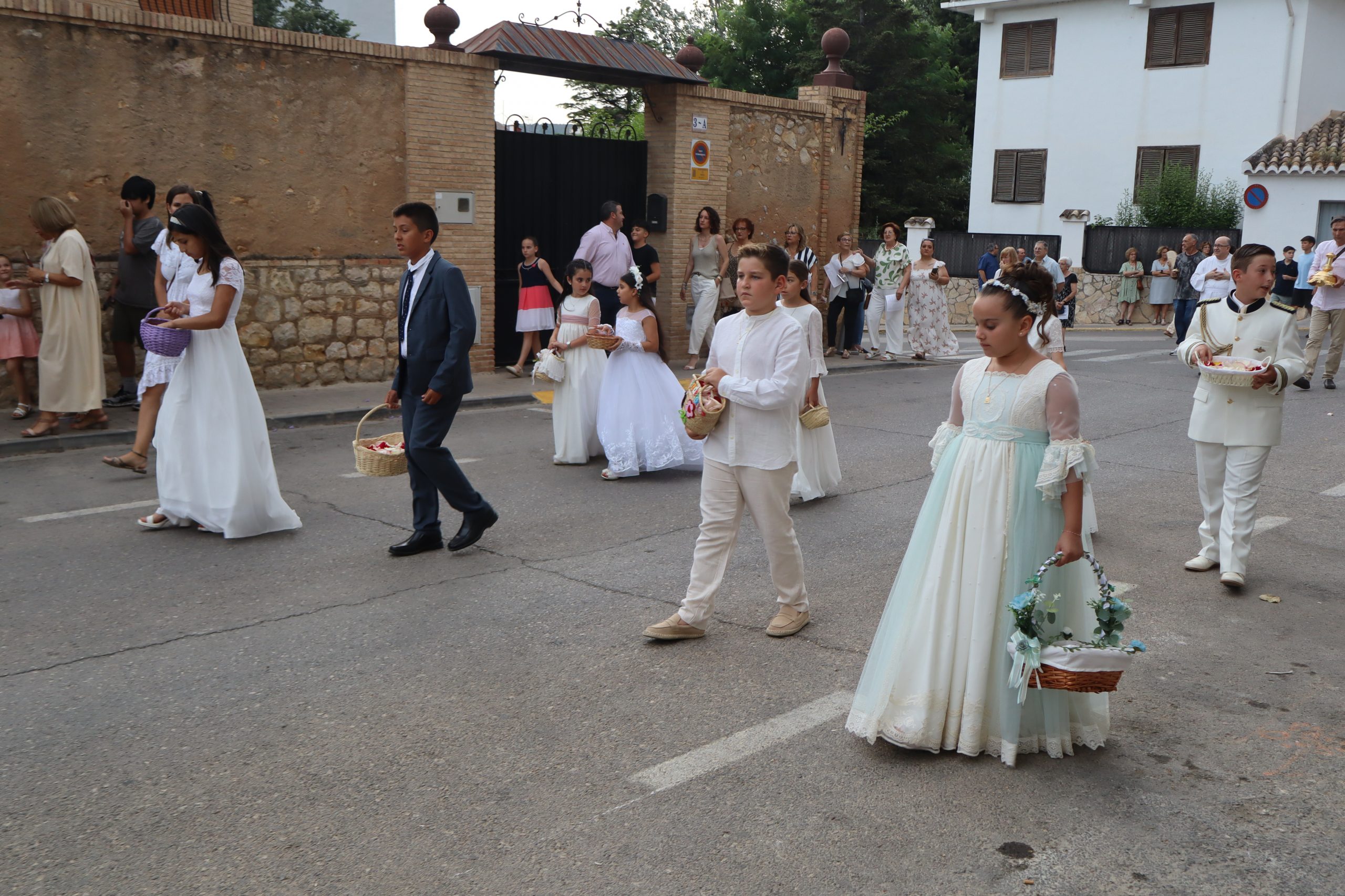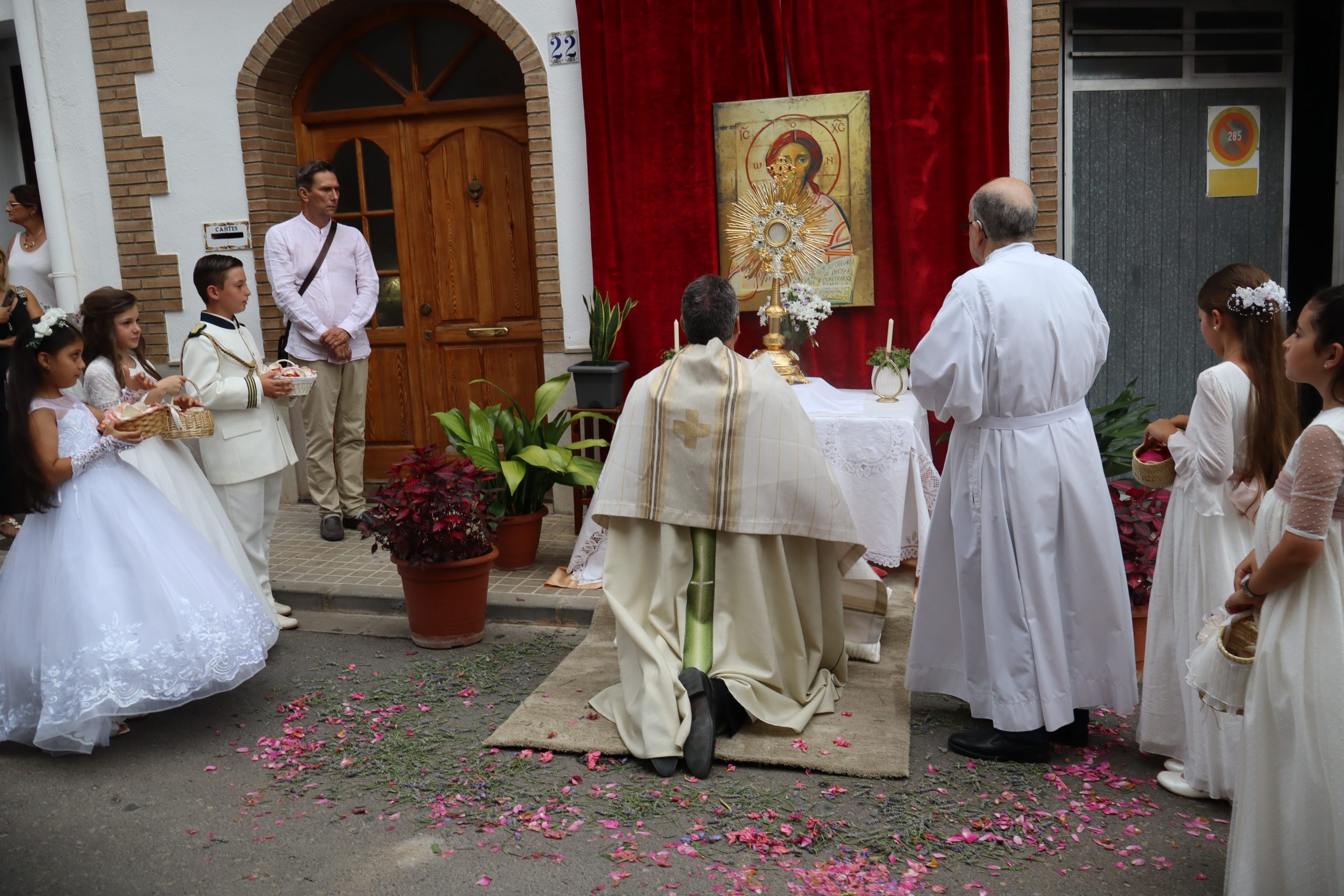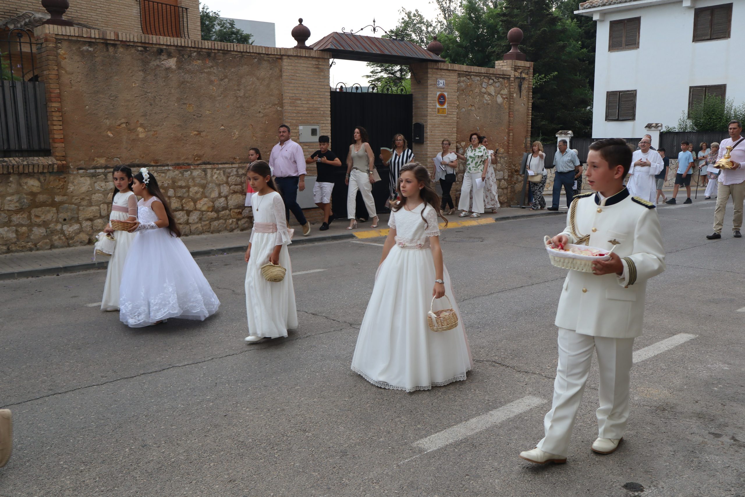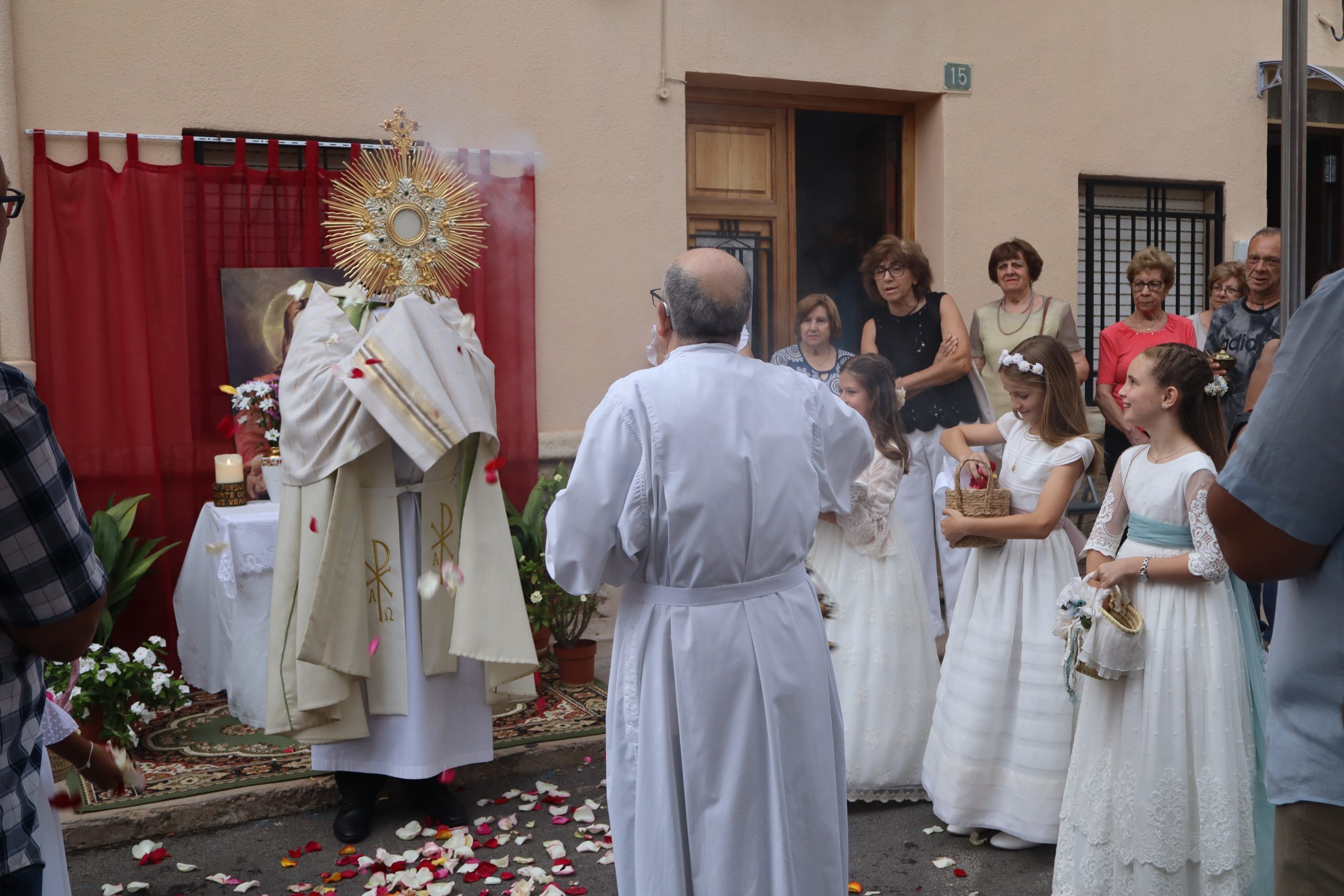 La procesión se detuvo en varios altares montados en las puertas de viviendas, preparados por los propios vecinos. En cada parada, el sacerdote alzaba la Custodia para bendecir a los presentes, mientras los niños lanzaban pétalos de rosa como muestra de veneración.