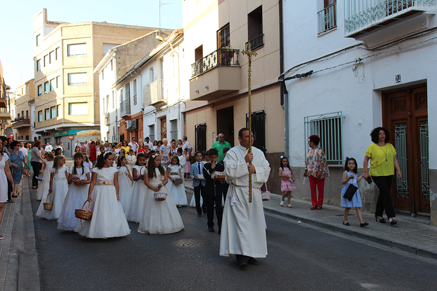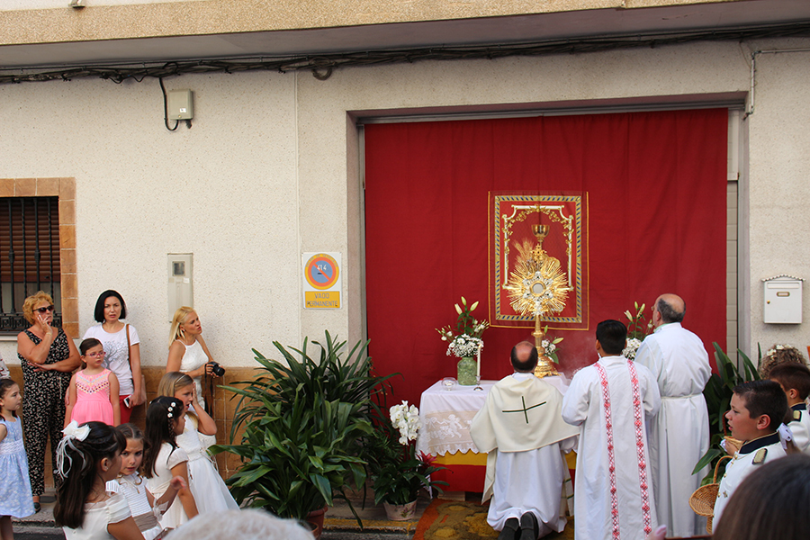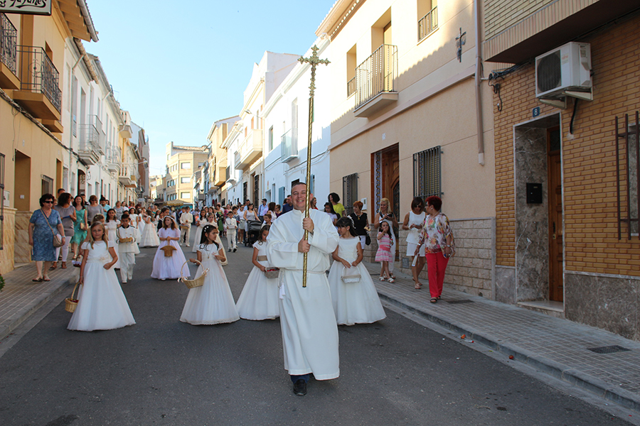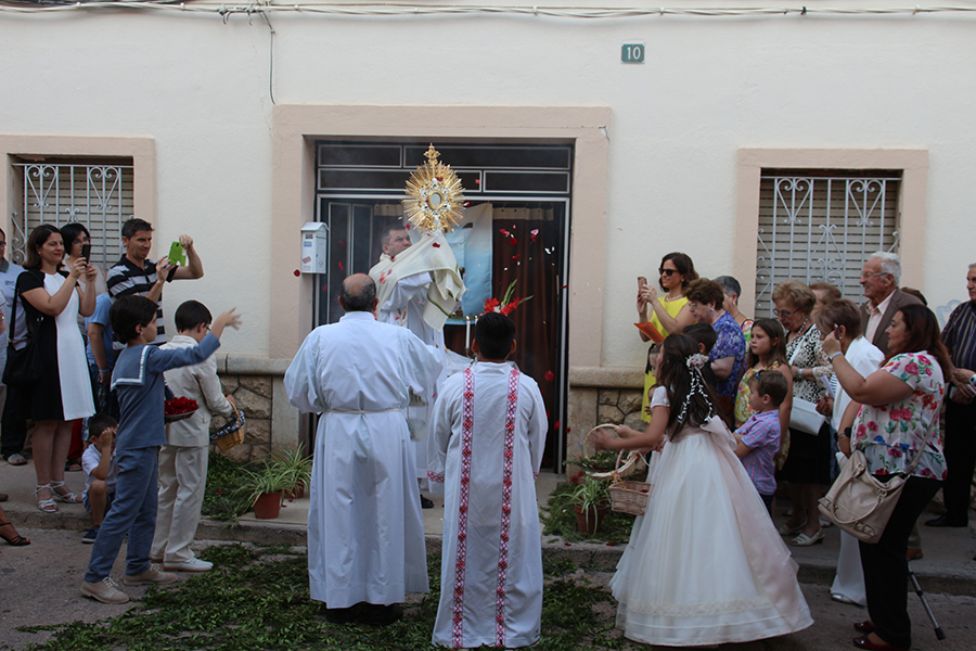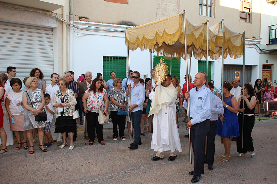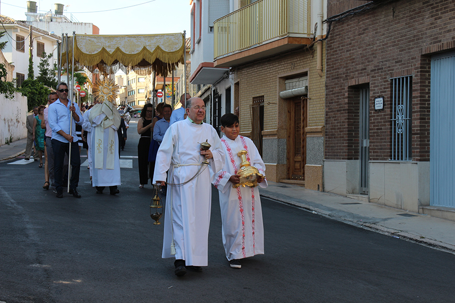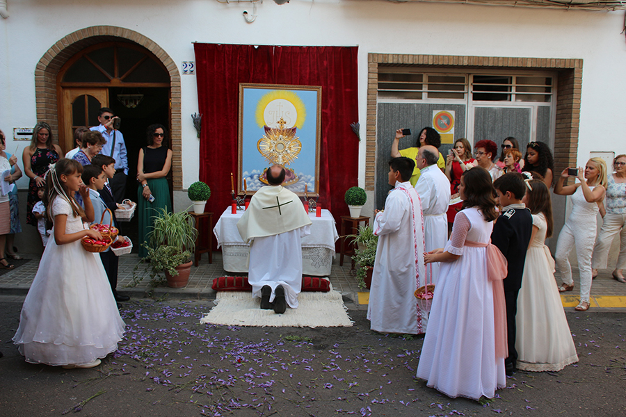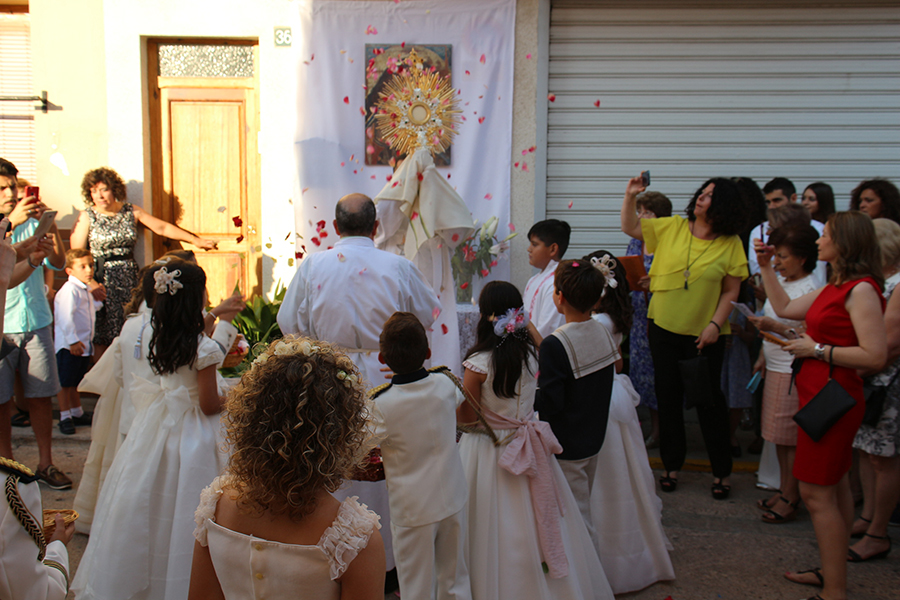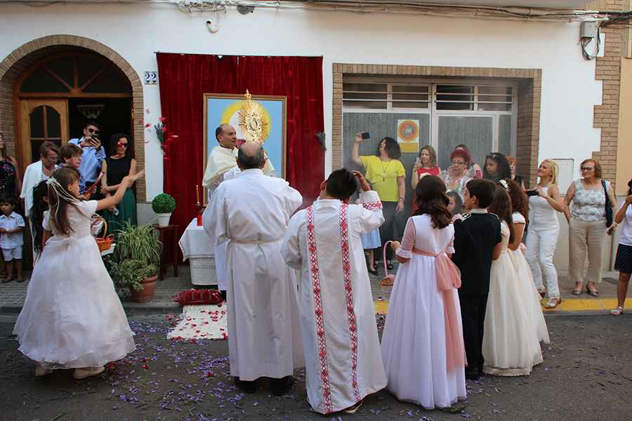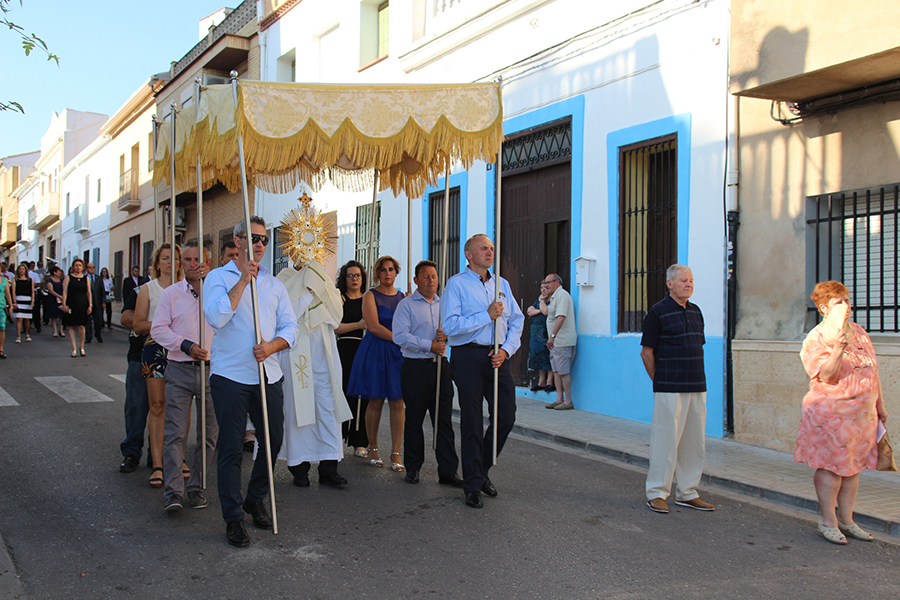 Portaron la Custodia el sarcedotes de la localidad, Jose Vicente Martínez Muedra y el vicario parroquial, Alirios, bajo palio, llevado por varios padres de lo niños y niñas que este año tomaron su primera comunión, y que se encargaron de tirar una lluvia de pétalos a la Custodia. Cerraba la comitiva la banda de la S.M. la Artística.