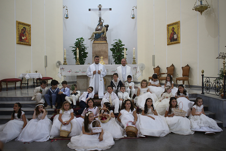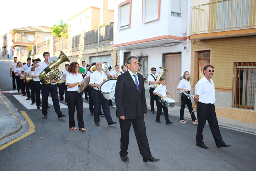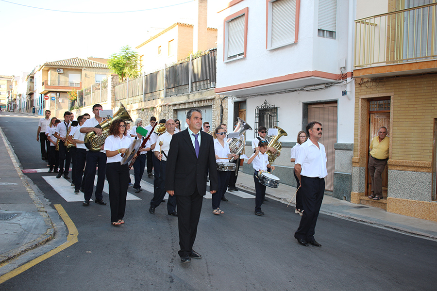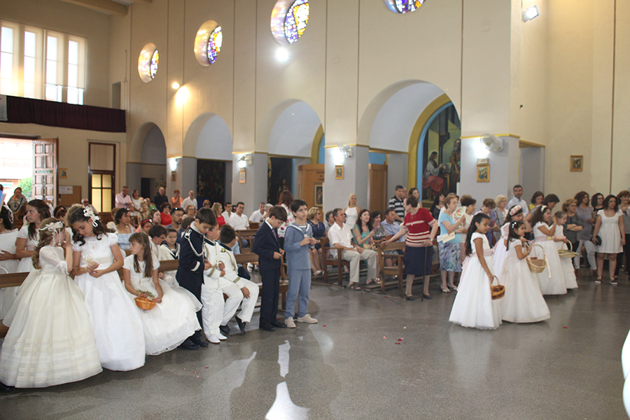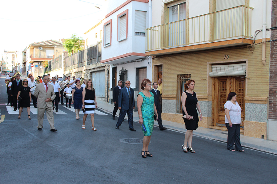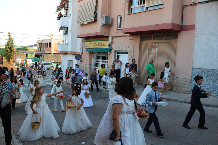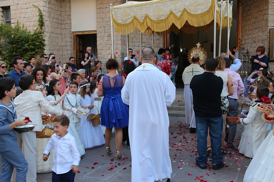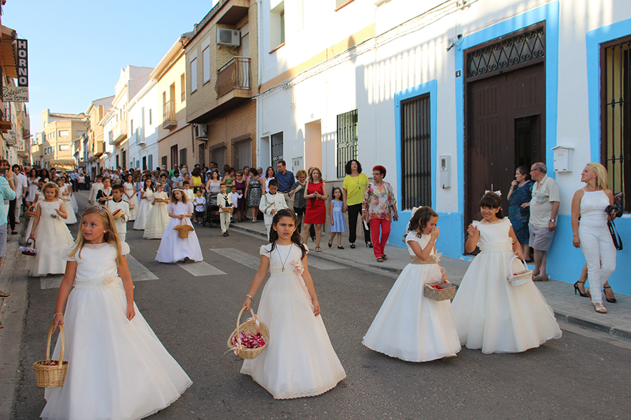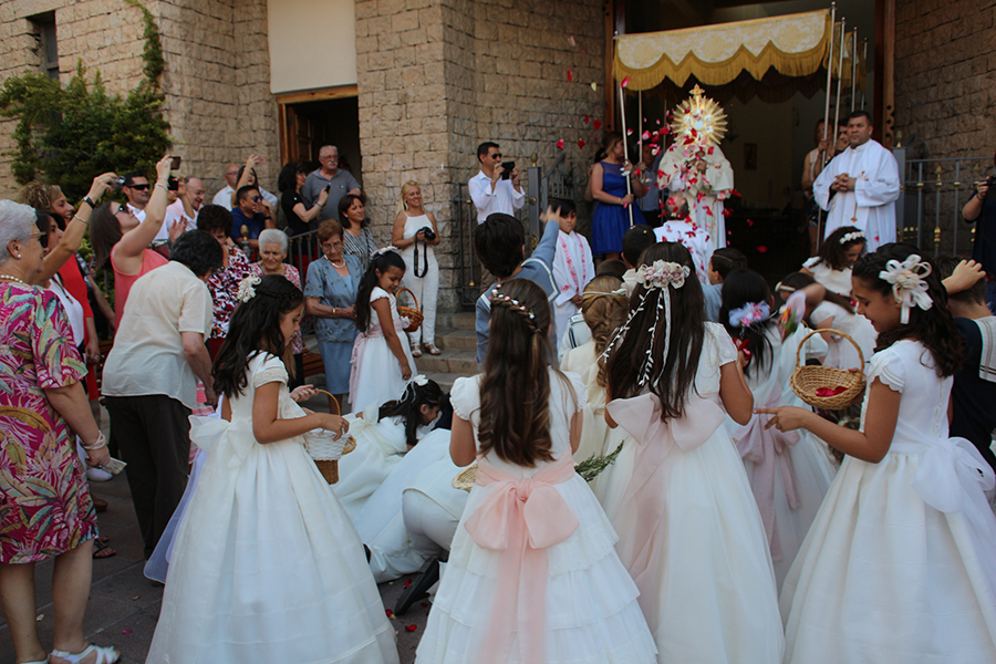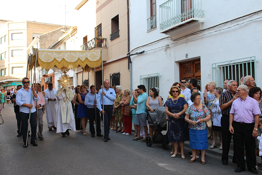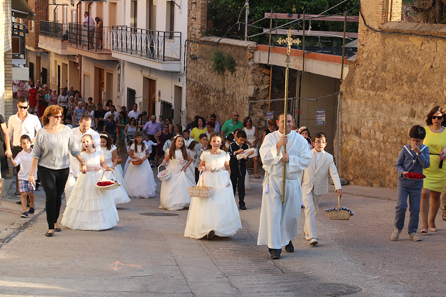 Portaron la Custodia el sarcedotes de la localidad, Jose Vicente Martínez Muedra y el vicario parroquial, Alirios, bajo palio, llevado por varios padres de lo niños y niñas que este año tomaron su primera comunión, y que se encargaron de tirar una lluvia de pétalos a la Custodia. Cerraba la comitiva la banda de la S.M. la Artística.