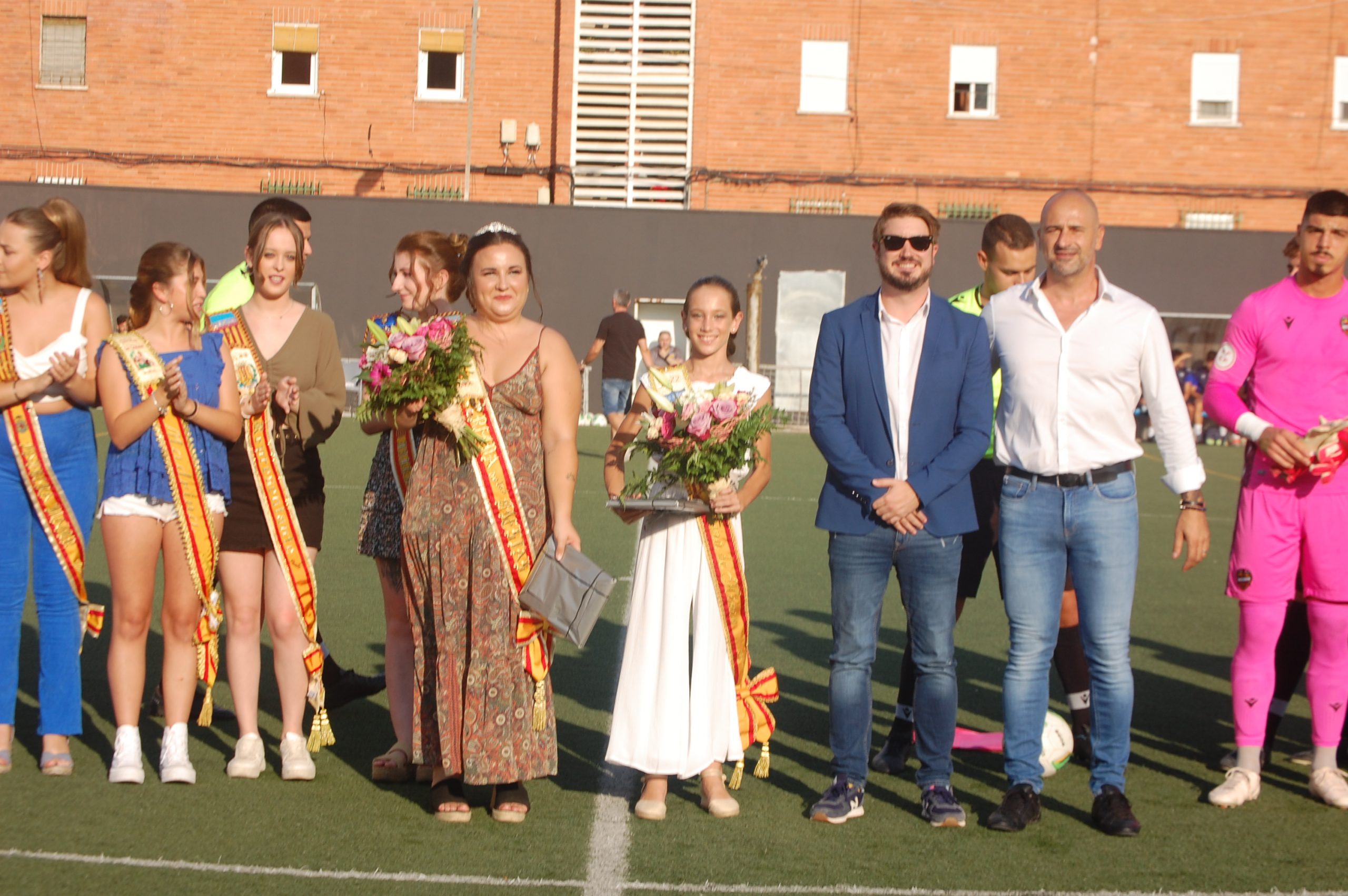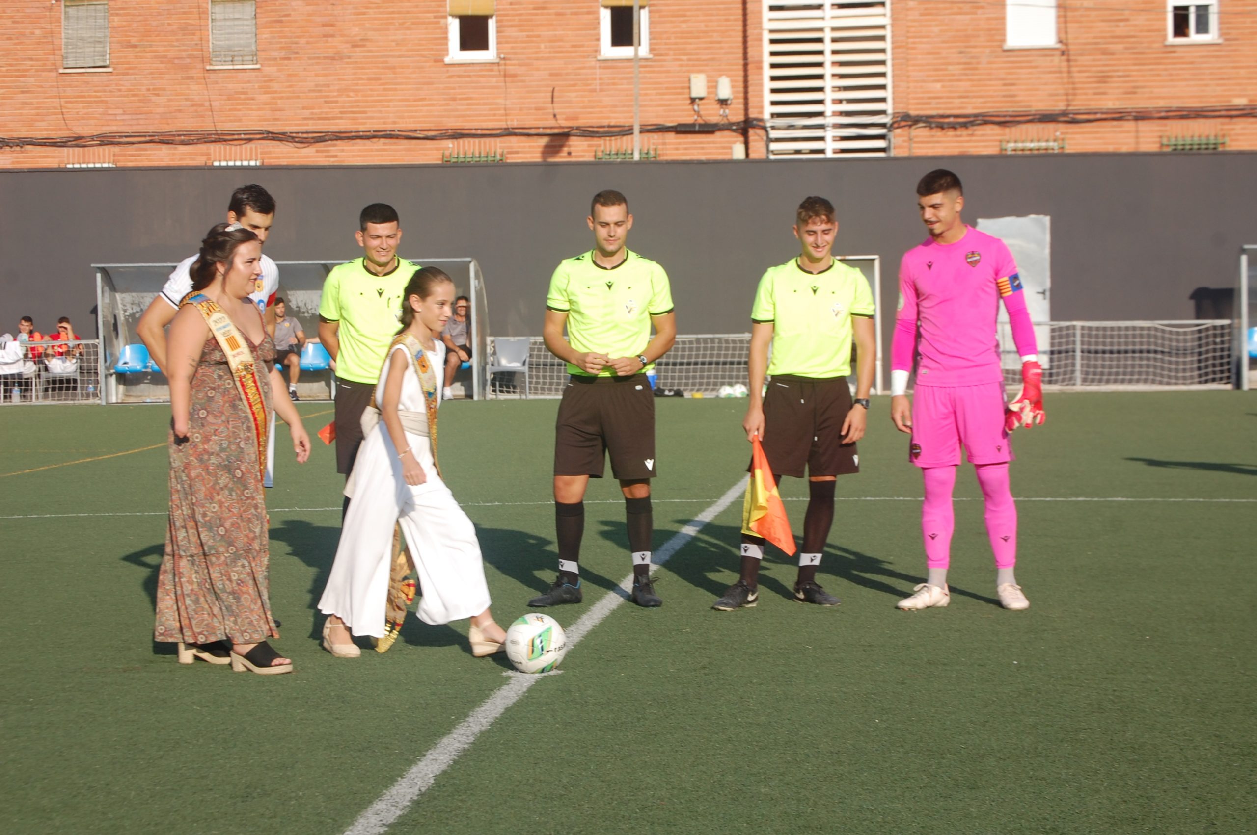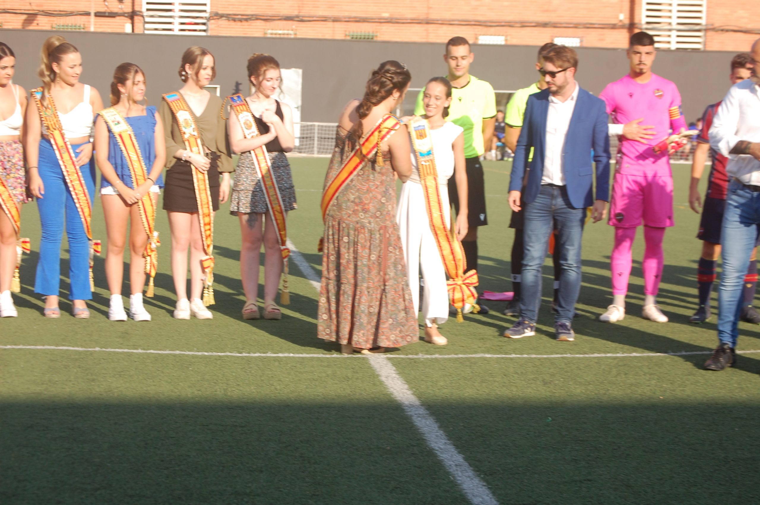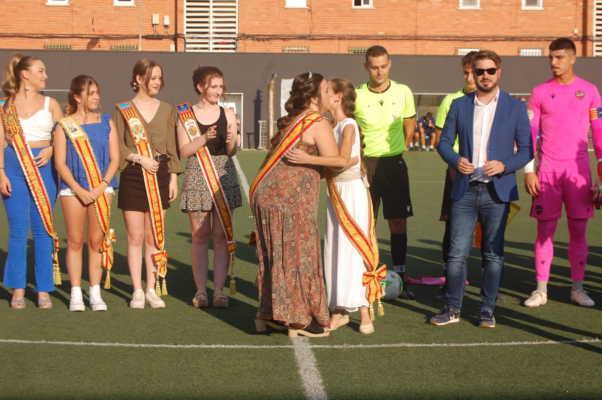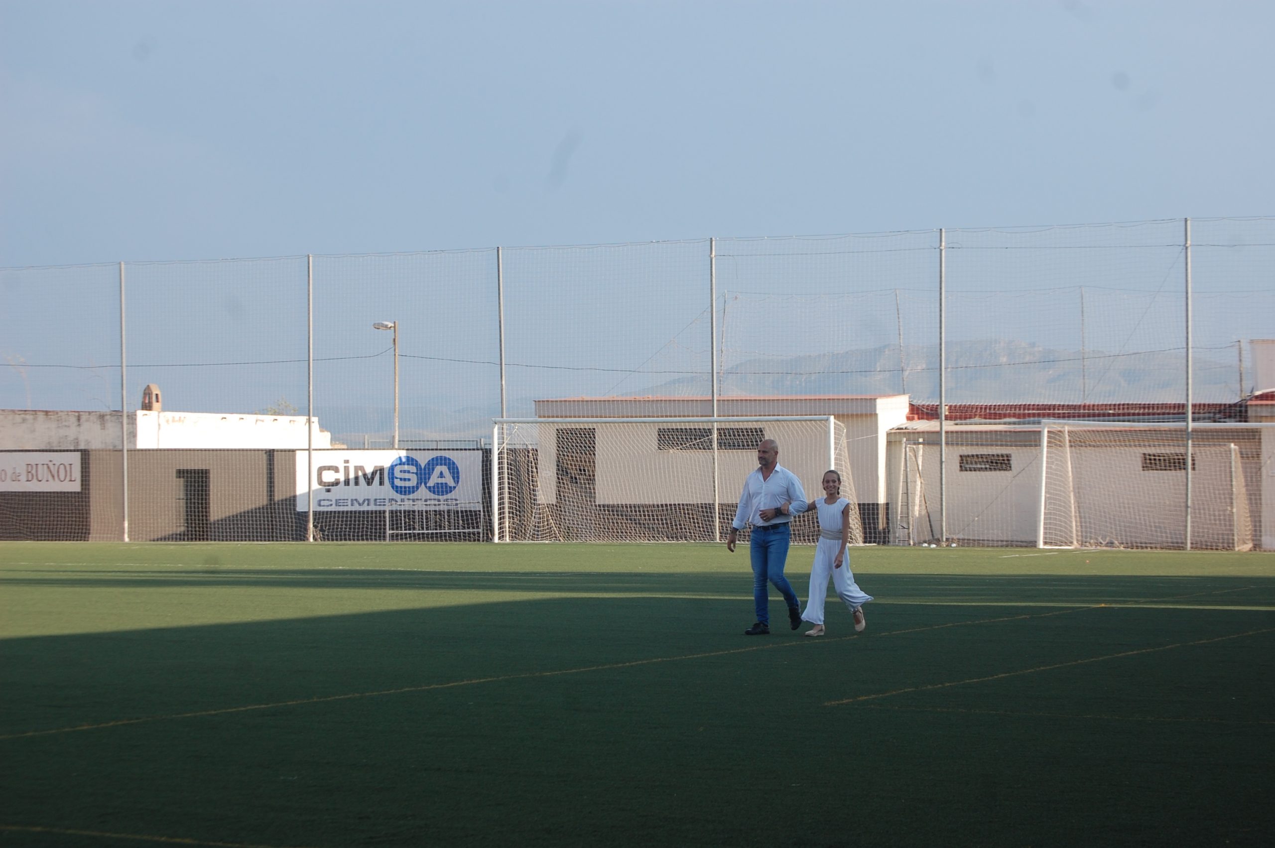 Redacción.- La Reina de la Feria y Fiestas de Buñol, Regina Martínez, ha realizado el saque de honor en la previa del partido que ha enfrentado al Club Deportivo Buñol ante el Atlético Levante. Este choque tenía que haber sido el de la presentación del club blanco, pero la entidad ha decidido -debido a la pequeña tormenta que cayó- aplazarla hasta el próximo choque que el primer equipo dispute en el Beltrán Báguena. Lo que sí ha aprovechado la primera plantilla es para hacerse la foto de familia junto a la Reina de las Fiestas, su Corte de Honor y parte de la corporación municipal. Además, la representante del CD Buñol y compañera de corte, le ha hecho entrega de un ramo de flores a Regina.