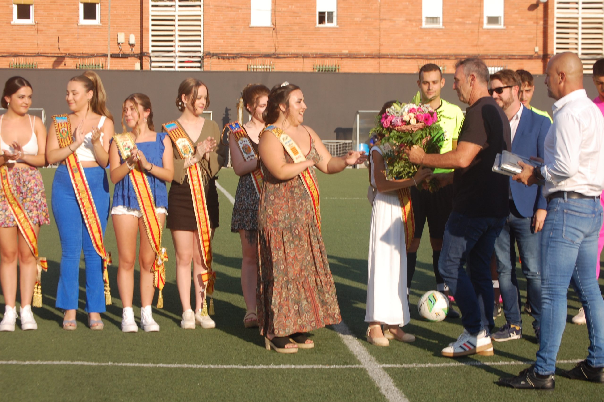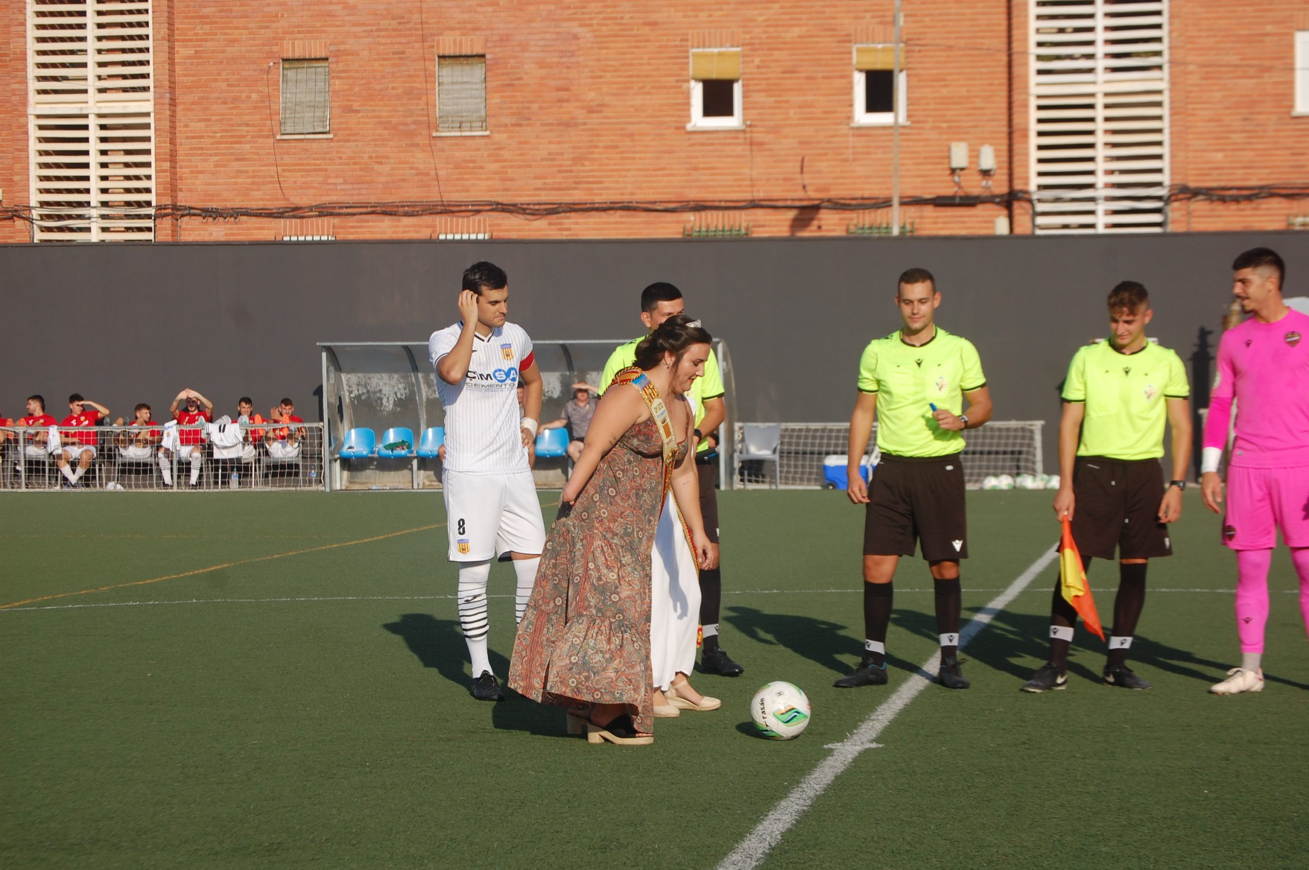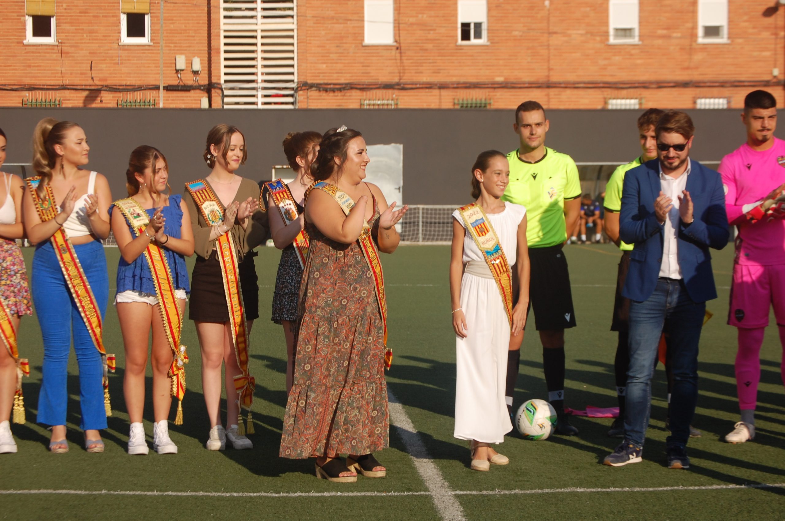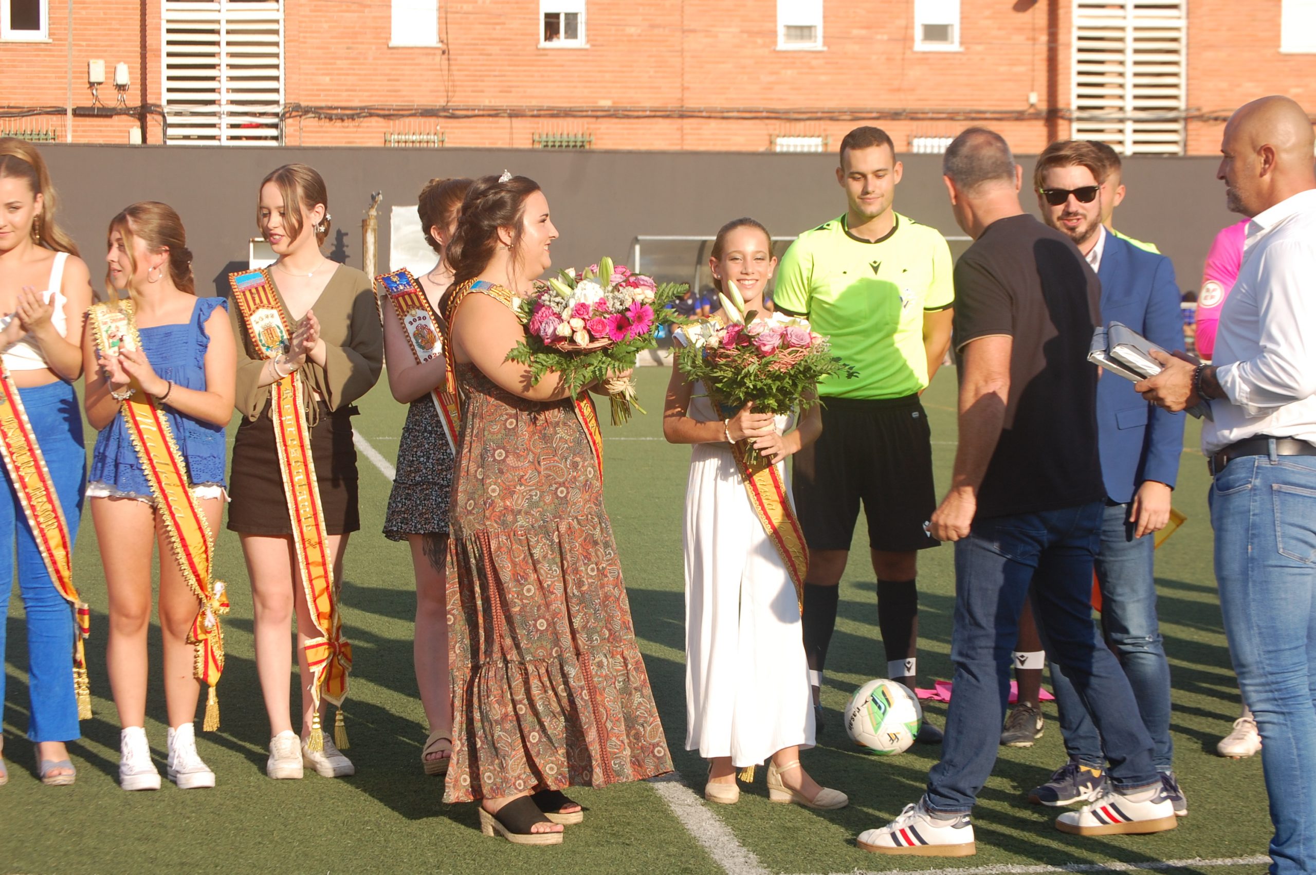 Redacción.- La Reina de la Feria y Fiestas de Buñol, Regina Martínez, ha realizado el saque de honor en la previa del partido que ha enfrentado al Club Deportivo Buñol ante el Atlético Levante. Este choque tenía que haber sido el de la presentación del club blanco, pero la entidad ha decidido -debido a la pequeña tormenta que cayó- aplazarla hasta el próximo choque que el primer equipo dispute en el Beltrán Báguena. Lo que sí ha aprovechado la primera plantilla es para hacerse la foto de familia junto a la Reina de las Fiestas, su Corte de Honor y parte de la corporación municipal. Además, la representante del CD Buñol y compañera de corte, le ha hecho entrega de un ramo de flores a Regina.