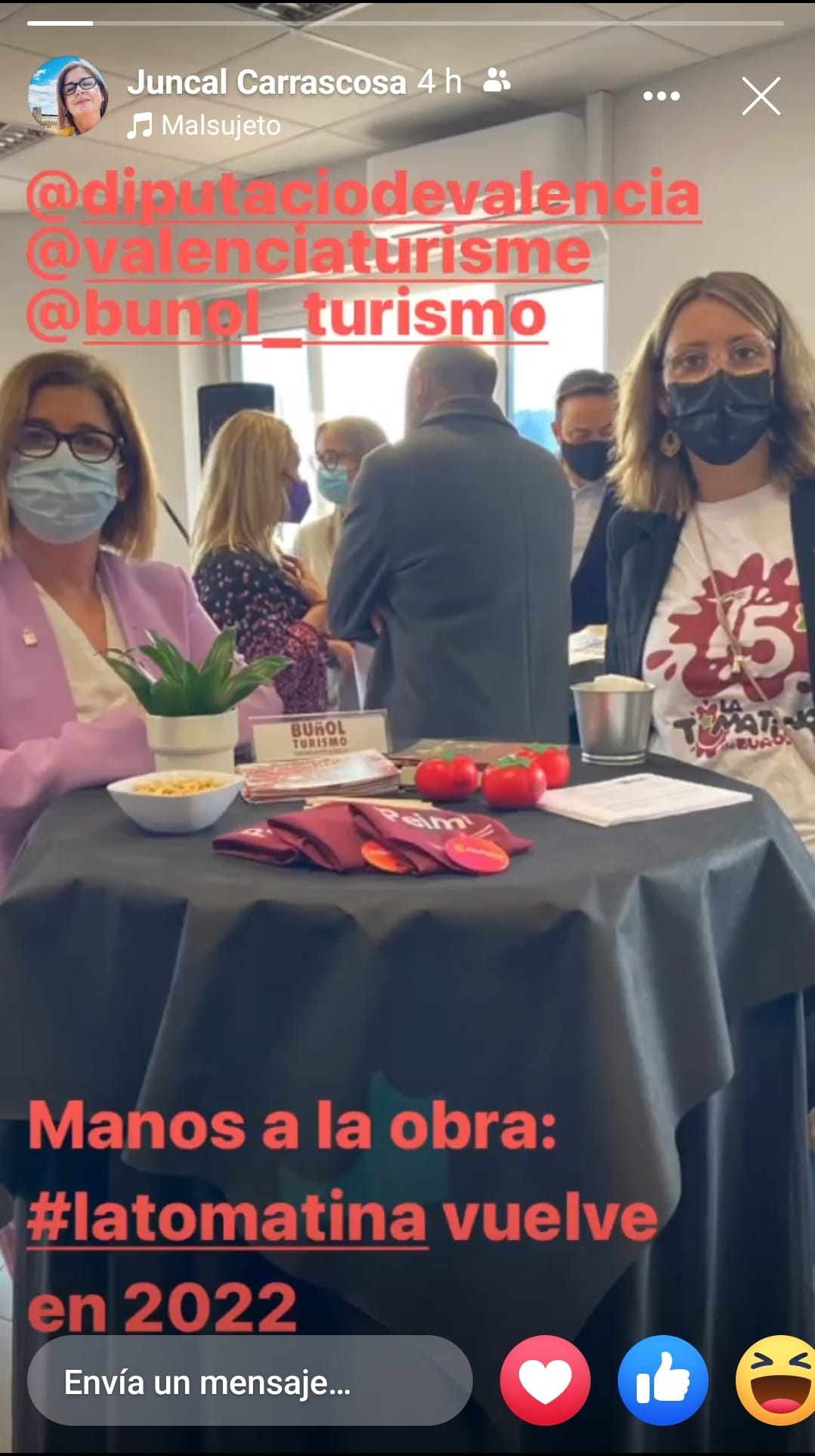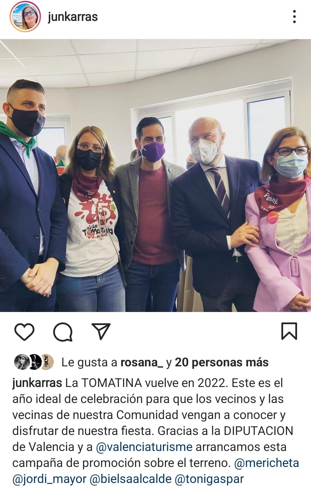 Redacción.- La fiesta más internacional de Buñol, «La Tomatina» regresa este año. Lo ha confirmado la alcaldesa de Buñol en sus redes sociales. Así reza el mensaje que ha puesto Juncal Carrascosa, que está junto a la edil de Tomatina y Turismo, María Vallés: «la Tomatina vuelve en 2022. Este es el año ideal de celebración para que los vecinos y las vecinas de nuestra Comunidad vengan a conocer y disfrutar de nuestra fiesta. Gracias a la Diputación de Valencia y a València Turisme arrancamos esta campaña de promoción sobre el terreno«. En la imagen que acompaña al texto, -de derecha a izquierda- aparecen la alcaldesa de Buñol, Juncal Carrascosa, el Presidente de la Diputación, Toni Gaspar, el alcalde de Mislata, Carlos Fernández Bielsa, la edil de Turismo y Tomatina, María Vallés y el diputado de Turismo, Jordi Mayor.
