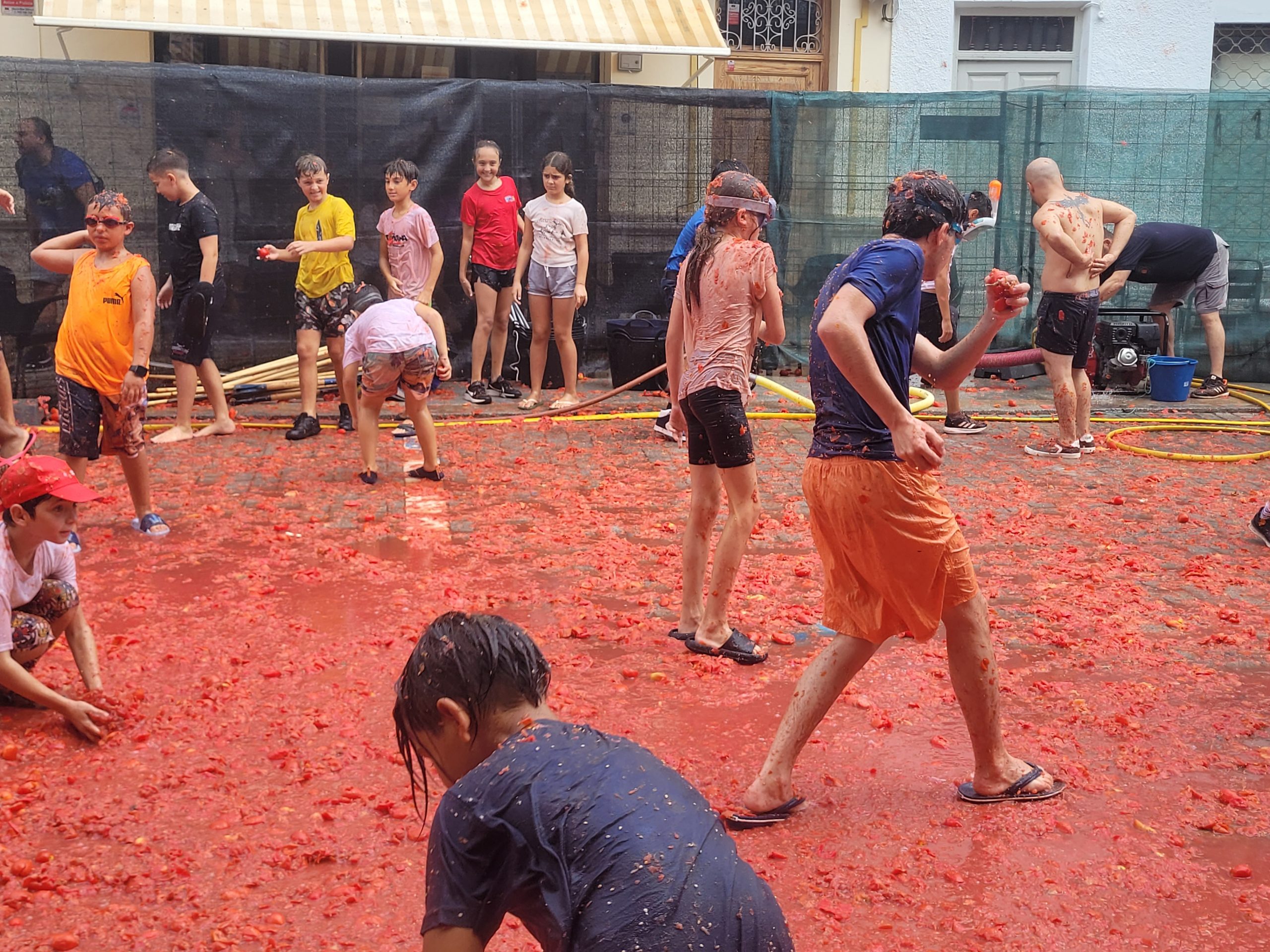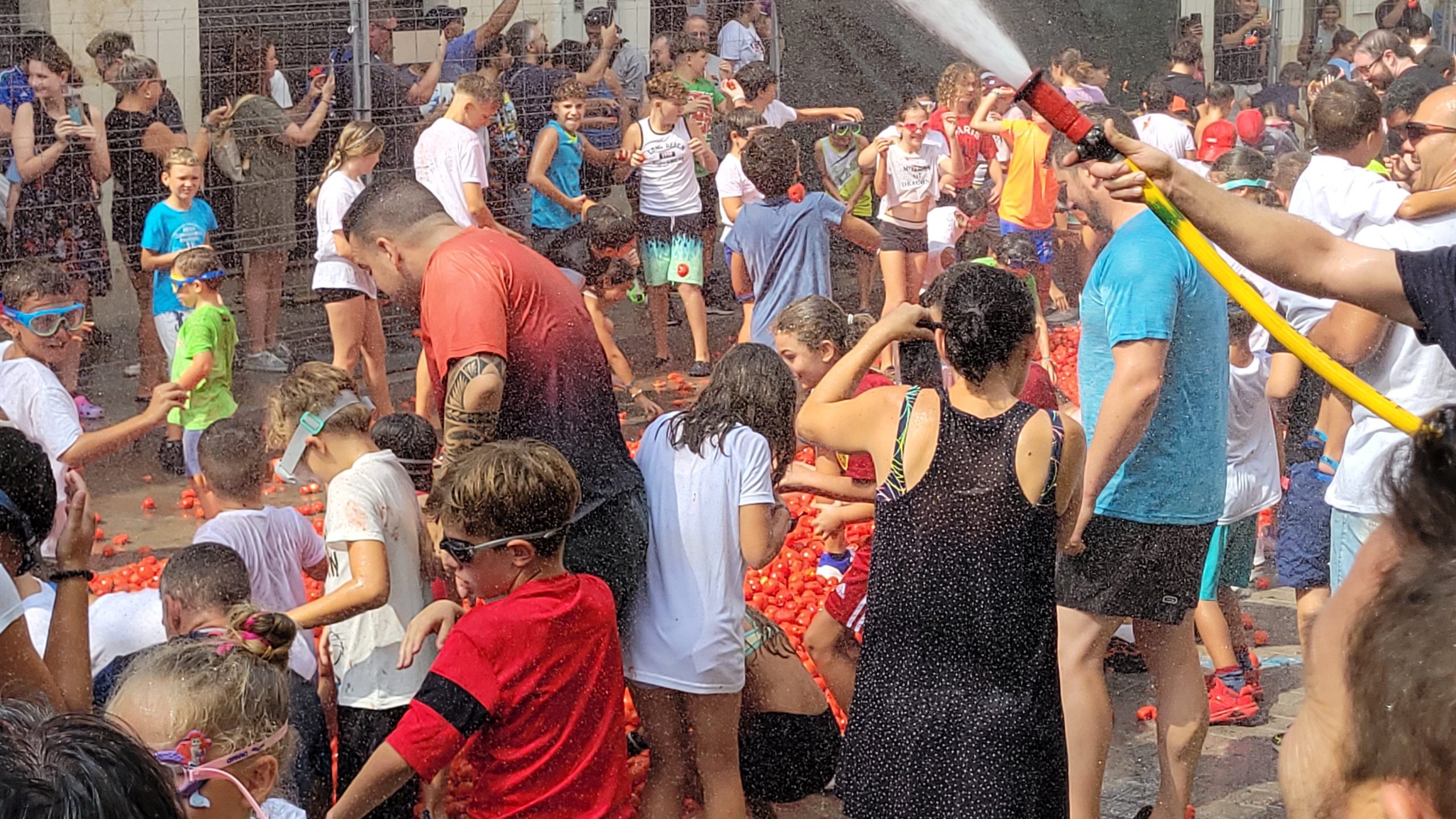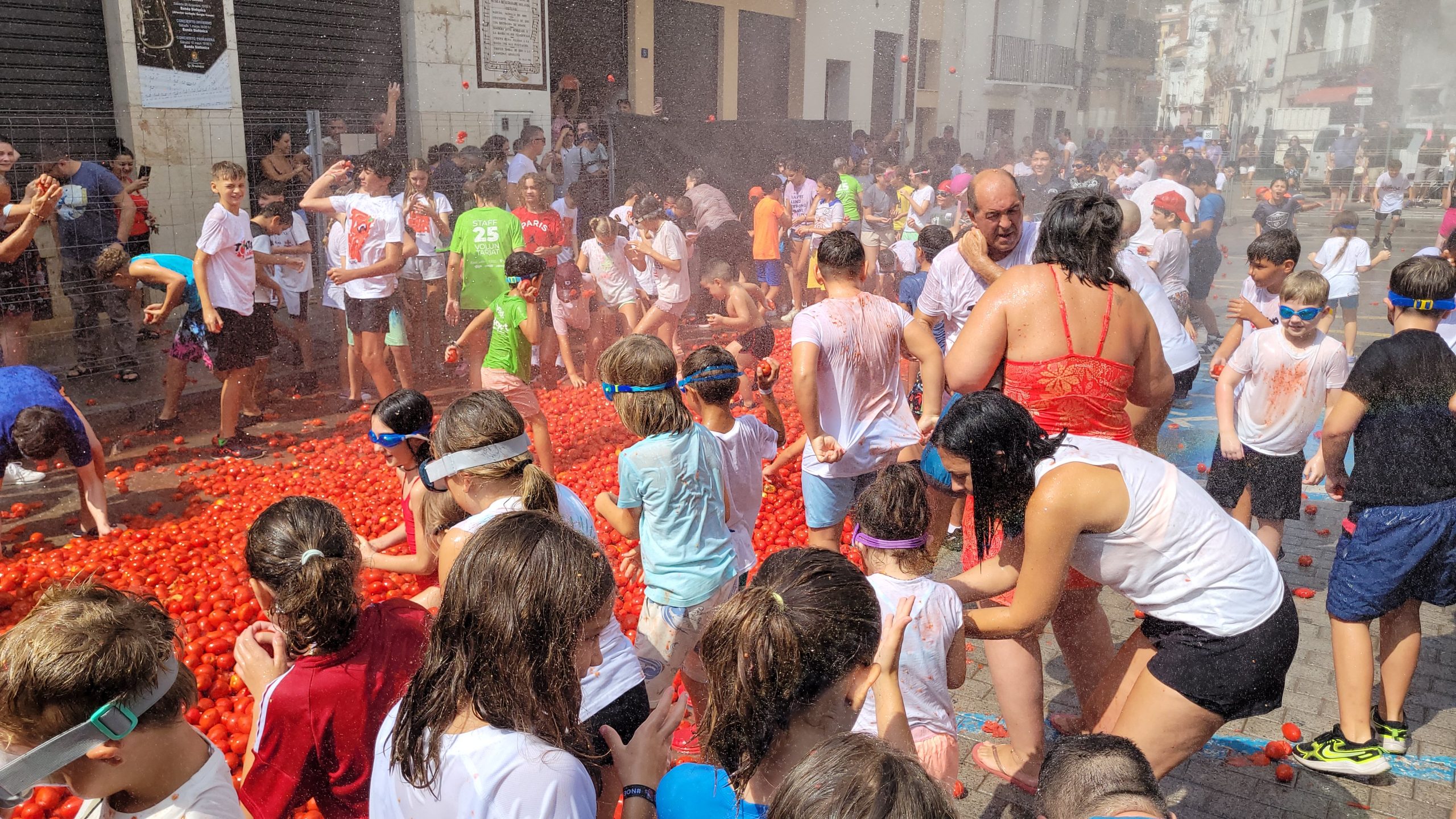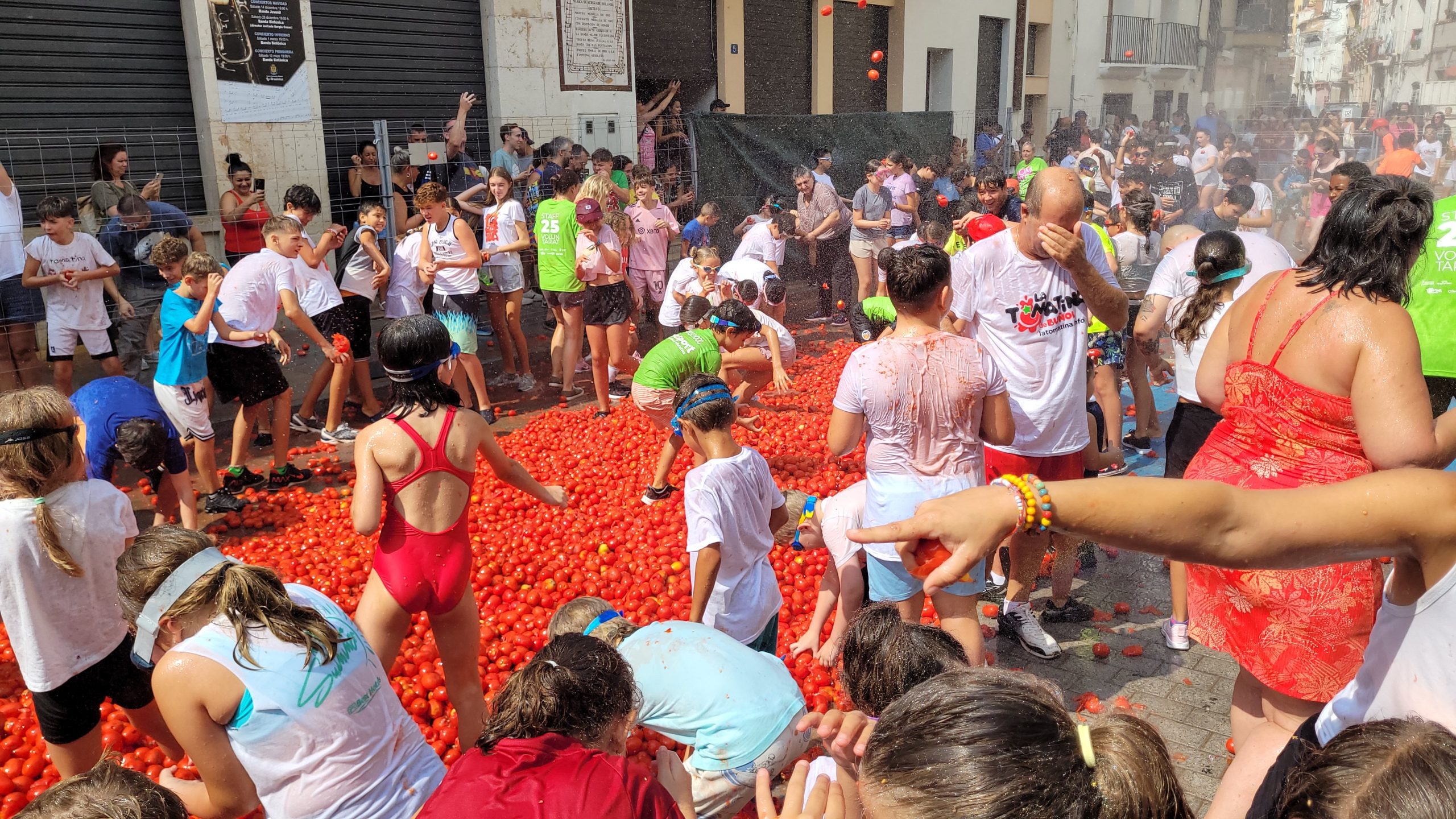 La Plaza del Pueblo de Buñol acogió a gran cantidad de niños y niñas que vivieron momentos de felicidad rodeados de más de 10.000 kilos de tomates. Eso sí, muchas y muchos estuvieron acompañados de sus padres, que en todo momento velaron por que se lo pasaran en grande. La Comisión de Fiestas y los trabajadores del Ayuntamiento de Buñol se encargaron de que todo transcurriera de la mejor manera. Hubo emoción, batalla y mucha diversión entre unos pequeños que se lo pasaron genial y se van introduciendo en la fiesta más popular de la localidad