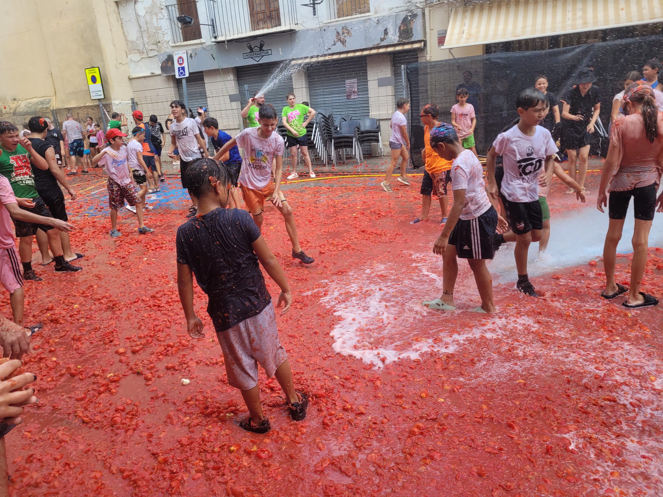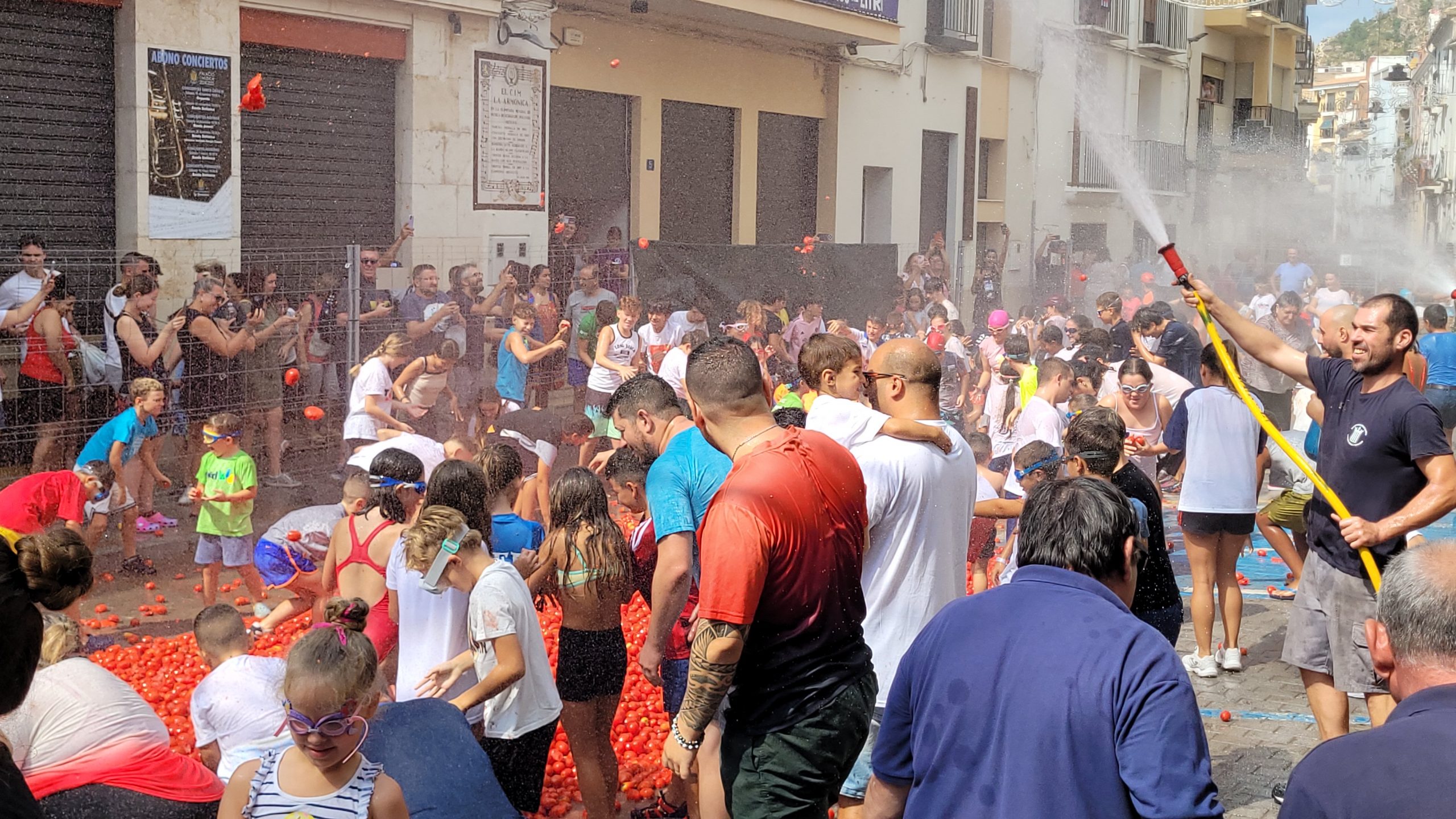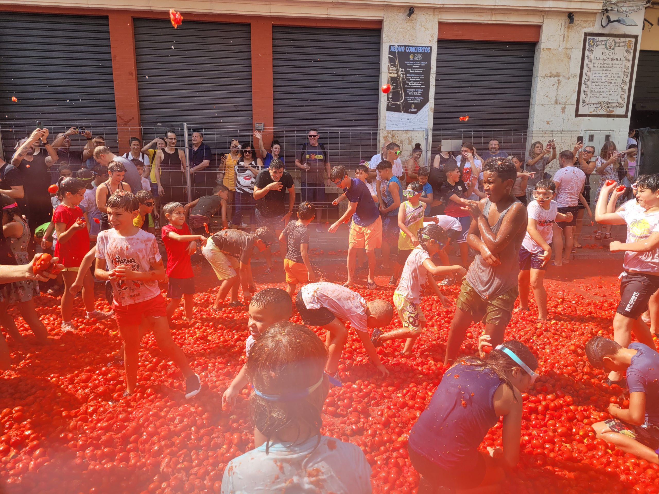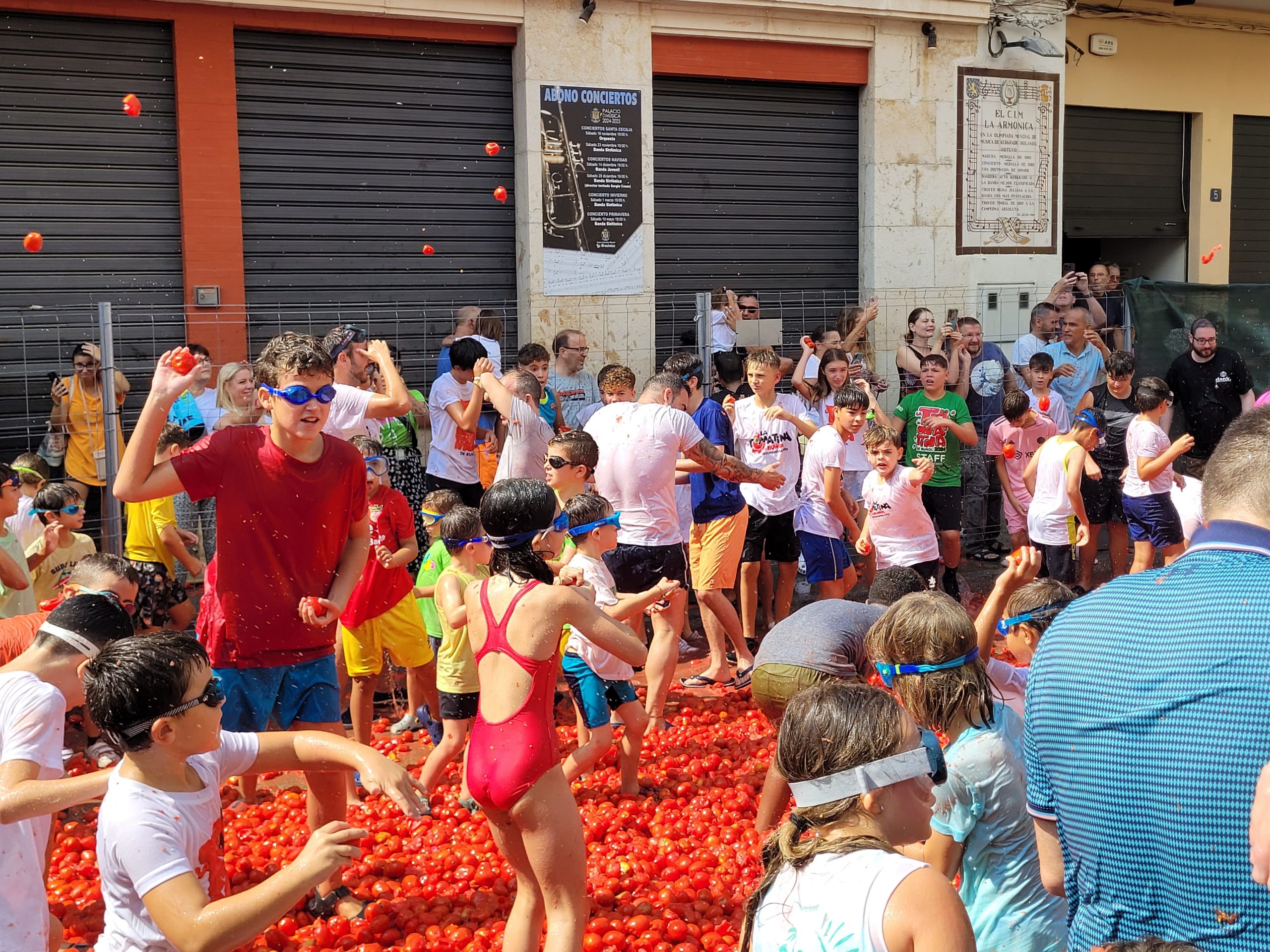 La Plaza del Pueblo de Buñol acogió a gran cantidad de niños y niñas que vivieron momentos de felicidad rodeados de más de 10.000 kilos de tomates. Eso sí, muchas y muchos estuvieron acompañados de sus padres, que en todo momento velaron por que se lo pasaran en grande. La Comisión de Fiestas y los trabajadores del Ayuntamiento de Buñol se encargaron de que todo transcurriera de la mejor manera. Hubo emoción, batalla y mucha diversión entre unos pequeños que se lo pasaron genial y se van introduciendo en la fiesta más popular de la localidad