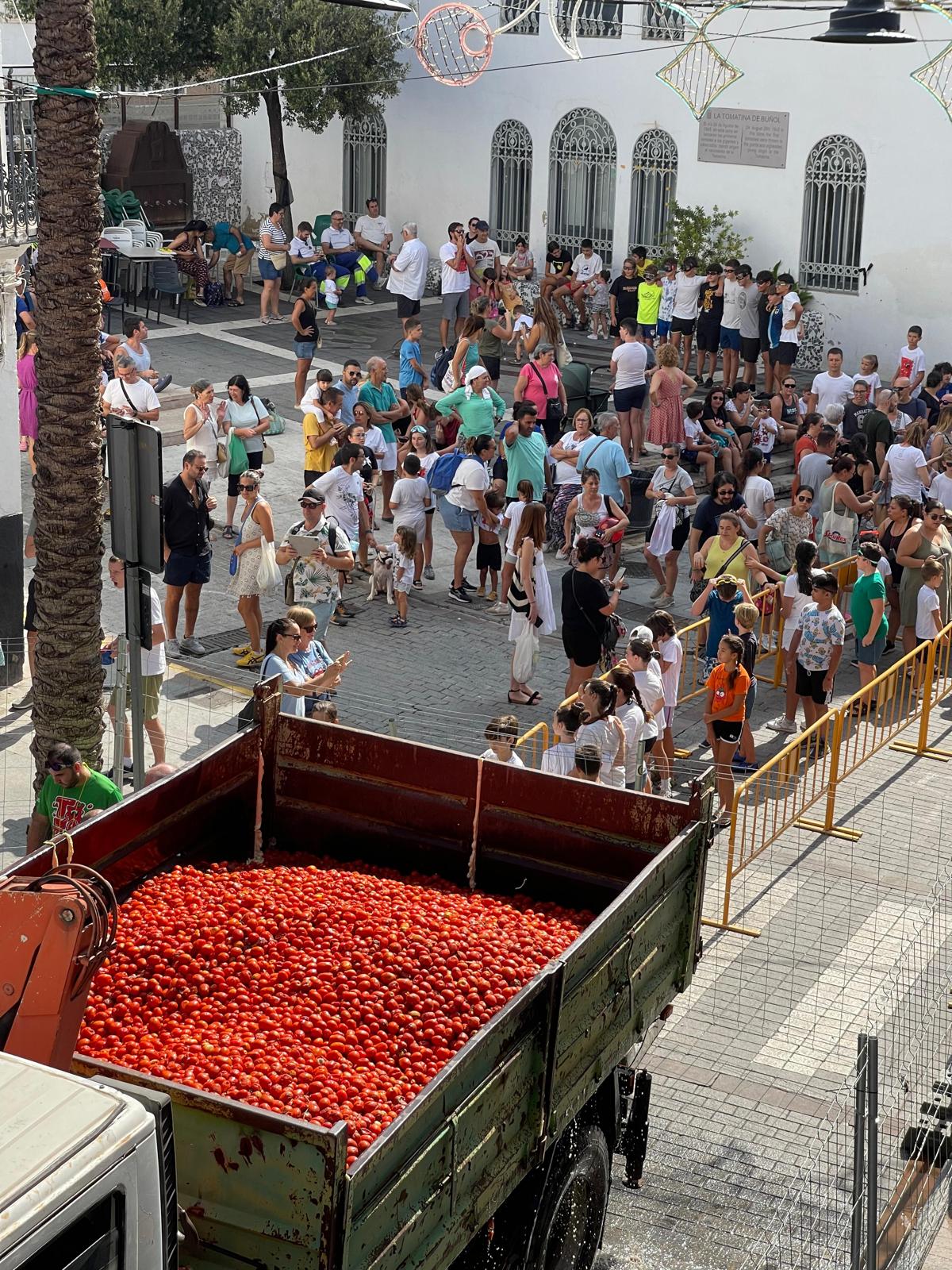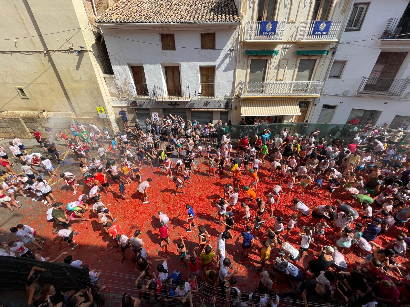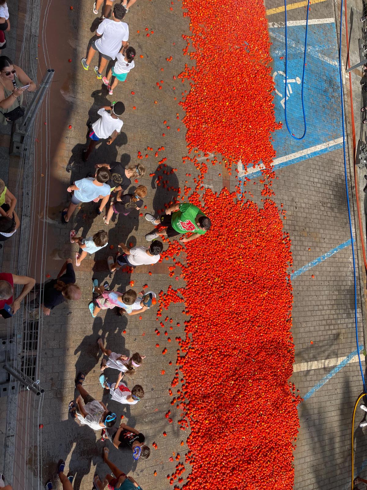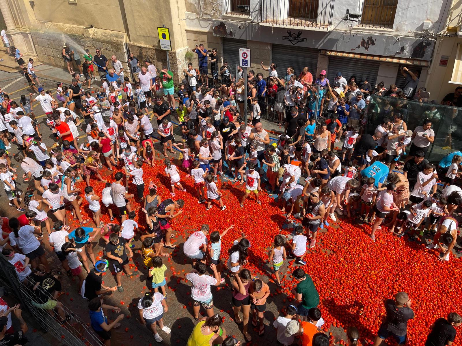 La Plaza del Pueblo de Buñol acogió a gran cantidad de niños y niñas que vivieron momentos de felicidad rodeados de más de 10.000 kilos de tomates. Eso sí, mucjas y muchos estuvieron acompañados de sus padres, que en todo momento velaron por que se lo pasaran en grande. Los Festeros del Tomate y los trabajadores del Ayuntamiento de Buñol se encargaron de que todo transcurriera de la mejor manera.