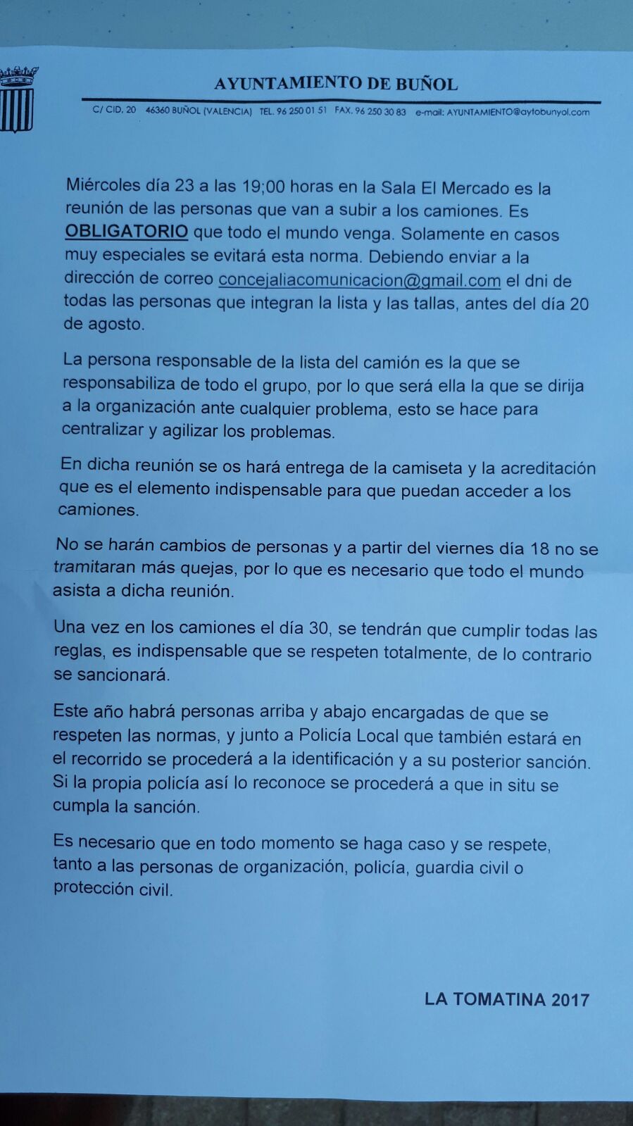 Rafa Pérez recalcó la obligatoriedad de la reunión, sin la posibilidad de que pueda ir otra persona en su lugar, en caso de no asistir no podrá subir al camión, dada la importancia de esta reunión por la exigencia de Guardia Civil y Policía Nacional, que van a preparar a las personas que participan como organizadoras para que todo transcurra sin ningún problema.