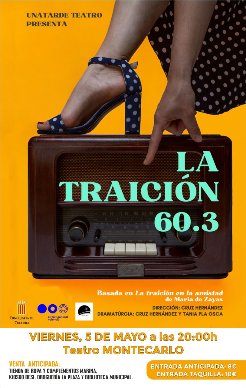 Redacción.- El Teatro Montecarlo de Buñol acoge este viernes la obra «La Traición 60.3», basada en «La Traición en la amistad» de María de Zayas. El espectáculo comenzará a las 20h y las entradas pueden adquirirse en taquilla o de manera anticipada en los establecimientos habituales.