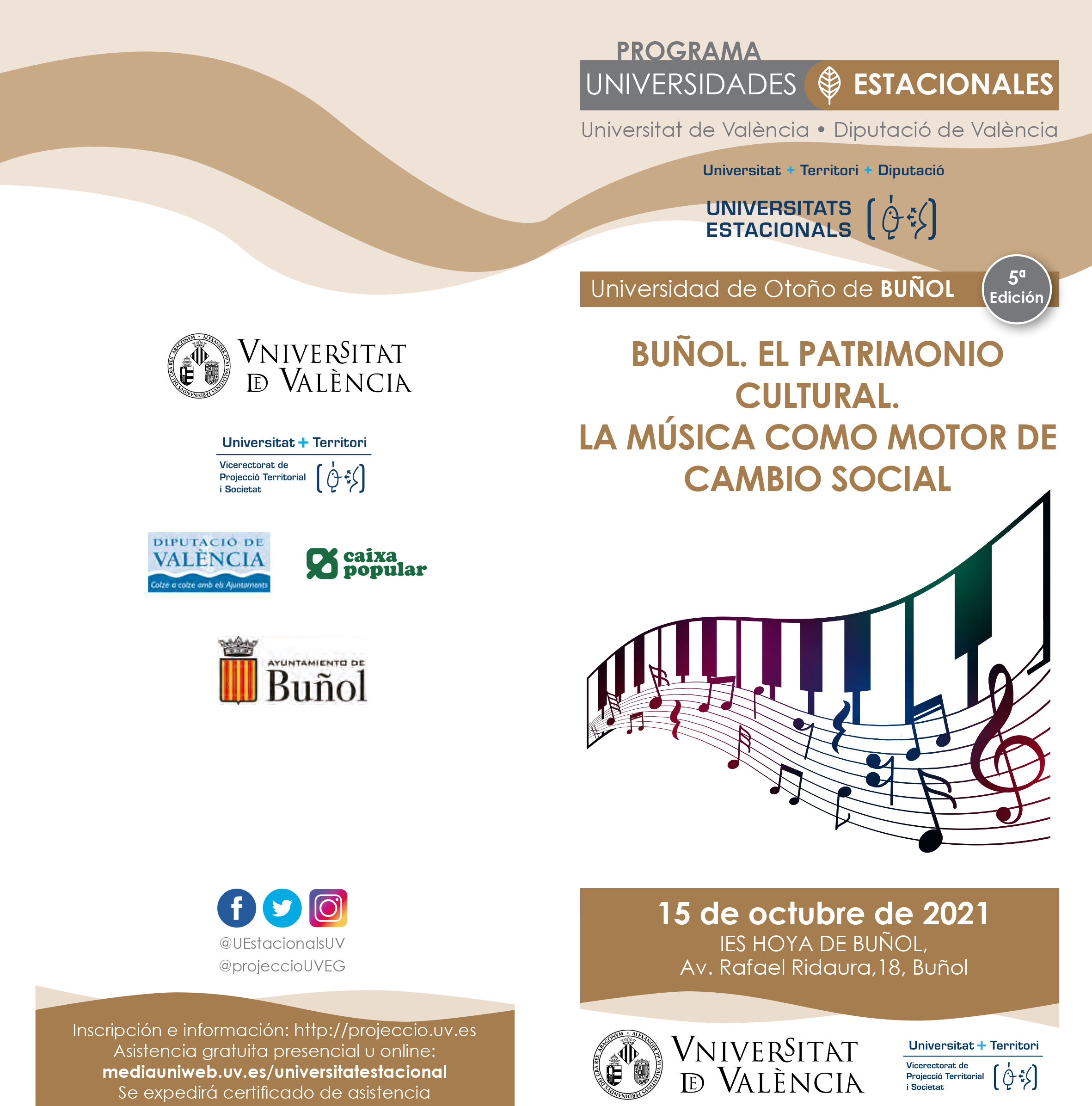 La Universidad de Otoño de Buñol celebrará durante la mañana del próximo viernes, 15 de octubre, la que ya es su quinta edición, bajo el título ‘Buñol. El patrimonio cultural. La música como control de cambio social’. Prosigue así la programación de Universidades Estacionales, una iniciativa de la Universitat de València (UV), organizada a través del Vicerrectorado de Proyección Territorial y Sociedad con los ayuntamientos y en colaboración con la Diputación de València y Caixa Popular con el objetivo de promover el debate en torno a un tema monográfico ligado a la singularidad de cada ámbito geográfico, teniendo en cuenta su particular idiosincrasia, historia y cultura, bajo la coordinación de un especialista en la materia. Esta acción académica está en todas las comarcas de la provincia, con 20 ediciones en otras tantas localidades.