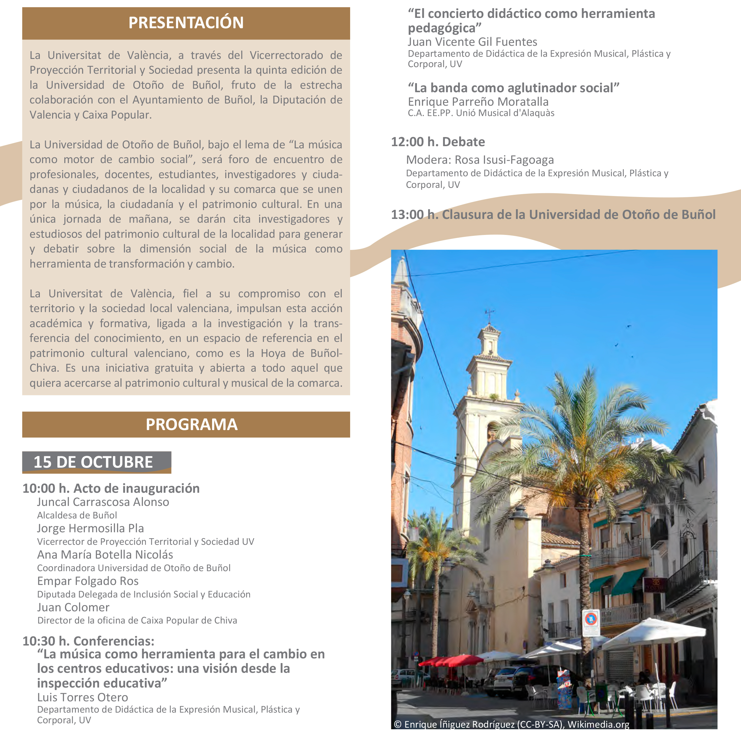 La quinta edición de la Universidad de Otoño de Buñol, que se encuadra en el área temática ‘Patrimonio Histórico y Cultural’, se desarrollará en el IES Hoya de Buñol (Avenida Rafael Ridaura, 18,) y reunirá a profesionales, investigadores, docentes, estudiantes y ciudadanos interesados en el contenido de la jornada, para analizar la dimensión social de la música como herramienta de transformación y cambio.