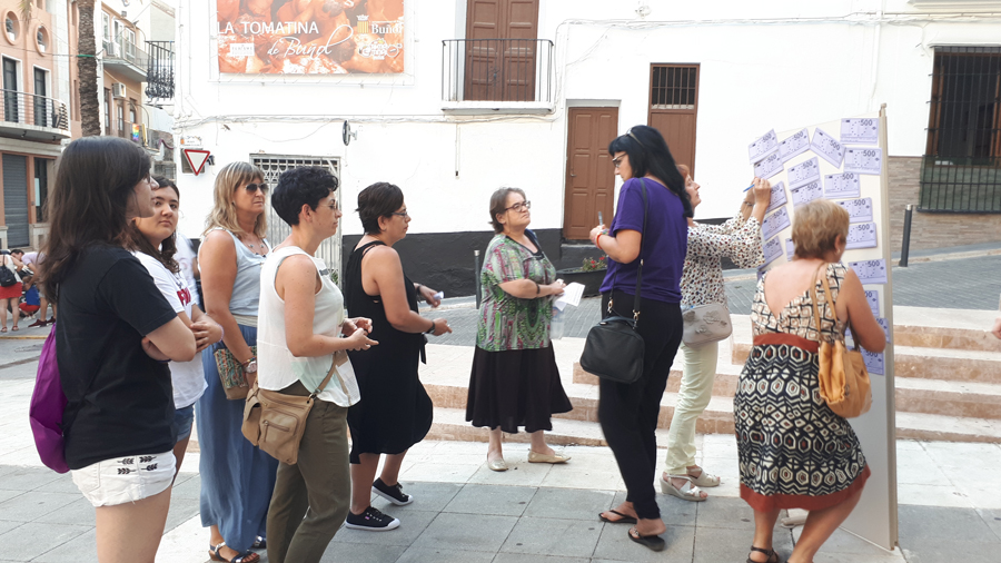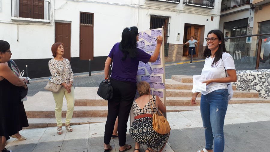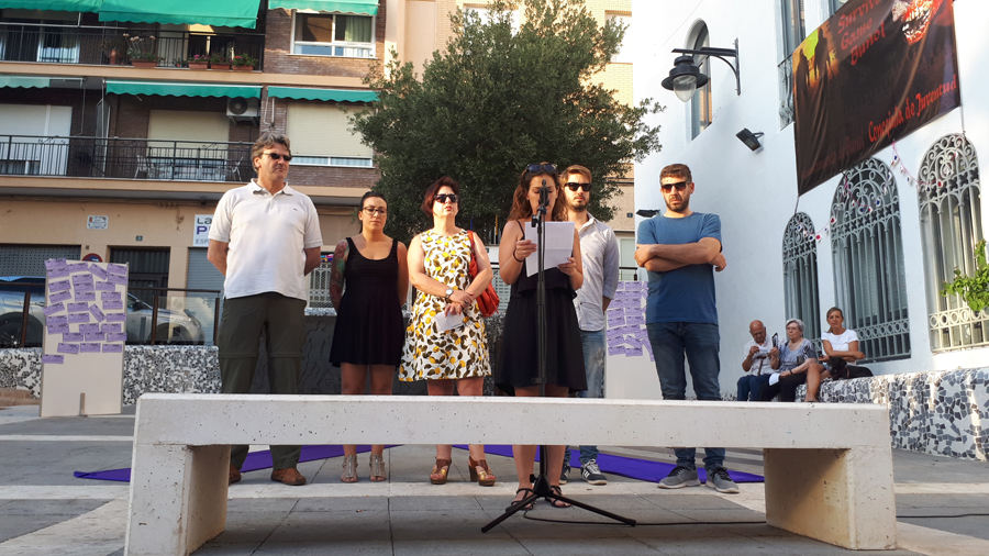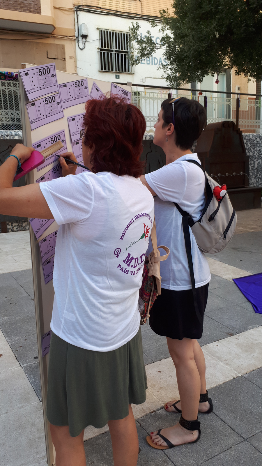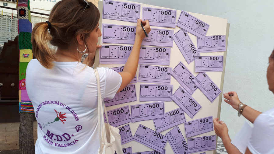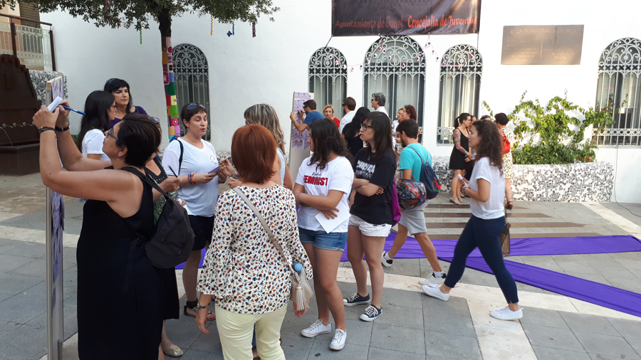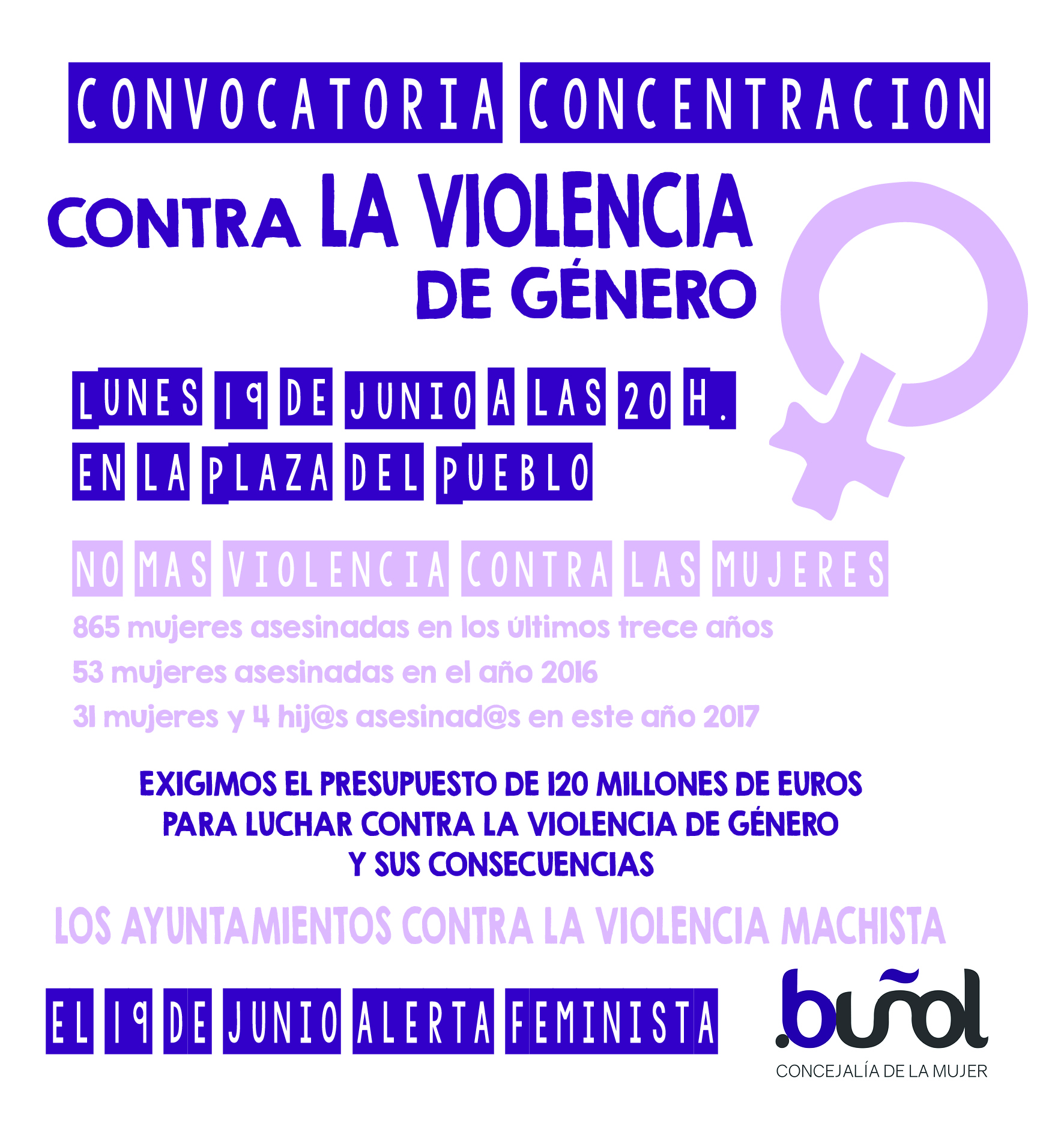 La Concejalía de Igualdad y Mujer del Ayuntamiento de Buñol, ante la inminente aprobación de los próximos Presupuestos Generales del Estado para 2017, quiso convocar esta concentración. María Álvarez, leyó unas palabras, que pusieron de manifiesto el problema, y las nulas soluciones que el Estado está poniendo a él. El propósito de esta acción tan significativa acción era pedir al Gobierno Central un aumento en 120 millones de euros de la asignación presupuestaria destinada a igualdad y a la prevención y lucha contra la violencia machista. Por este motivo, todos los asistentes a esta concentración escribieron en unos paneles llenos de billetes de 500€ (falsos), para solicitar al Gobierno central la ayuda necesaria para luchar contra este problema. Durante la concentración, el lazo morado ocupó la Plaza del Pueblo, de nuevo simbolizando la solidaridad de Buñol con esta causa.