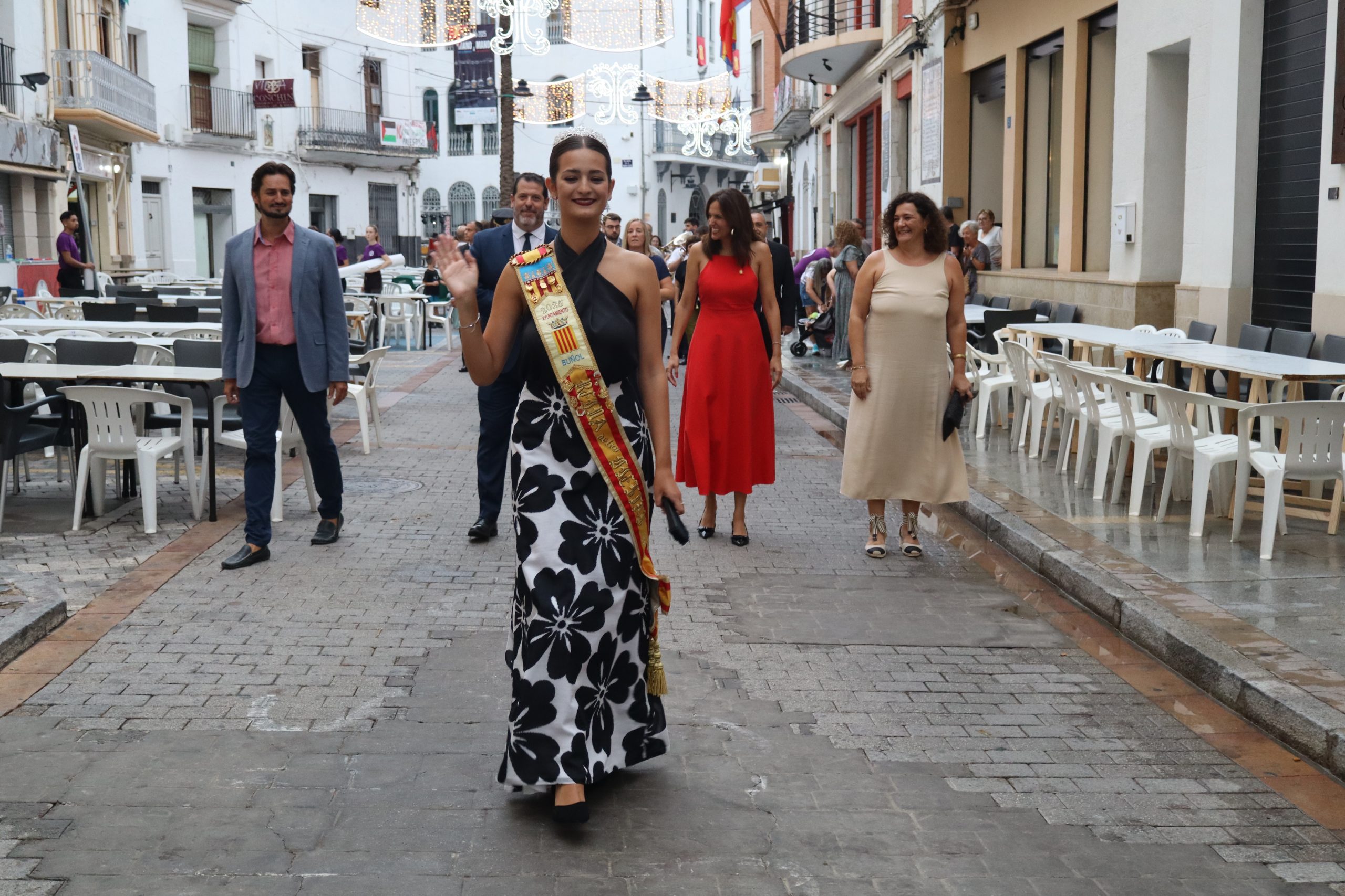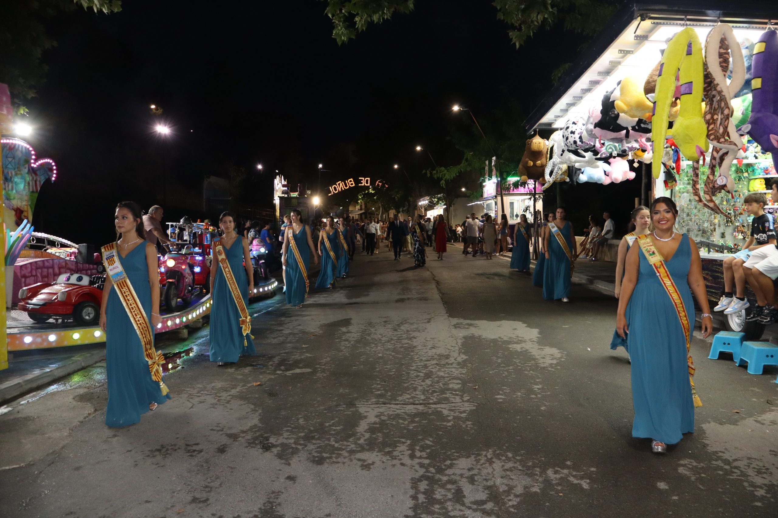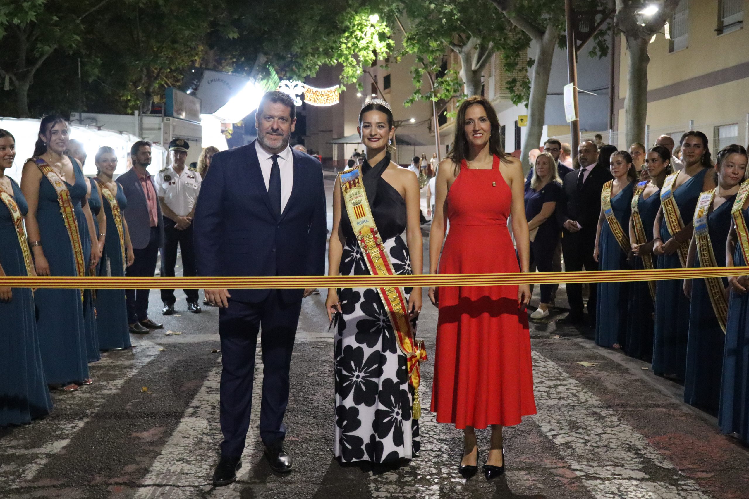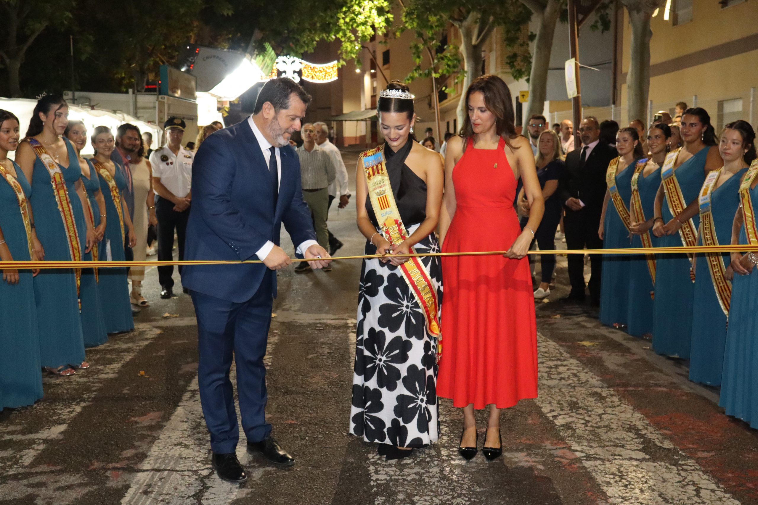 Redacción.- El pasado viernes la Feria y Fiestas de Buñol 2025 por fin, echaron a andar. A las 21h la Reina de la Feria y Fiestas acompañada de su Corte de Honor y la corporación municipal, encabezada por la Alcaldesa, Virginia Sanz y el edil de Fiestas, Sergio Galarza, marcharon hacia el Paseo de San Luis, donde se cortó la cinta con la que se abría el recinto ferial. Antes, Carmen Alís y su comitiva visitaron las exposiciones de pintura en la Sala Raga y en el antiguo kiosko de Juanjo.