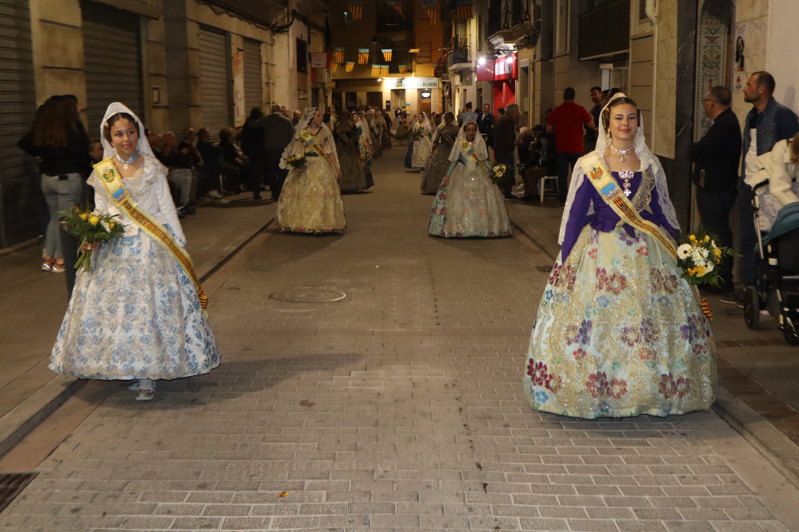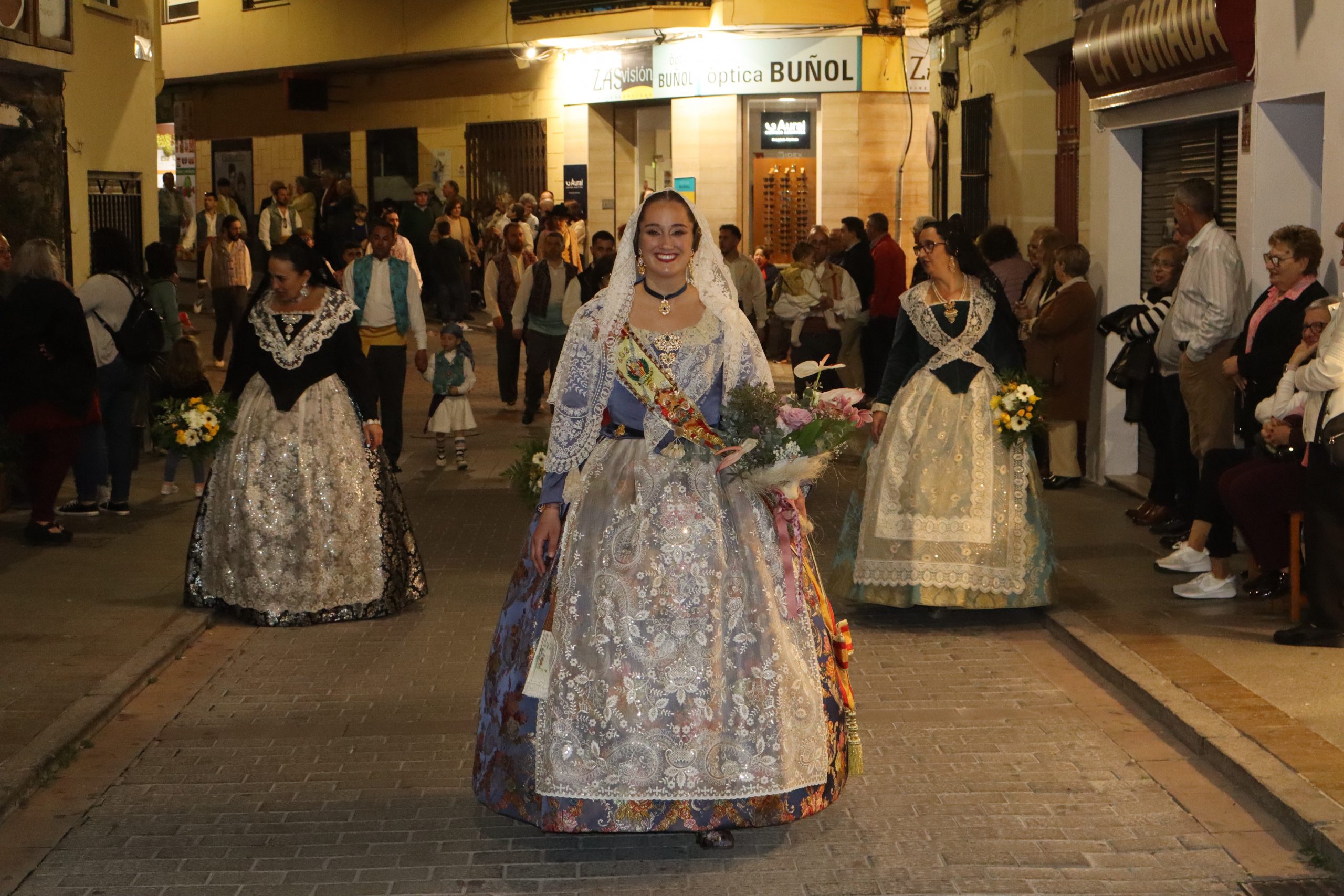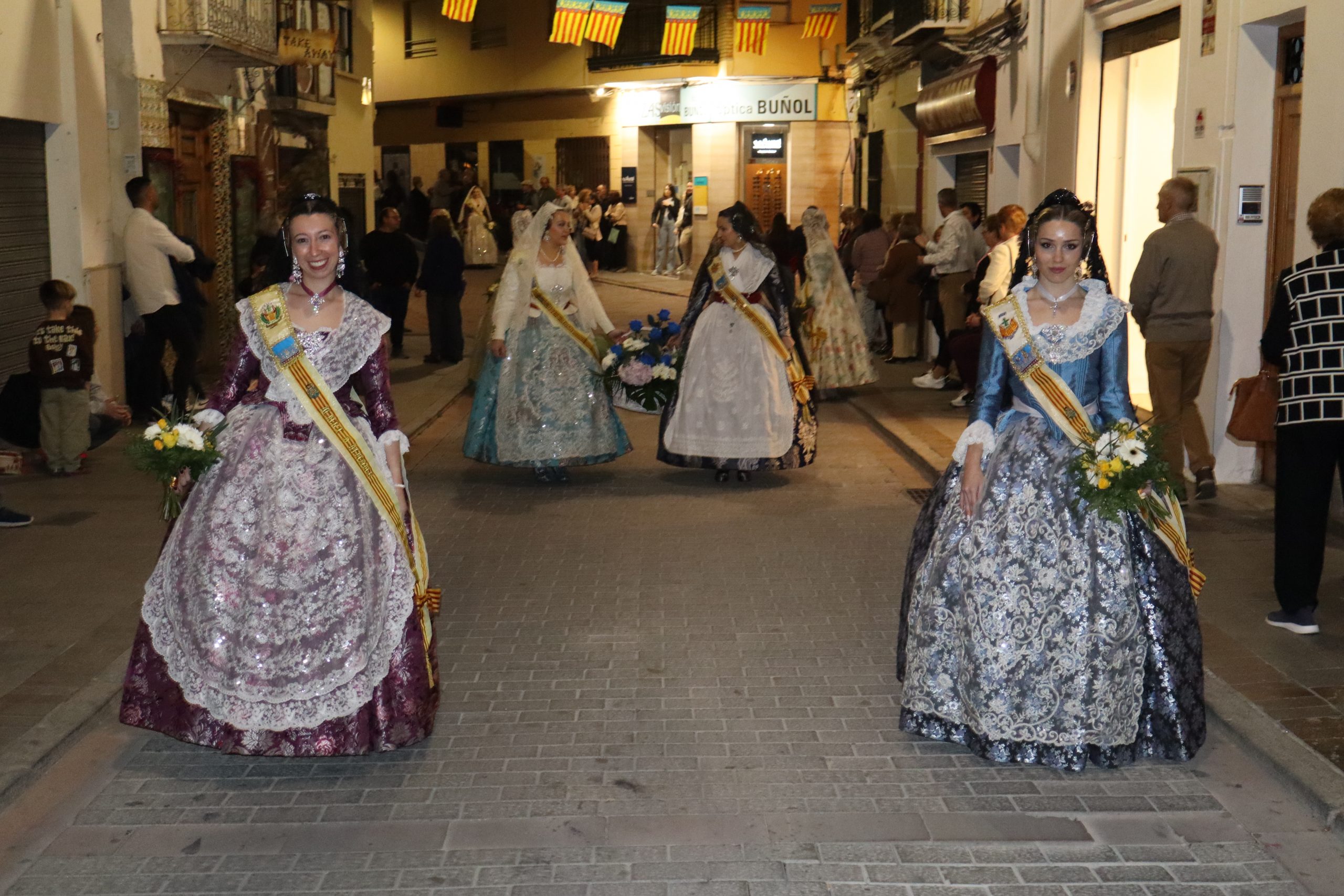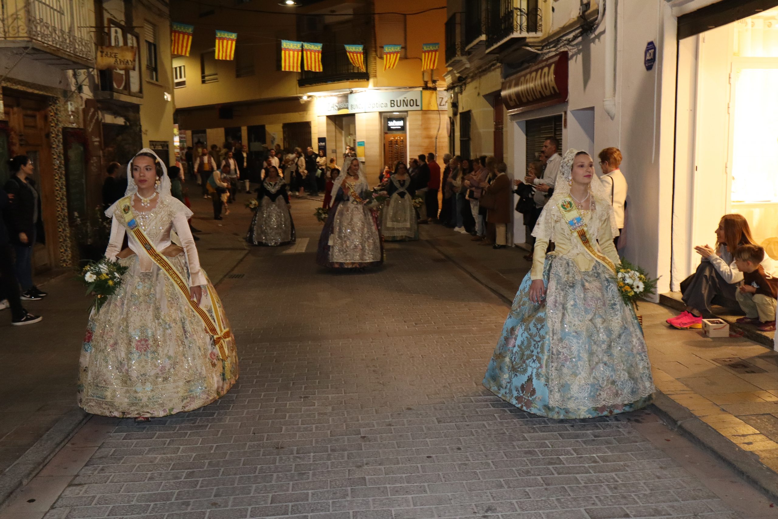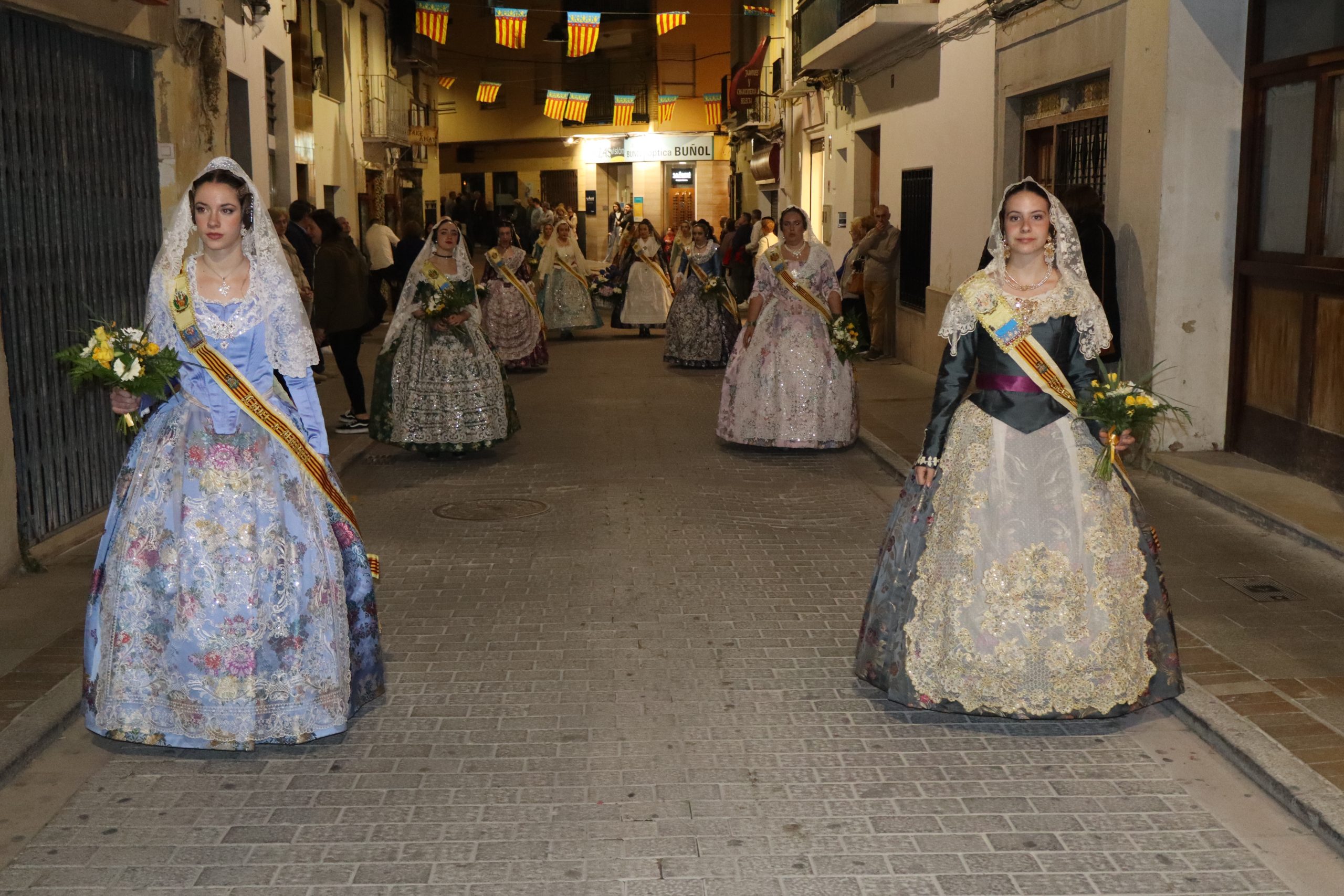 La Ofrenda siempre es uno de los actos más emotivos en el mundo fallero, sobre todo para las Falleras Mayores. Es un evento donde las protagonistas de cada comisión se ven arropadas por toda su comisión, que sale en masa a participar. Y no solo las falleras y falleros dieron alegría y color a la Avenida de la Violeta, País Valenciano, Calle del Cid y la Plaza del Pueblo, sino también los numerosísimos ciudadanos que salieron a ver a sus familiares, a su nieta, a su nieto, hijo o hija desfilar. Lo aplausos se sucedían a uno y otro lado de las calles y eso engrandeció un acto ya de por sí, enorme. Fueron las comisiones de la Falla Buñol Pueblo, la Falla Nuevo Buñol y la Falla Reyes Católicos, las protagonistas de una tarde maravillosa.
