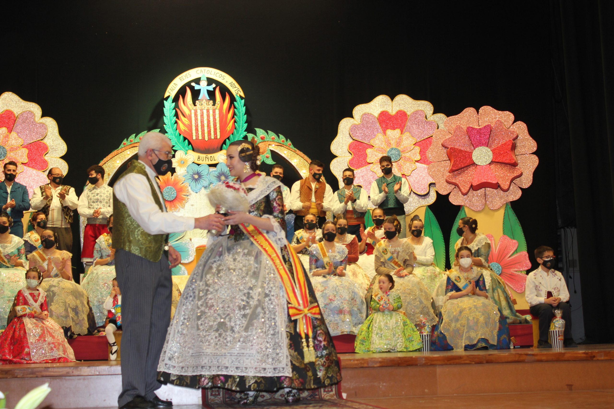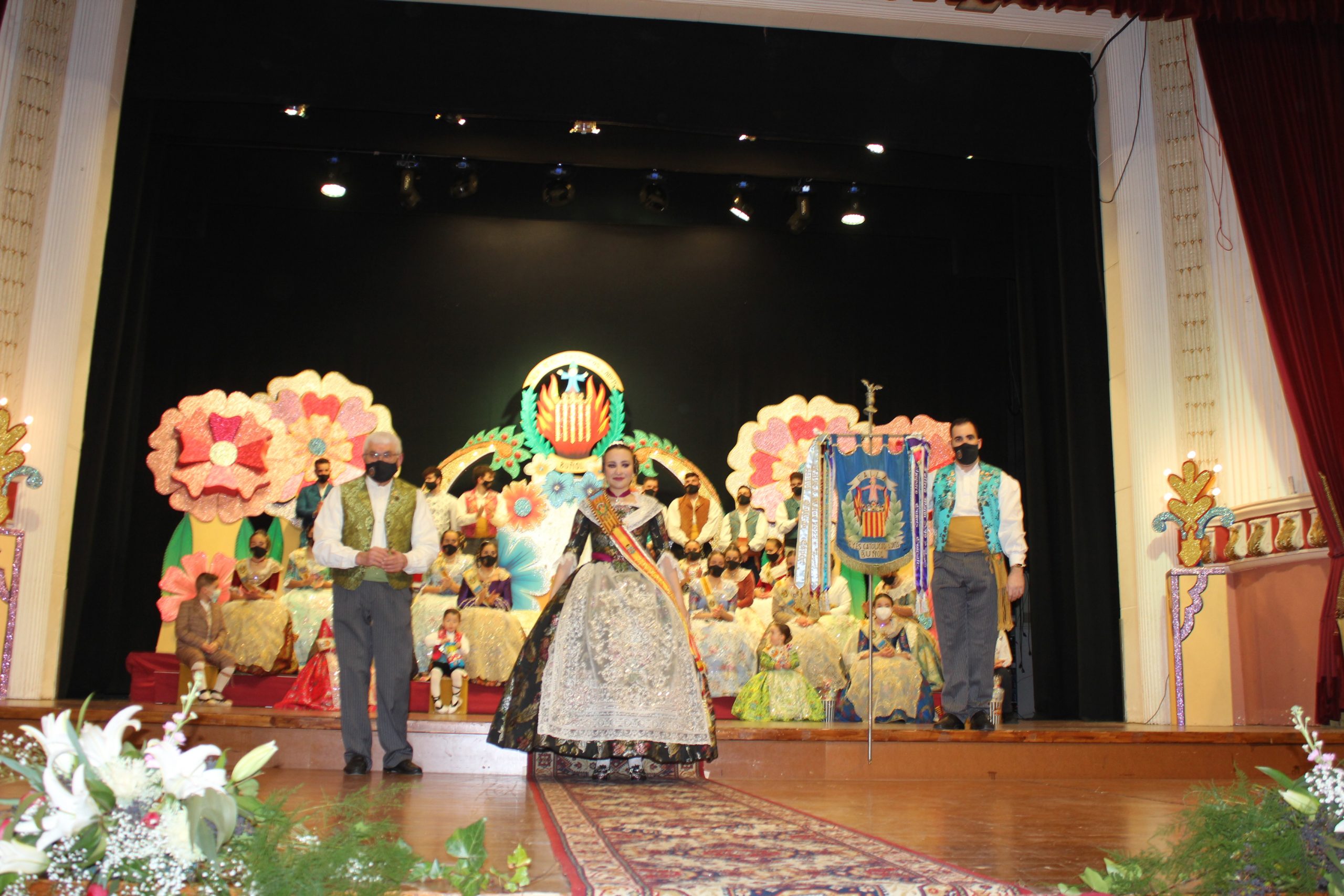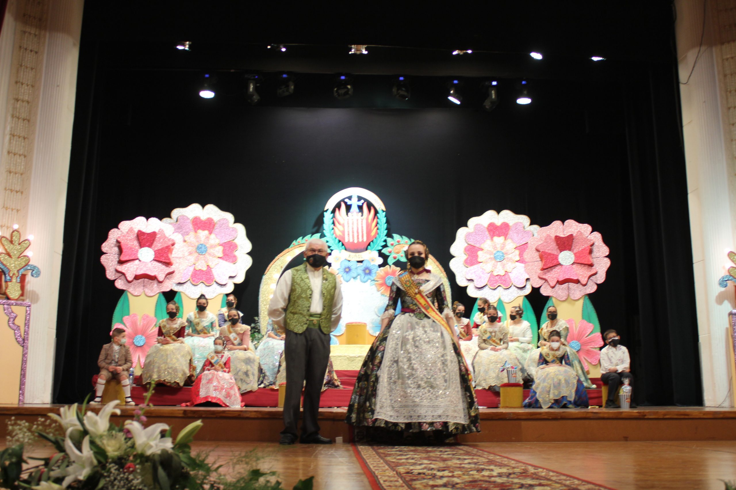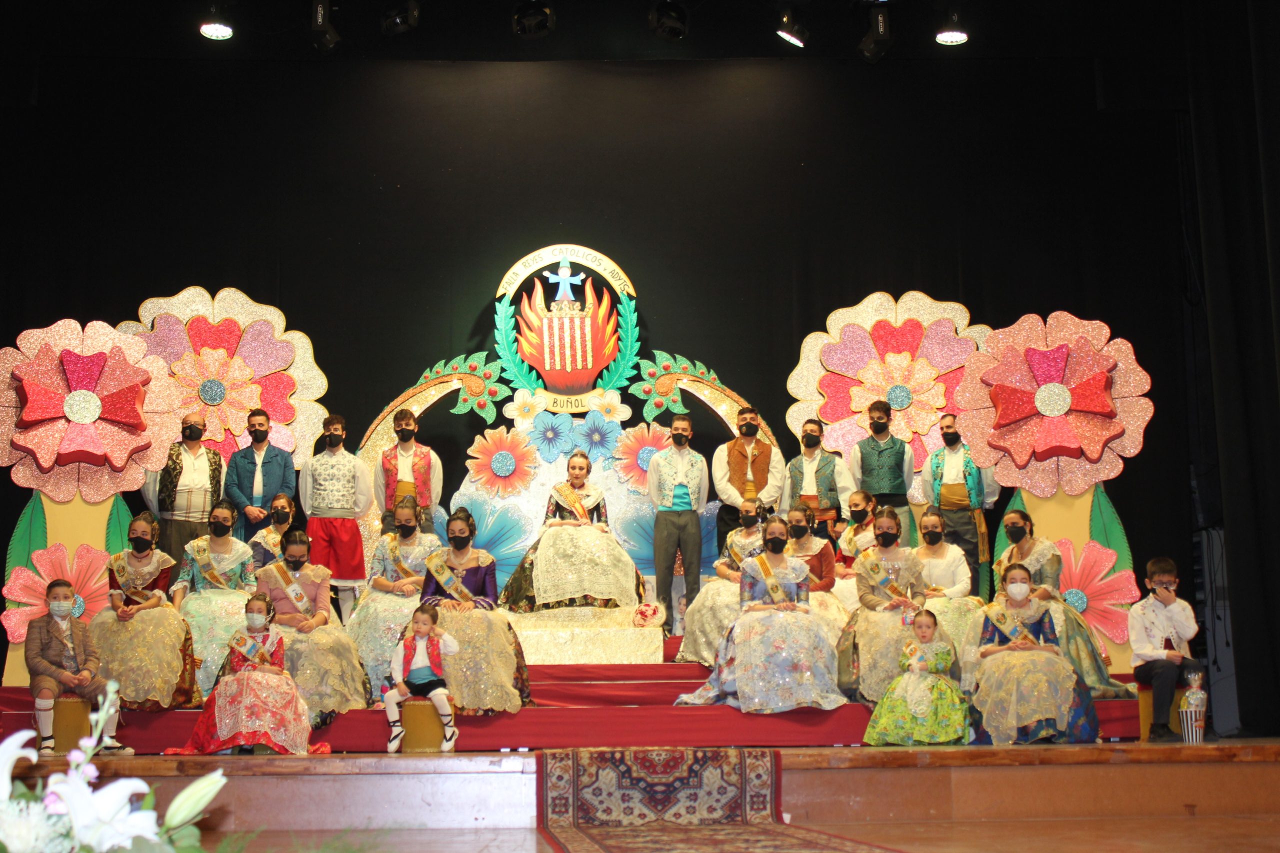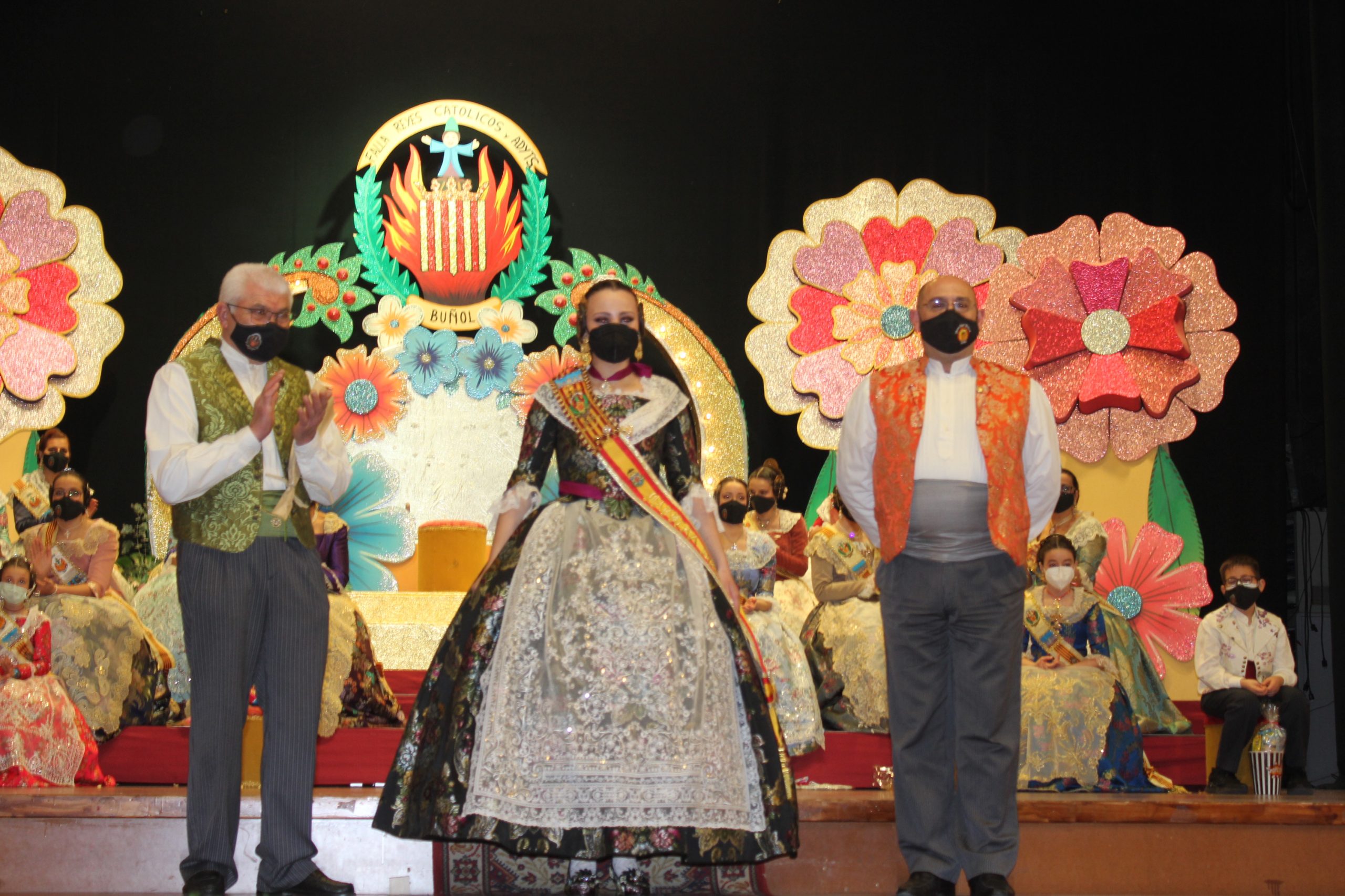 Un escenario engalanado para la ocasión por Salvador Espert y sus ayudantes. Decenas de falleras y falleros que llenaron el escenario. Un emotivo vídeo de recuerdo de como la pandemia ha afectado a las fallas, pero no al espíritu de los miembros de la comisión. Un baile preparado por las más jóvenes de la falla. Su padre, Javier leyó unas emotivas palabras. Y, finalmente, Laura, recibió el caluroso recibimiento de las fallas amigas y de la Reina de la Feria y Fiestas y de la Alcaldesa de Buñol.