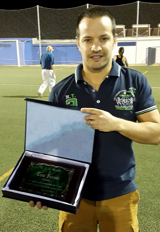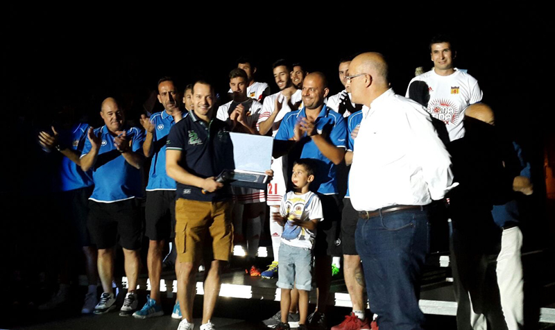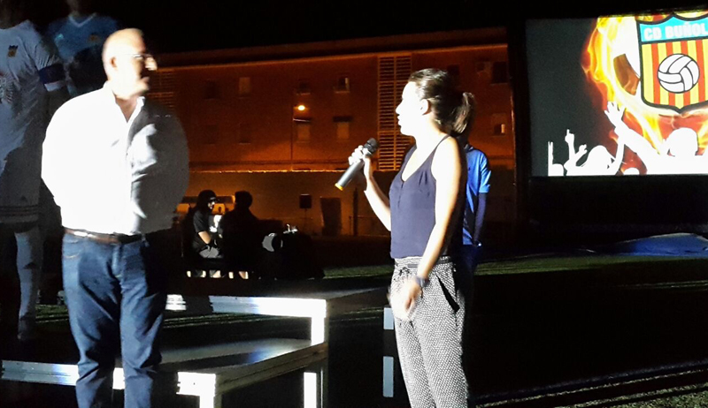 Pantalla gigante, cañones de luz, máquina de humo y entarimado en el centro del campo, como si de un equipo de otra división superior se tratase, uno a uno fueron saliendo los integrantes del equipo al Beltrán. Las ovaciones de la noche recayeron en jugadores de la casa como, Godo autor del gol que le dio el ascenso al CD Buñol en Burriana. Una vez el equipo al completo estaba sobre el centro del campo, fue Javier Santafé, el míster, y su equipo técnico los que saltaron al terreno de juego, para acabar cerrando el Presidente, Amadeo Sáez. Cuando parecía que la plantilla estaba al completo, el speaker llamó a uno de los buques insignia del equipo, que este año ya no estará en la filas blancas, pero sí en los corazones de todos. Se trata de Furri, al que el club quiso rendirle un homenaje por su trayectoria y por todo lo que ha aportado al equipo. Amadeo Sáez le hizo entrega de una placa y el jugador agradeció a la afición y al club el apoyo y el cariño que siempre ha recibido.
