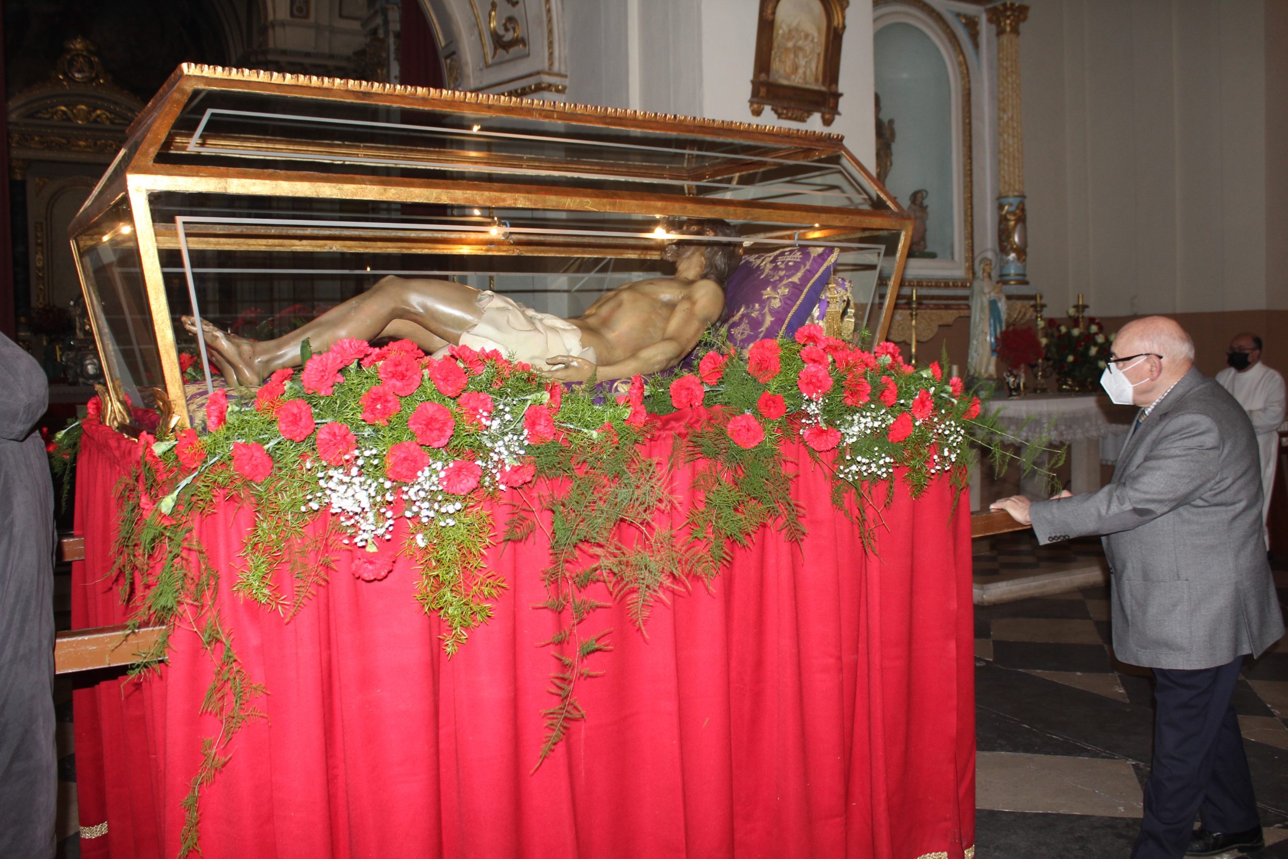 En la parroquia San Pedro se realizó después de los Oficios la Procesión del Santo Entierro. Aunque este año sólo procesionó el Santo Sepulcro para evitar concentraciones y respetar las medidas de seguridad. Se recorrió los pasillos laterales del templo buñolense, mientras los feligreses permanecieron en silencio todo momento en sus bancos. Durante las celebraciones estuvieron los dos sacristanes de localidad Luis Carrascosa y Pepe y fueron oficiadas por el vicario de localidad, Arturo, Borja y el párroco de localidad Enrique Boronat.