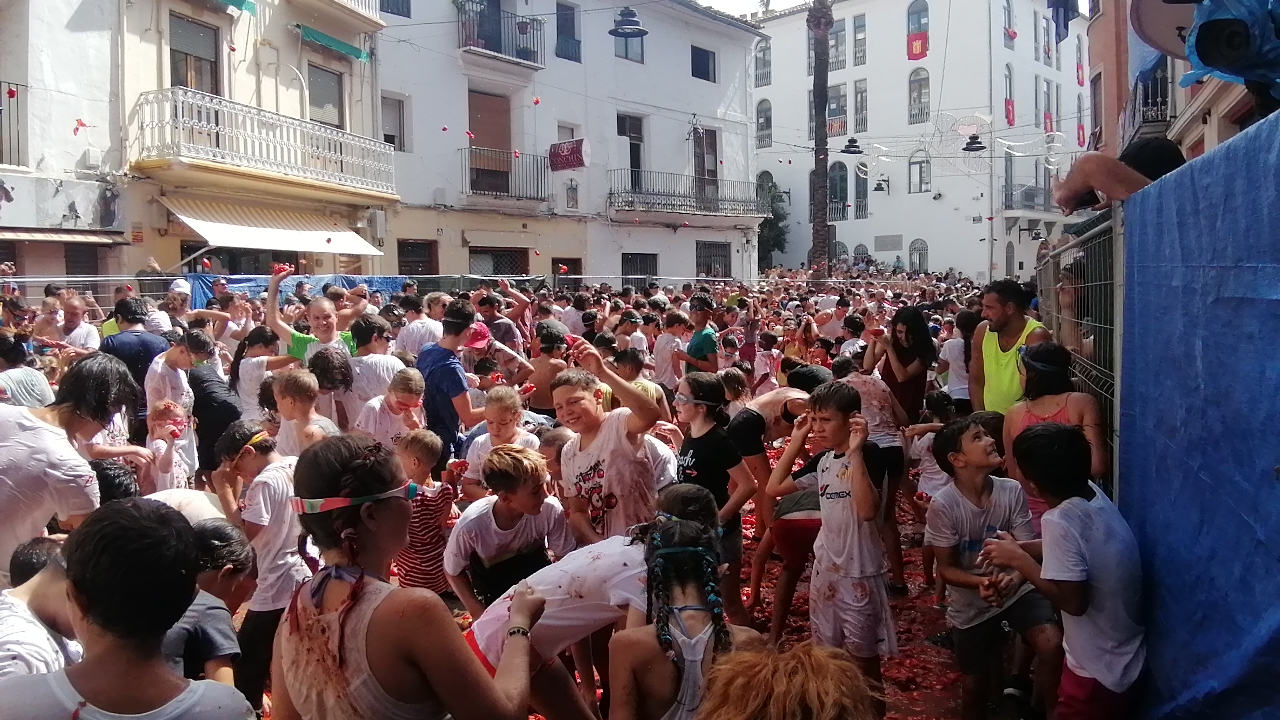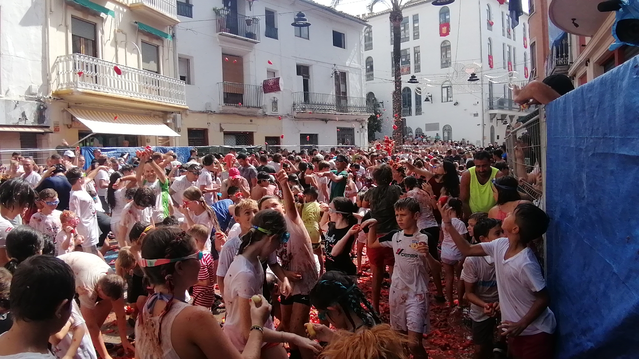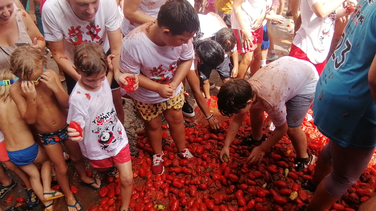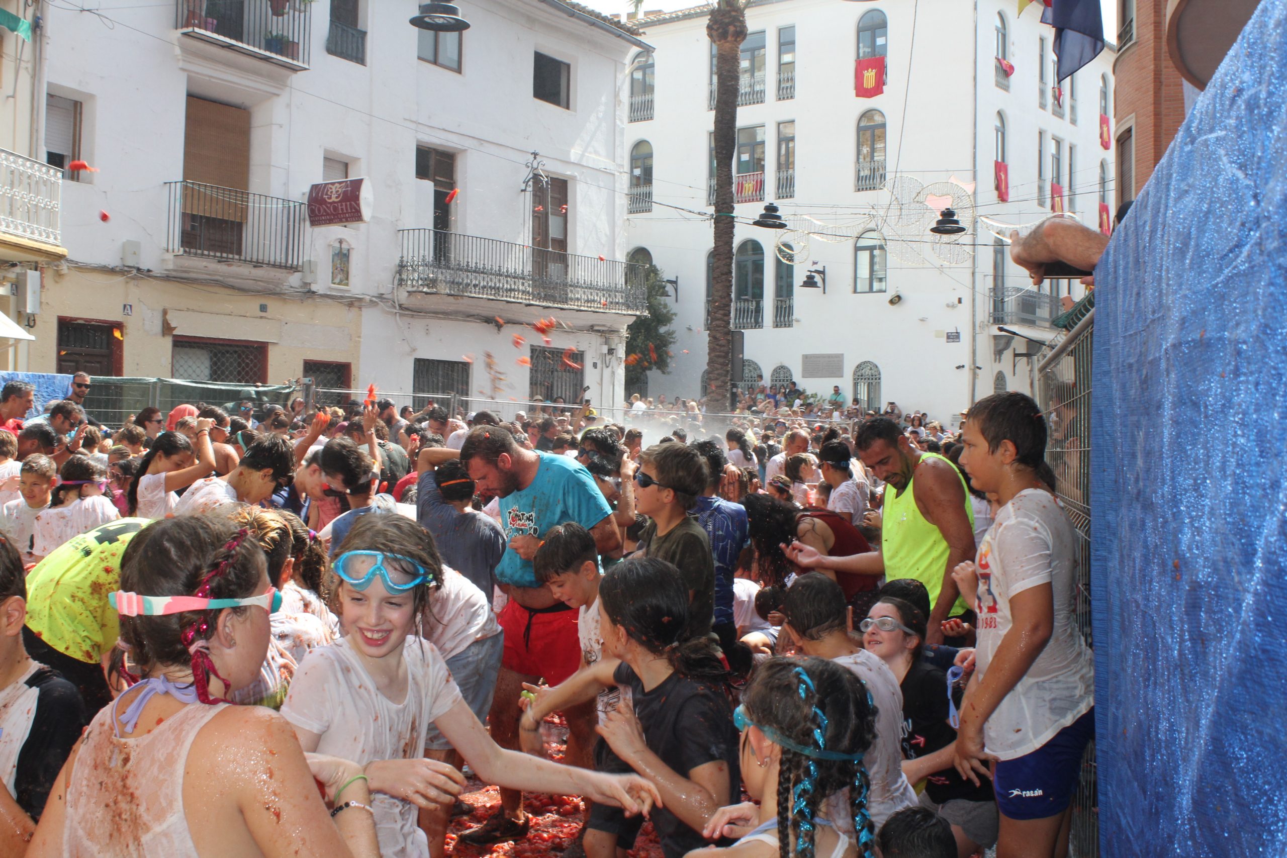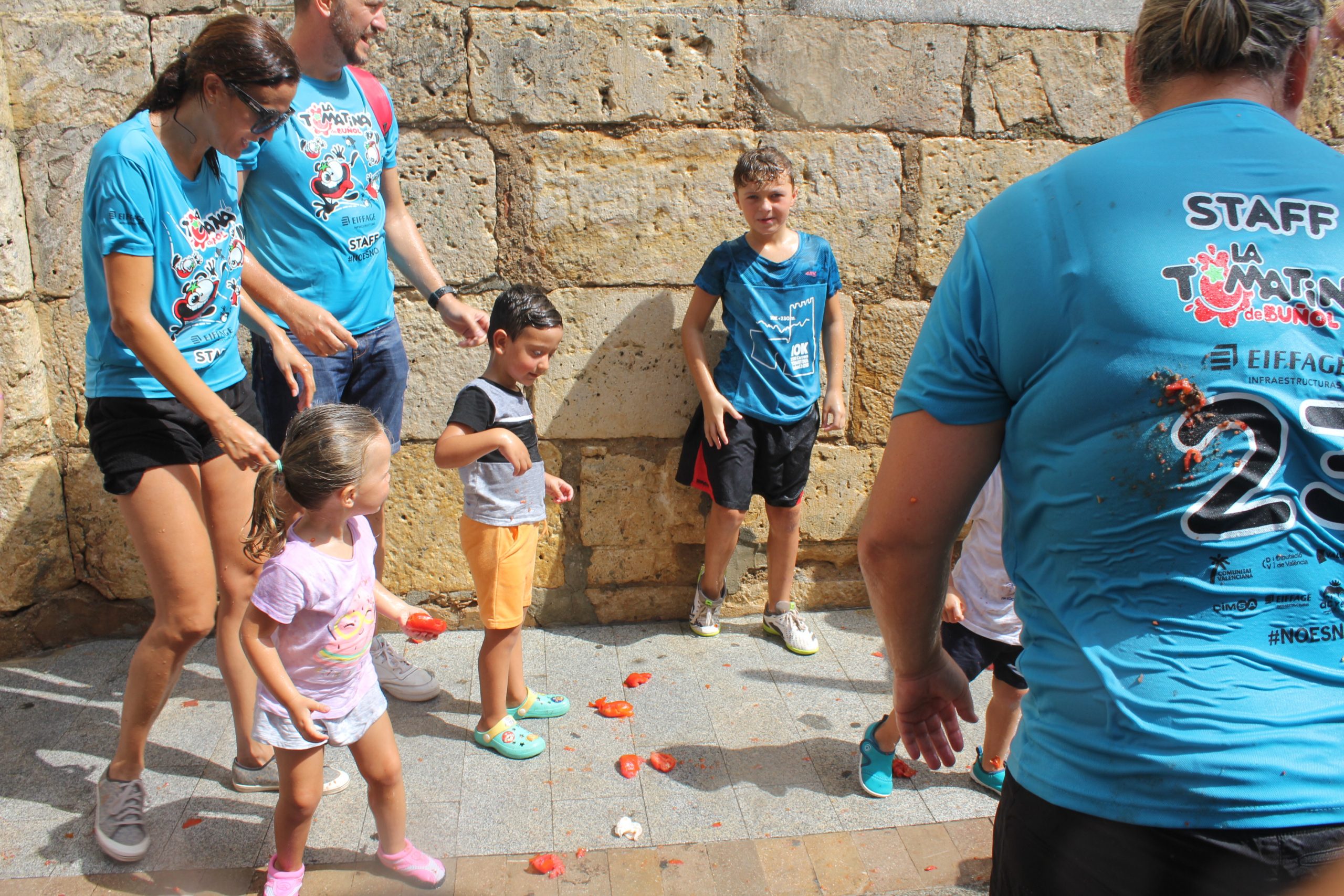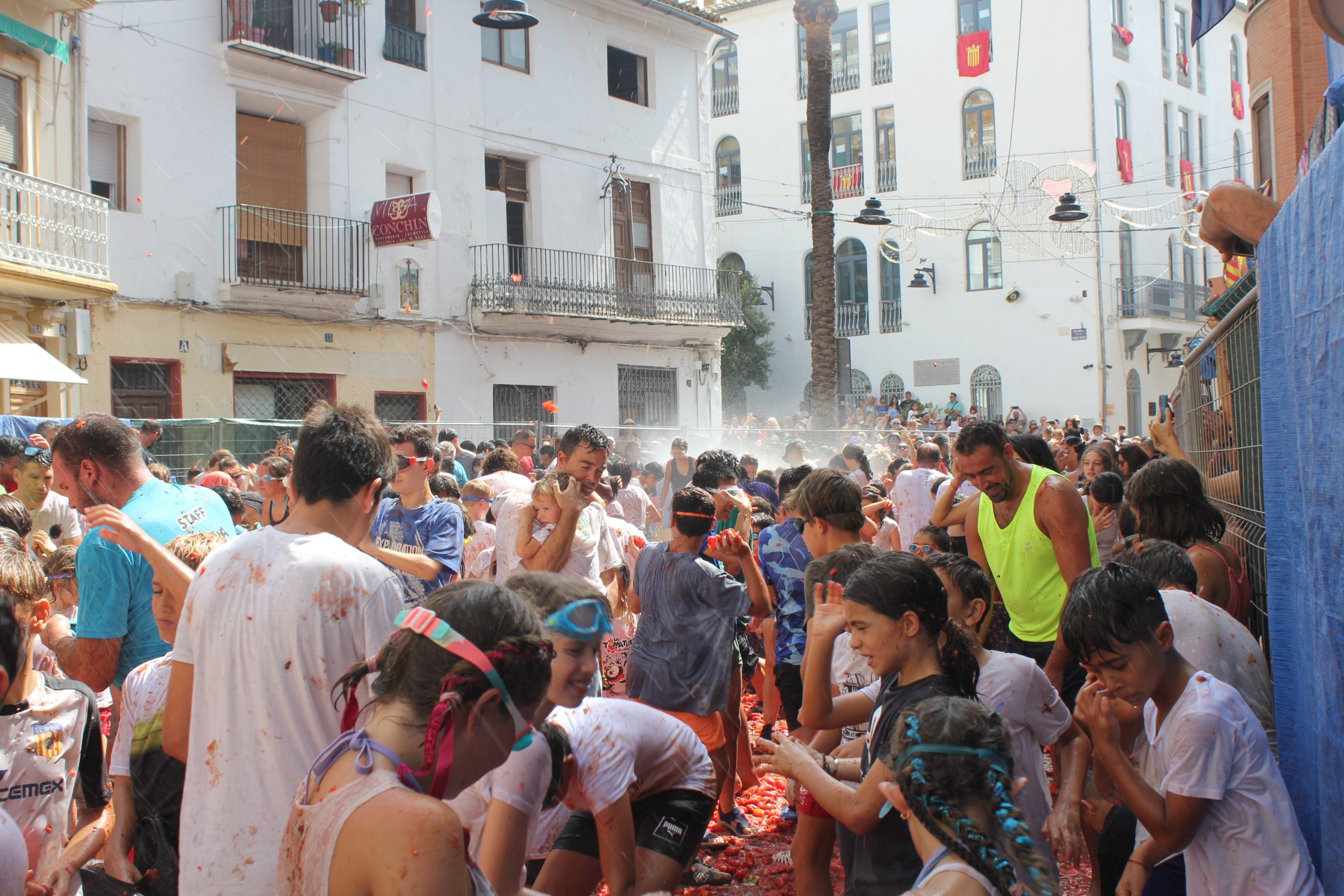 La Plaza del Pueblo de Buñol acogió a gran cantidad de niños y niñas que vivieron momentos de felicidad rodeados de 8.000 kilos de tomates. Los colaboradores y los trabajadores del Ayuntamiento de Buñol se encargaron de que todo discurriese.
