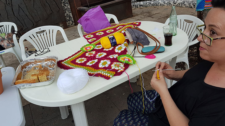 Desdelas 17h, las participantes, instaladas en un tablero y con sus agujas en ristre, además de tejer las pulseras LGTB confeccionaron otra serie de productos y pasaron una tarde muy agradable y en muy buena sintonía. Además, esta actividad llamó la atención de todos los que pasaban por la Plaza del Pueblo.