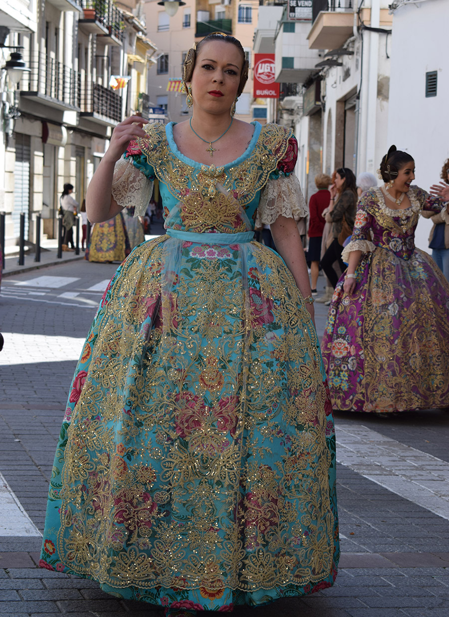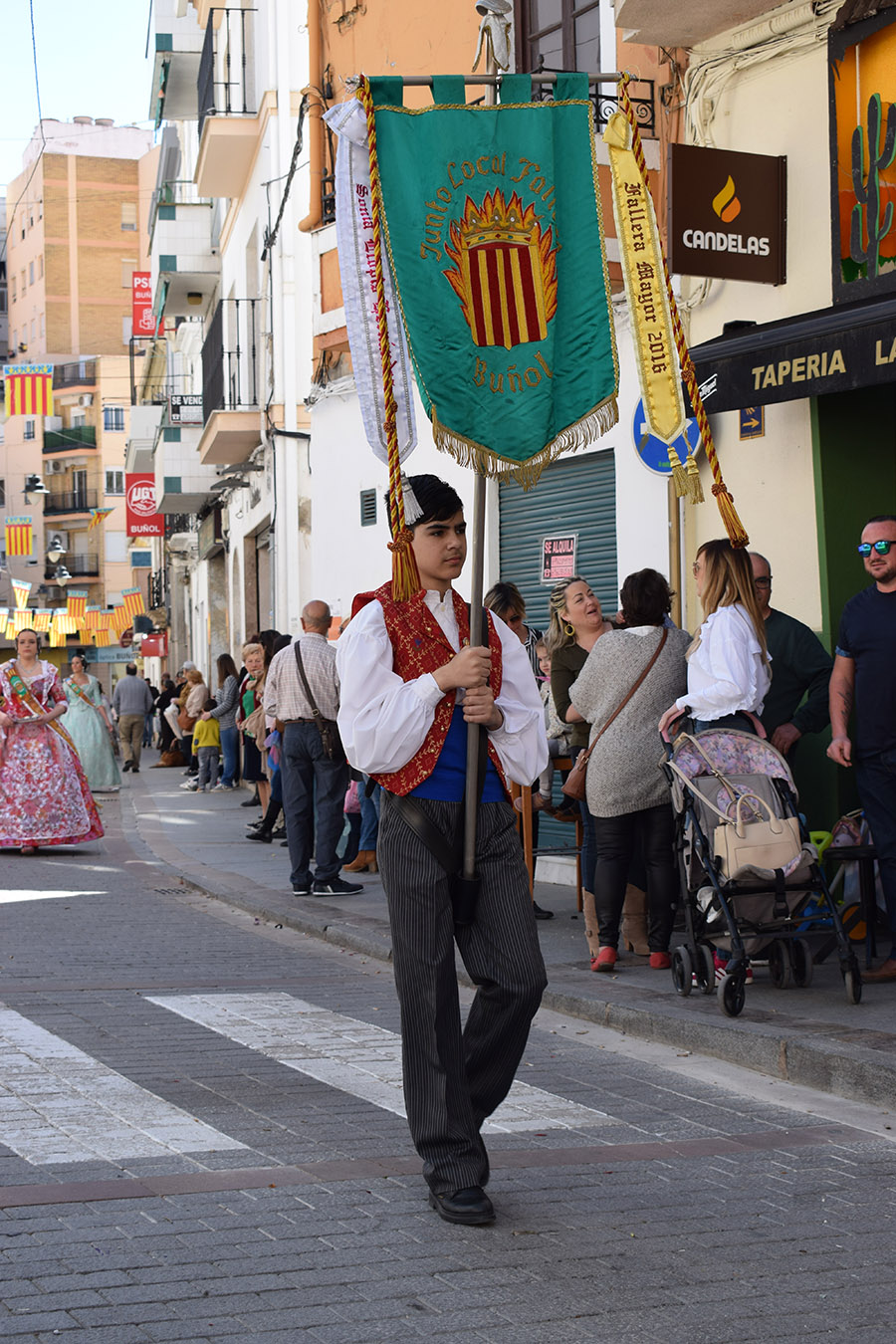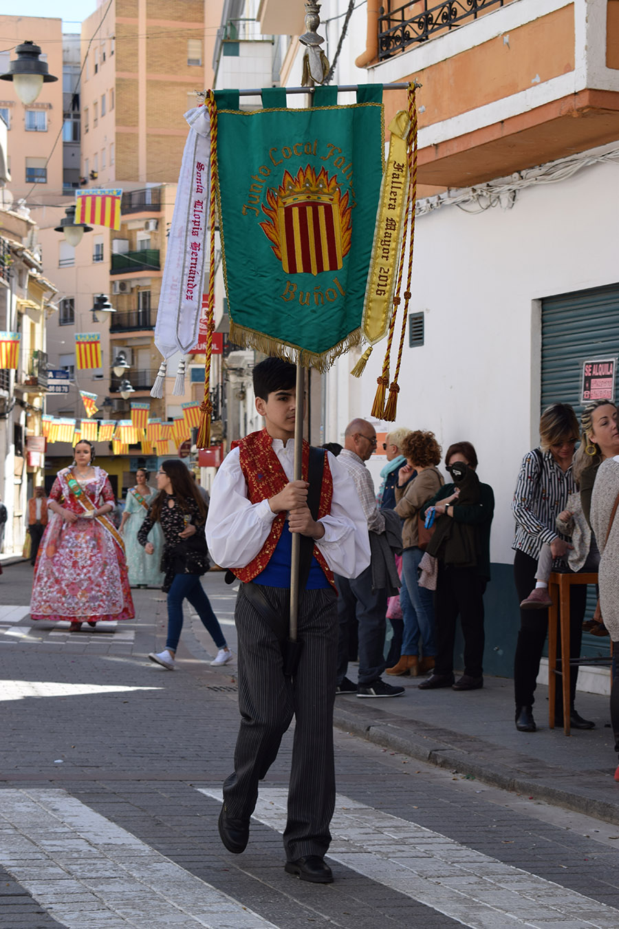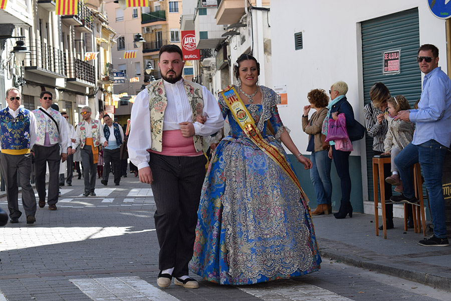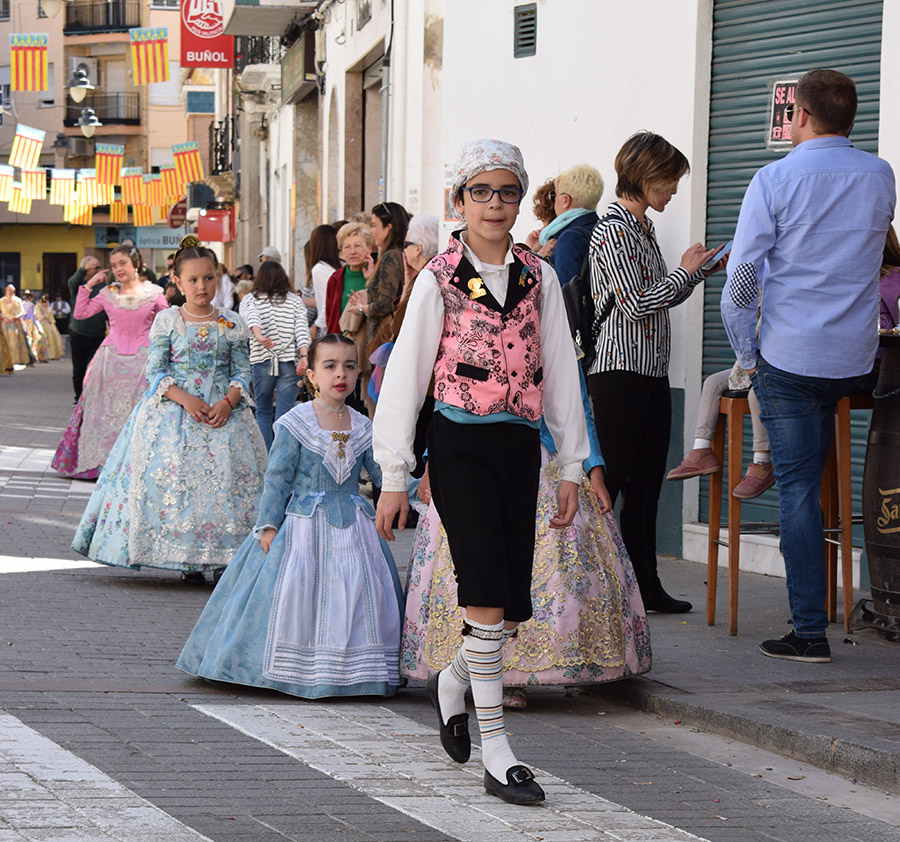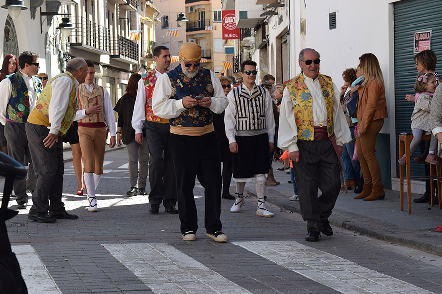 En una mañana más que agradable, las charangas y falleros y falleras han puesto color a las calles de Buñol, que estaban llenas de vecinos y vecinas que han arropado a las comisiones con sus aplausos. En cada parada, todas las comisiones se han realizado la foto de familia junto al monumento y han seguido su recorrido. Una vez han terminado, de nuevo vuelta a barracón, para coger fuerzas de cara a lo que les espera por la tarde, que es el acto más especial para los falleros y falleras, la ofrenda.