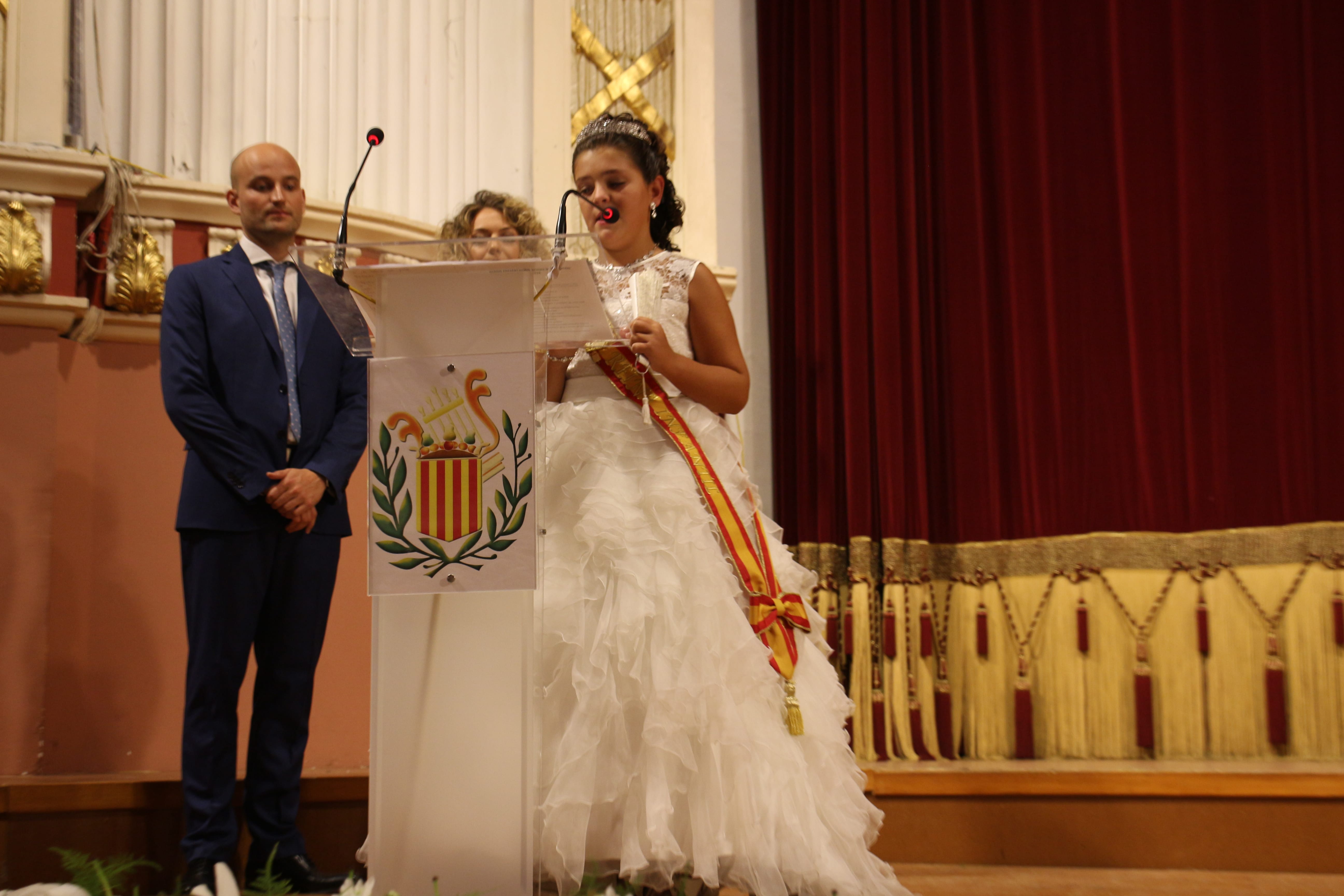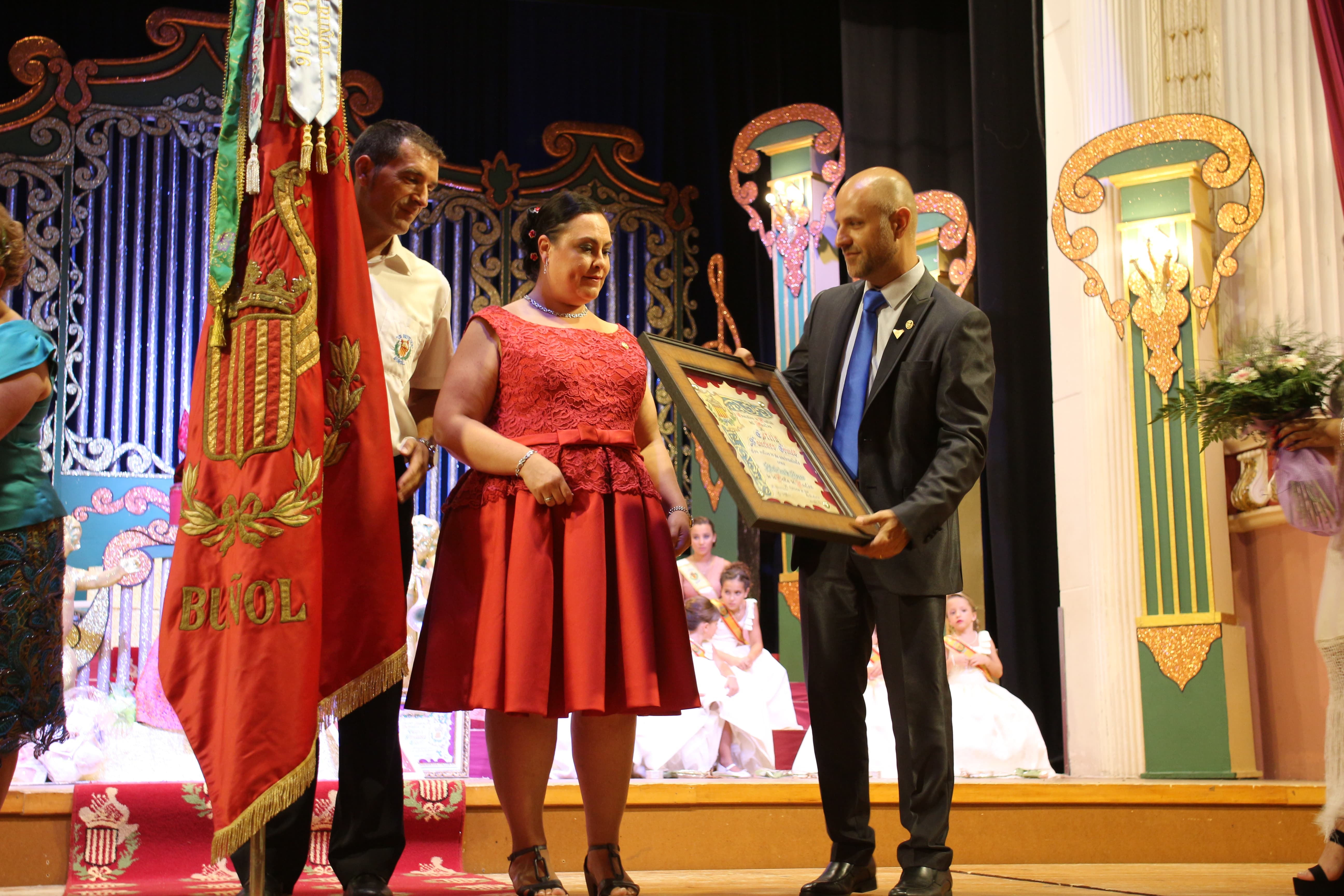 En primer lugar salió, acompañada de su abuelo, Nuria García Lambiés, la que va a ser Representante de la sociedad en la Corte de Honor de la Reina de la Feria y Fiestas de Buñol. Más tarde fue el turno de Valeria Fernández Espert , que del brazo de su hermano padre, subió al escenario. Finalmente, la Reina del Mantón, Irene Sierra Sáez, también del brazo de su padre, subió al escenario, donde saludó al respetable llena de alegría por cumplir un sueño desde pequeña. Por otro lado, se despidió a Carla y a Claudia como Reinas del ejercicio anterior, así como a Mariví, que dejaba su cargo como Representante.