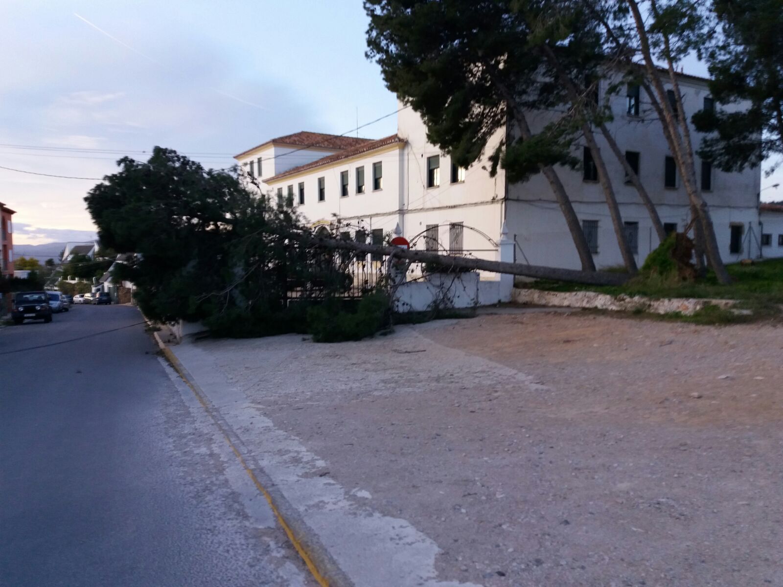 No obstante, antes a las 6:45h, la Calle Ruiz Pons ha tenido que ser cortada por la caída de un pino, que además ha afectado a un vehículo que iba circulando, aunque afortunadamente solo se han registrado daños materiales. Según el Inspector Jefe de la Policía Local, Antonio Zanón, «la vía ha sido cortada durante media hora mientras los Bomberos procedían a la retirada del árbol de la calzada«.