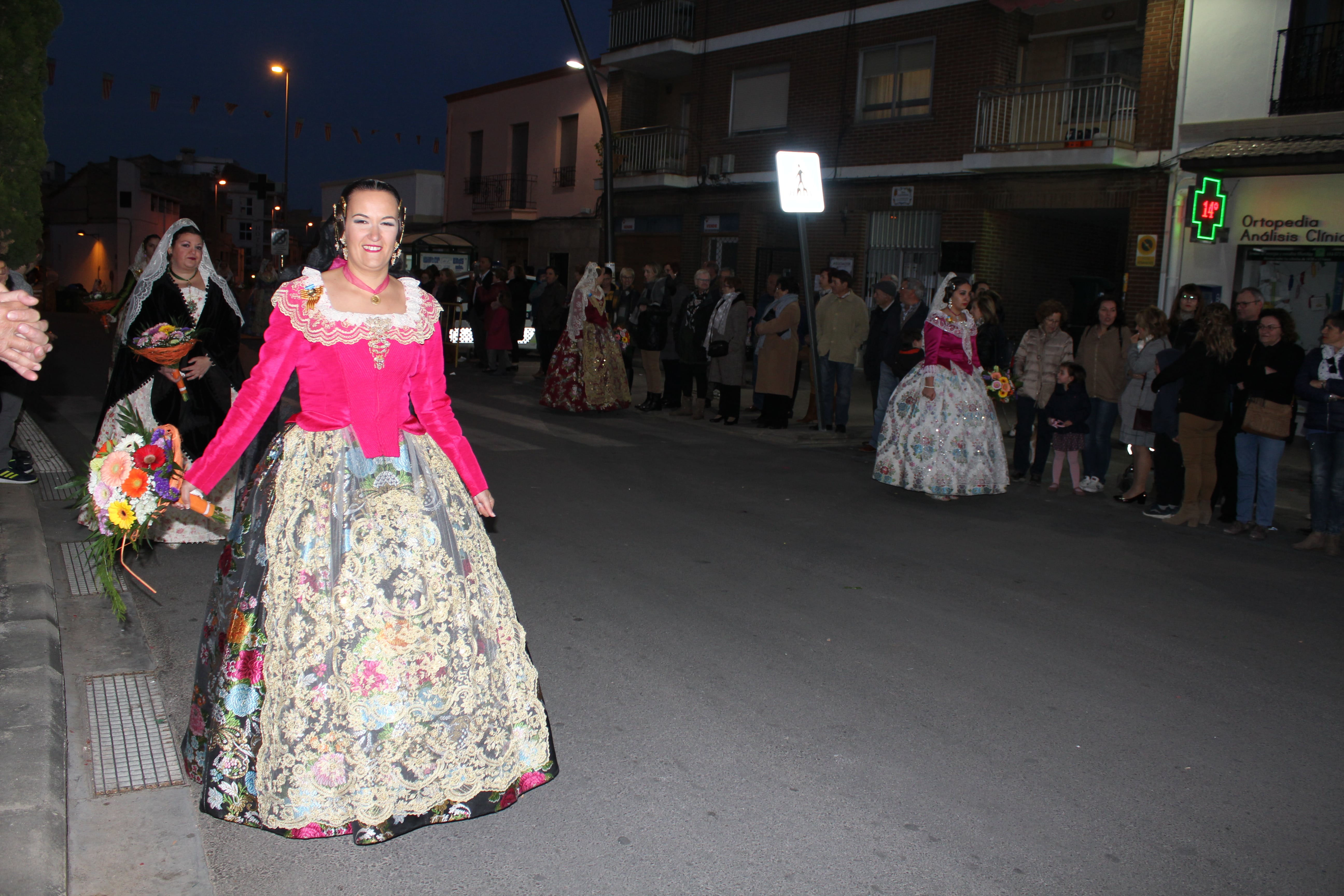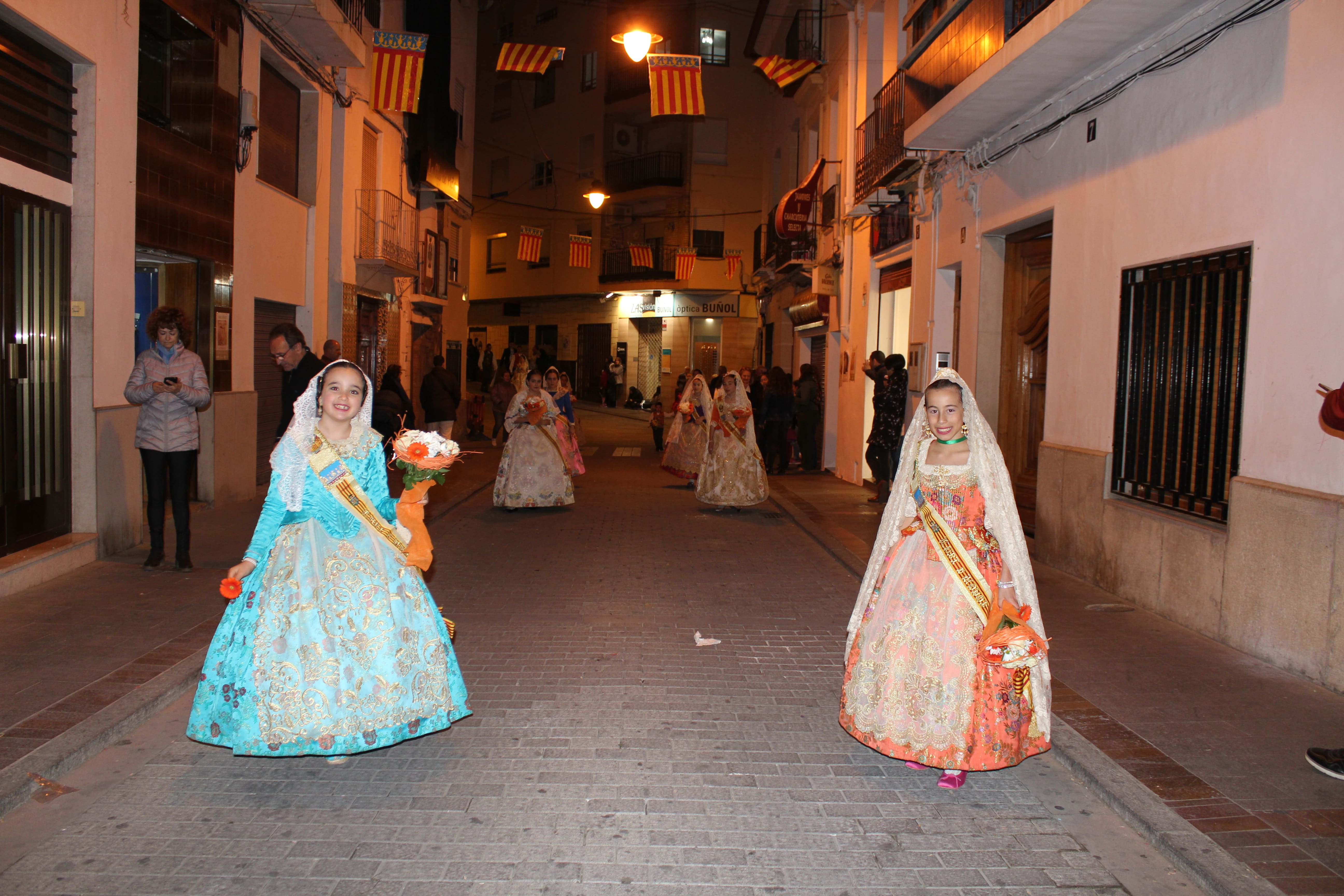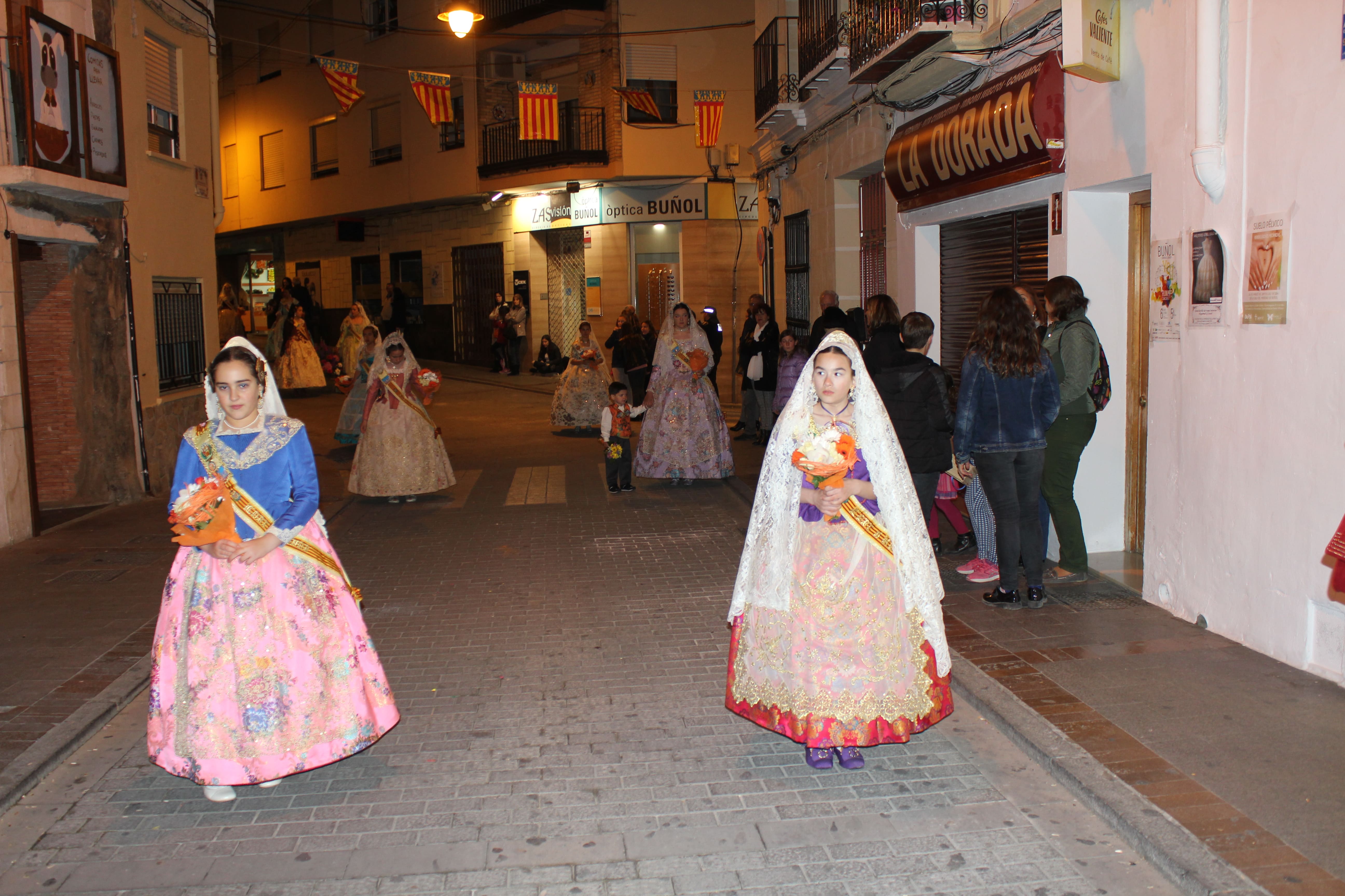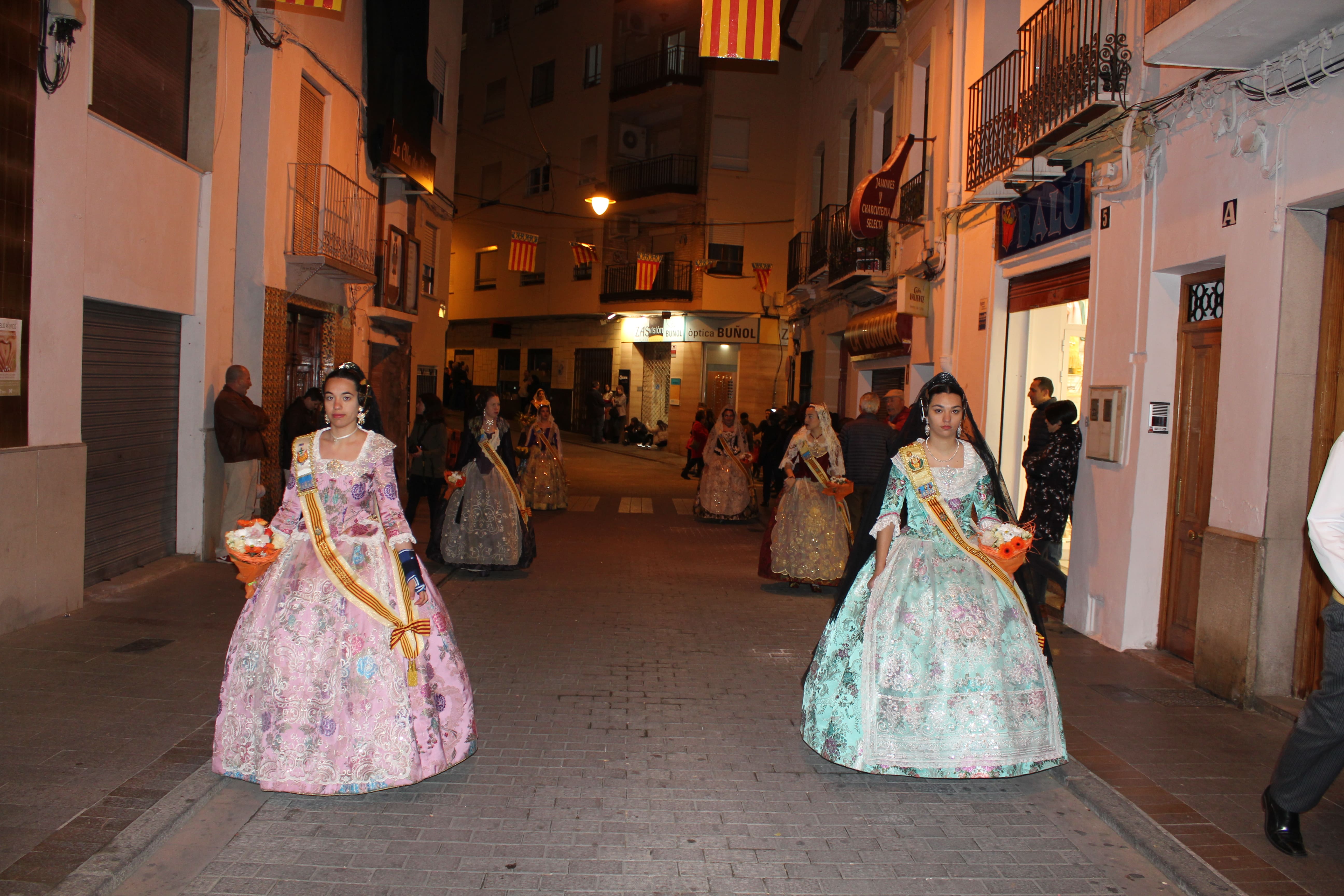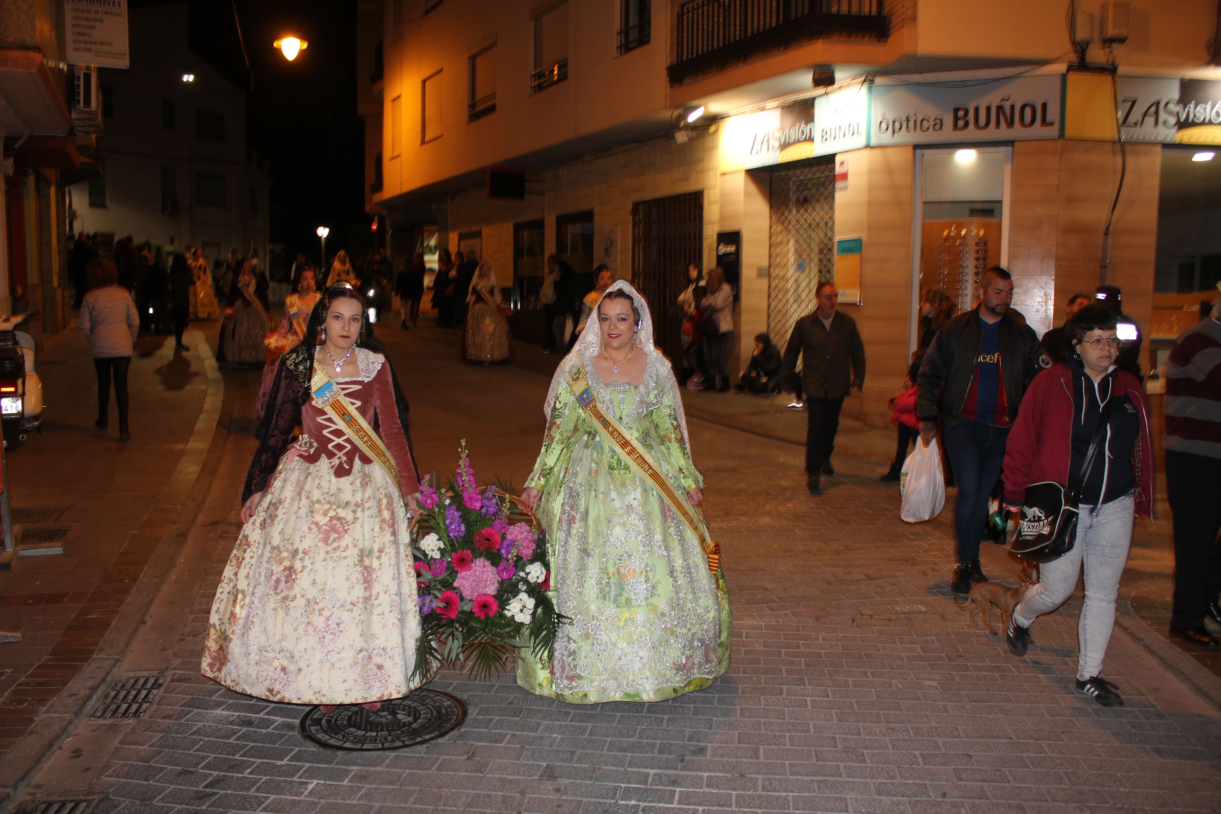 Más tarde, la Fallera Mayor de la Junta Local se trasladó rápidamente a la Avenida de la Violenta desde donde partió la otra de las ofrendas. En esta participaron las fallas Nuevo Buñol, Buñol Pueblo y Reyes Católicos, que han depositado sus ramos, centros y flores, en el retablo colocado en la Iglesia de San Pedro Apóstol, dedicado a la Virgen de los Desamparados. Lara Risueño y Sheila Romero, de Nuevo Buñol, Amparo Gómez, de Reyes Católicos y Claudia Gasull, de Buñol Pueblo, vivieron su momento más especial de estas fiestas, tras ofrendar a la Virgen. Sin duda este es uno de los actos más emotivos de estas fiestas y en el que más participación por parte de todas las comisiones suele haber.