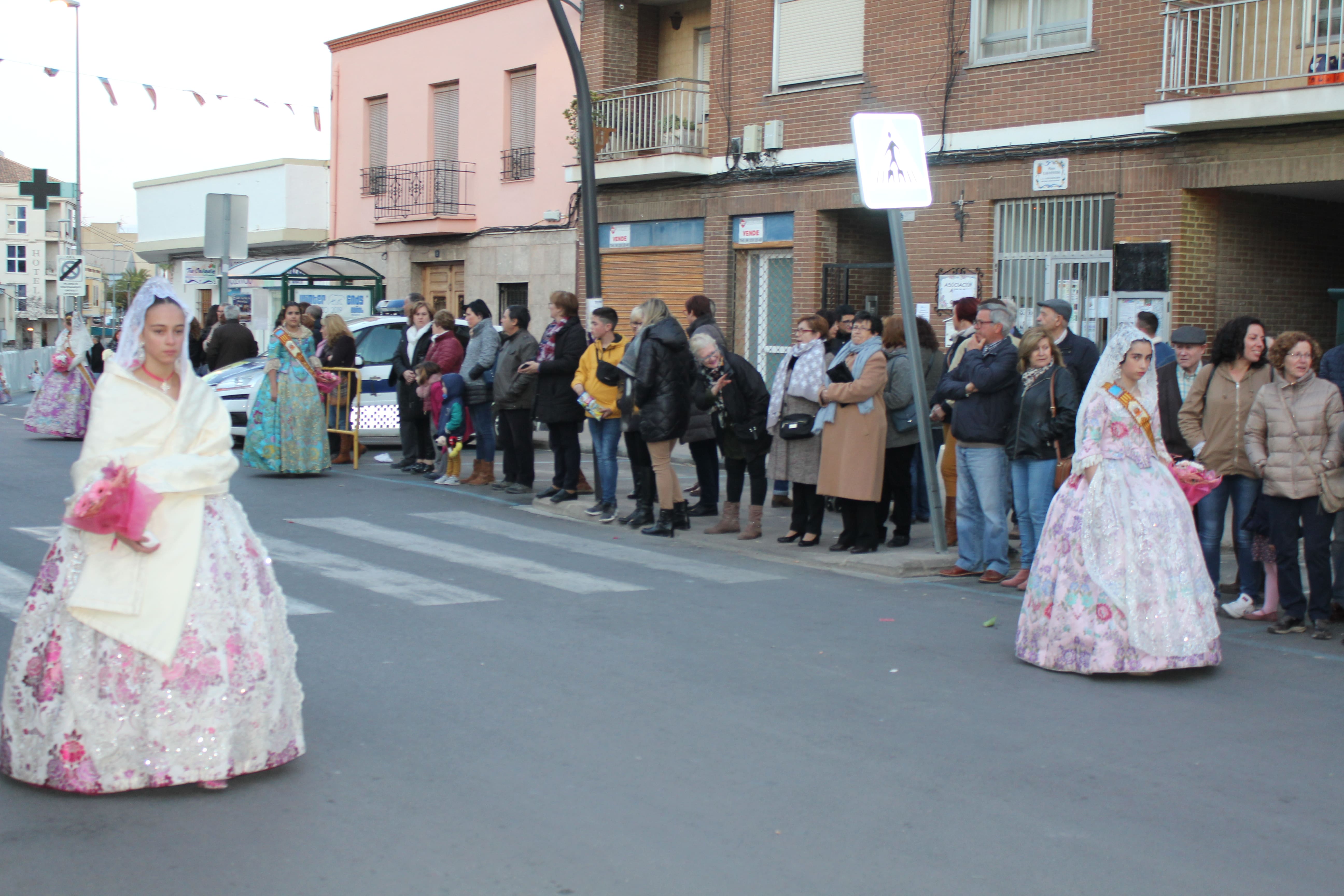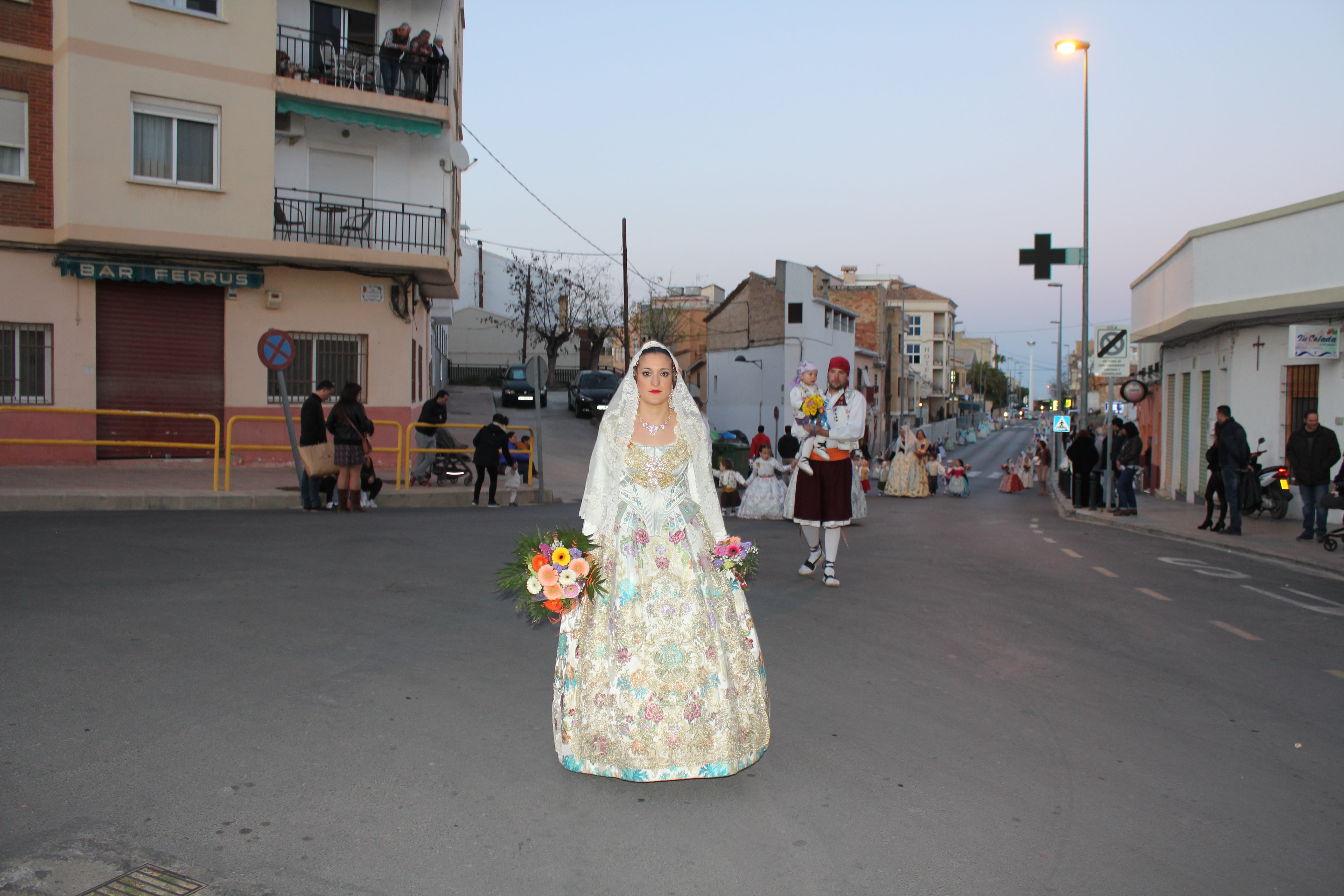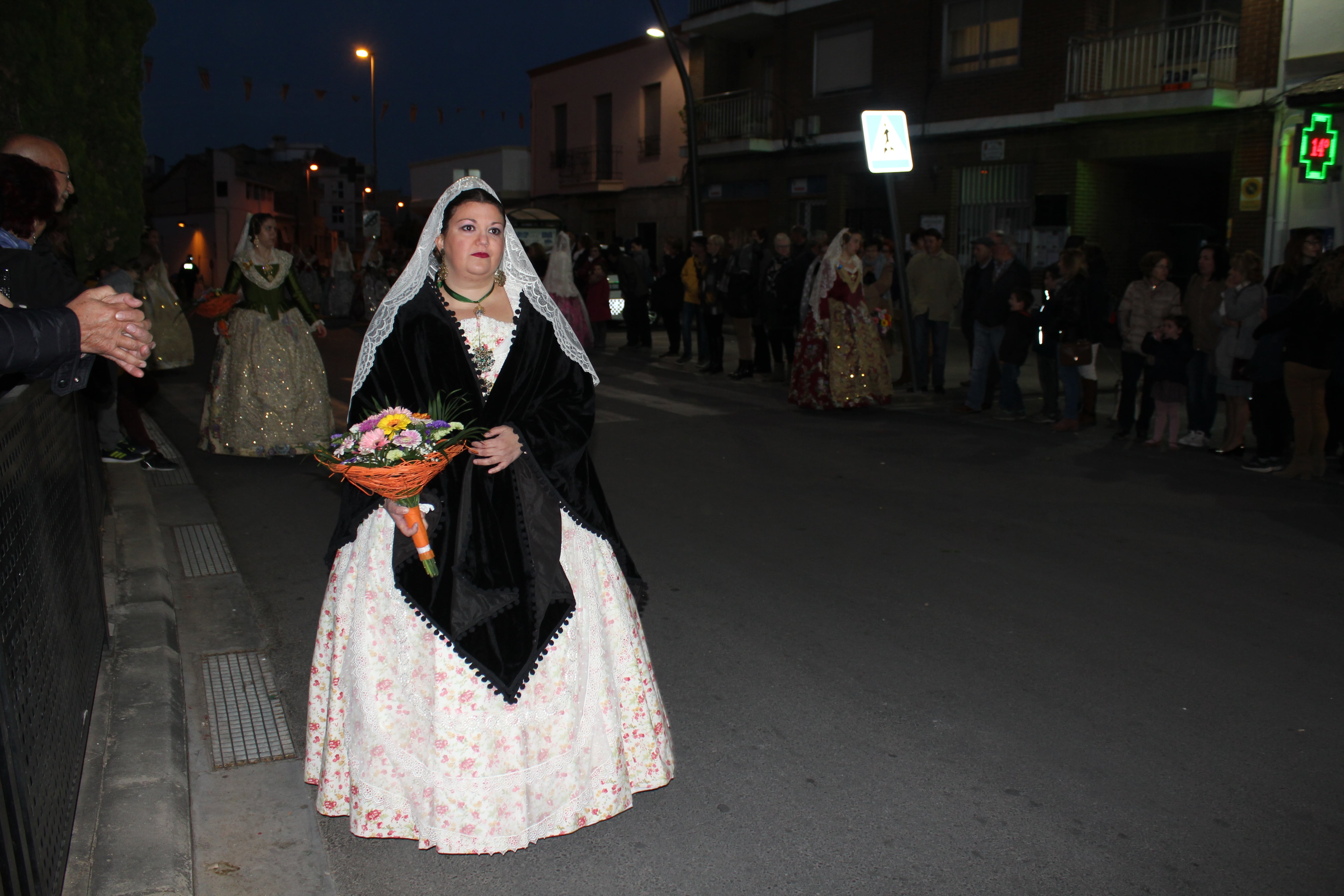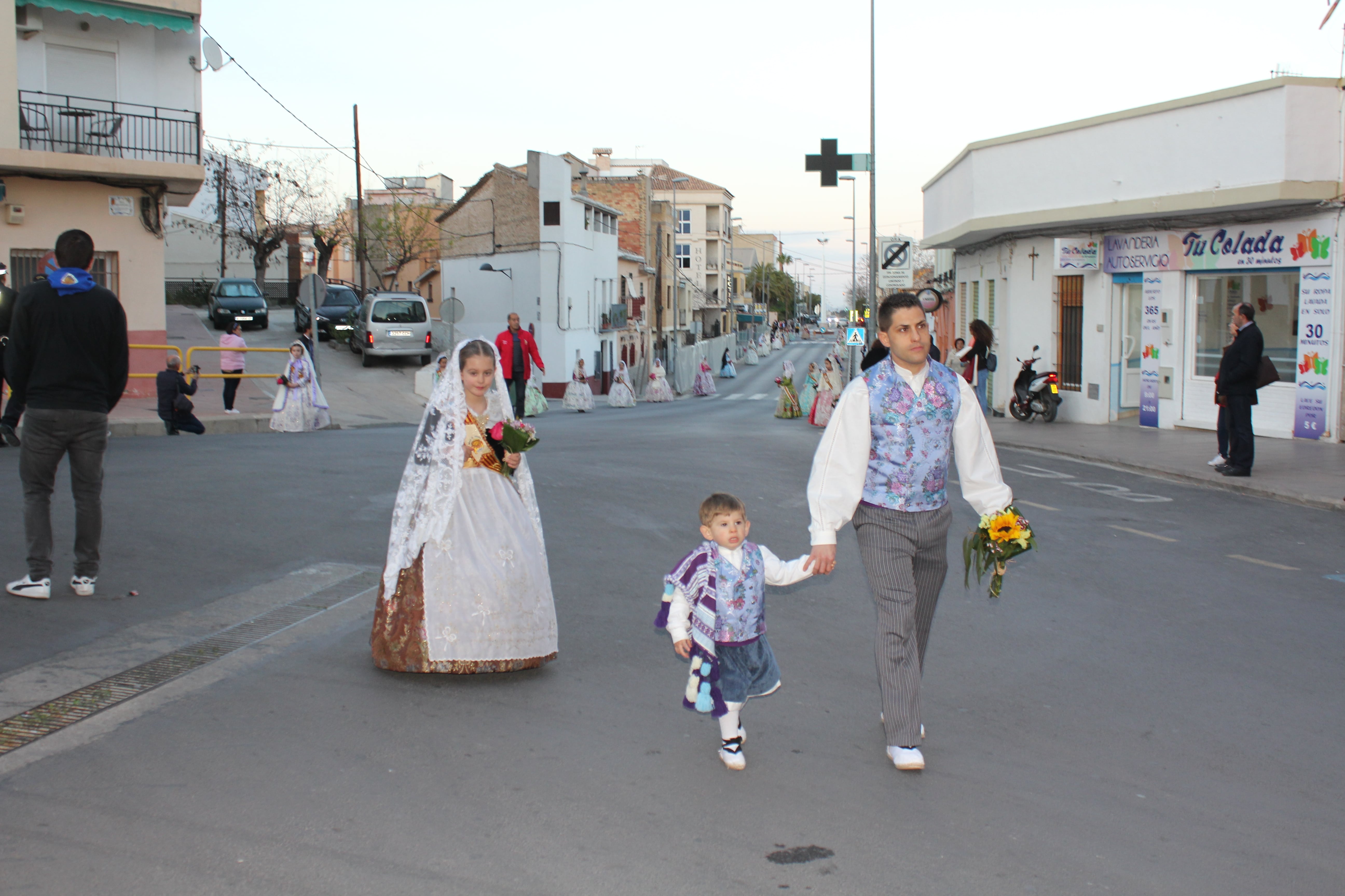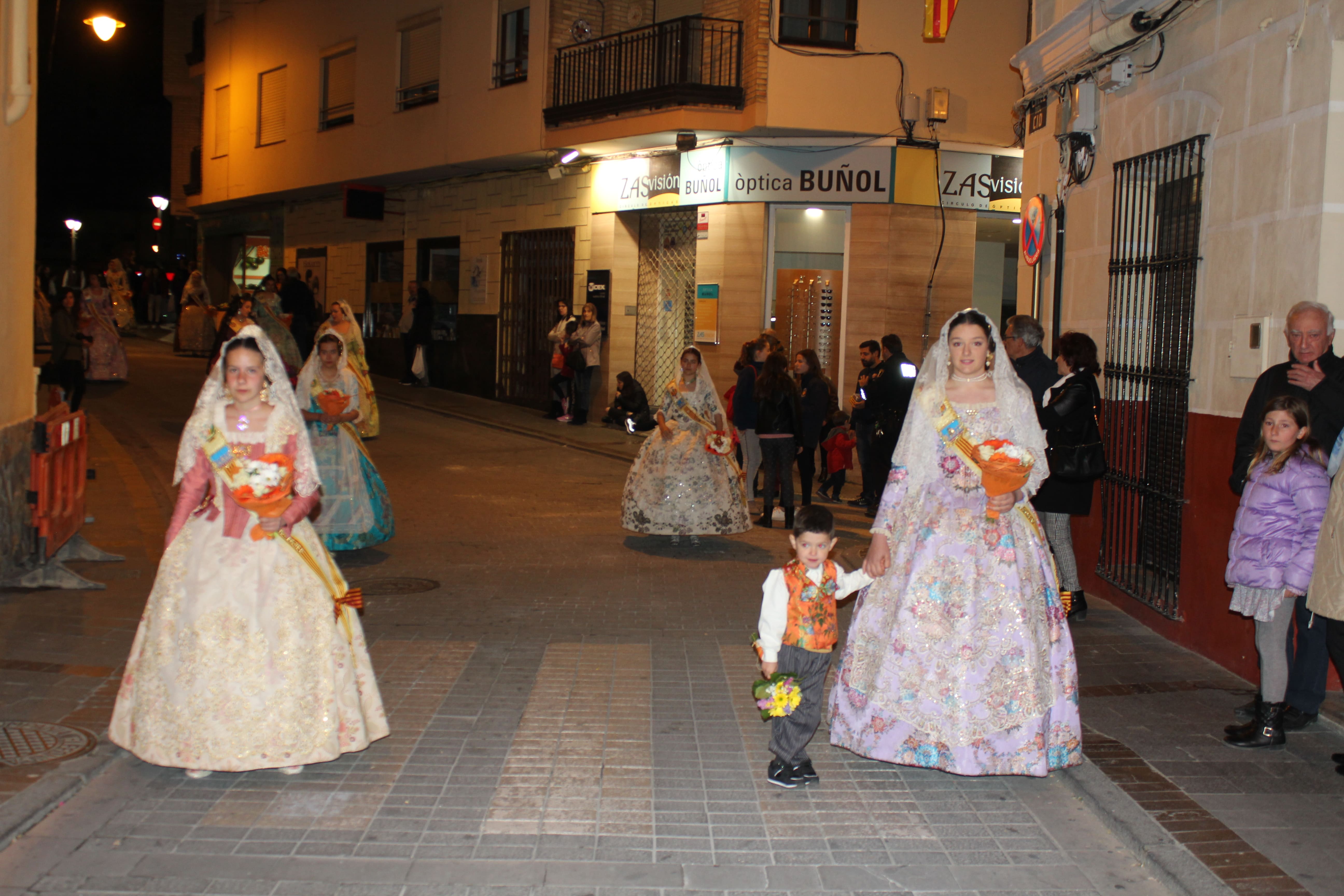 Más tarde, la Fallera Mayor de la Junta Local se trasladó rápidamente a la Avenida de la Violenta desde donde partió la otra de las ofrendas. En esta participaron las fallas Nuevo Buñol, Buñol Pueblo y Reyes Católicos, que han depositado sus ramos, centros y flores, en el retablo colocado en la Iglesia de San Pedro Apóstol, dedicado a la Virgen de los Desamparados. Lara Risueño y Sheila Romero, de Nuevo Buñol, Amparo Gómez, de Reyes Católicos y Claudia Gasull, de Buñol Pueblo, vivieron su momento más especial de estas fiestas, tras ofrendar a la Virgen. Sin duda este es uno de los actos más emotivos de estas fiestas y en el que más participación por parte de todas las comisiones suele haber.