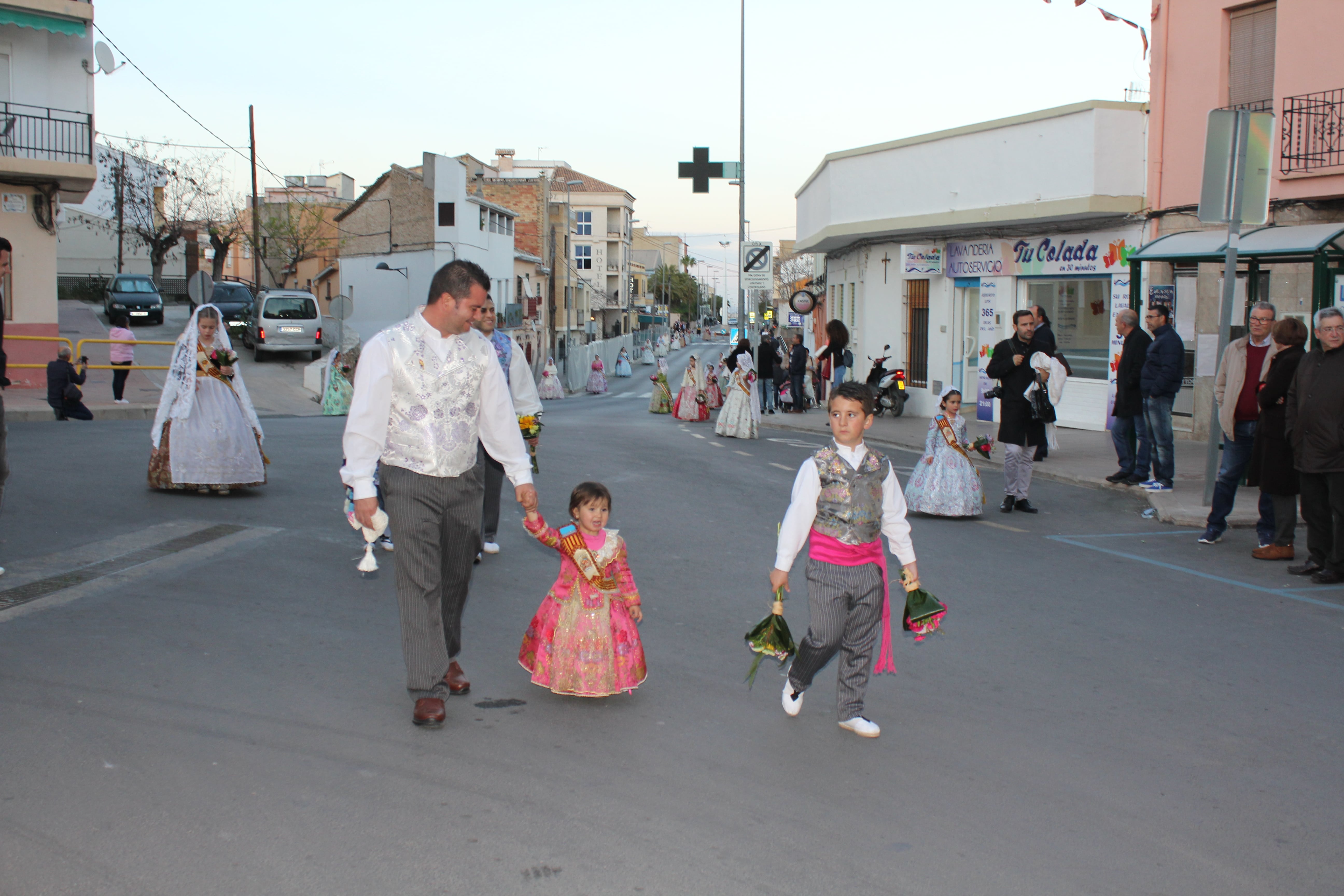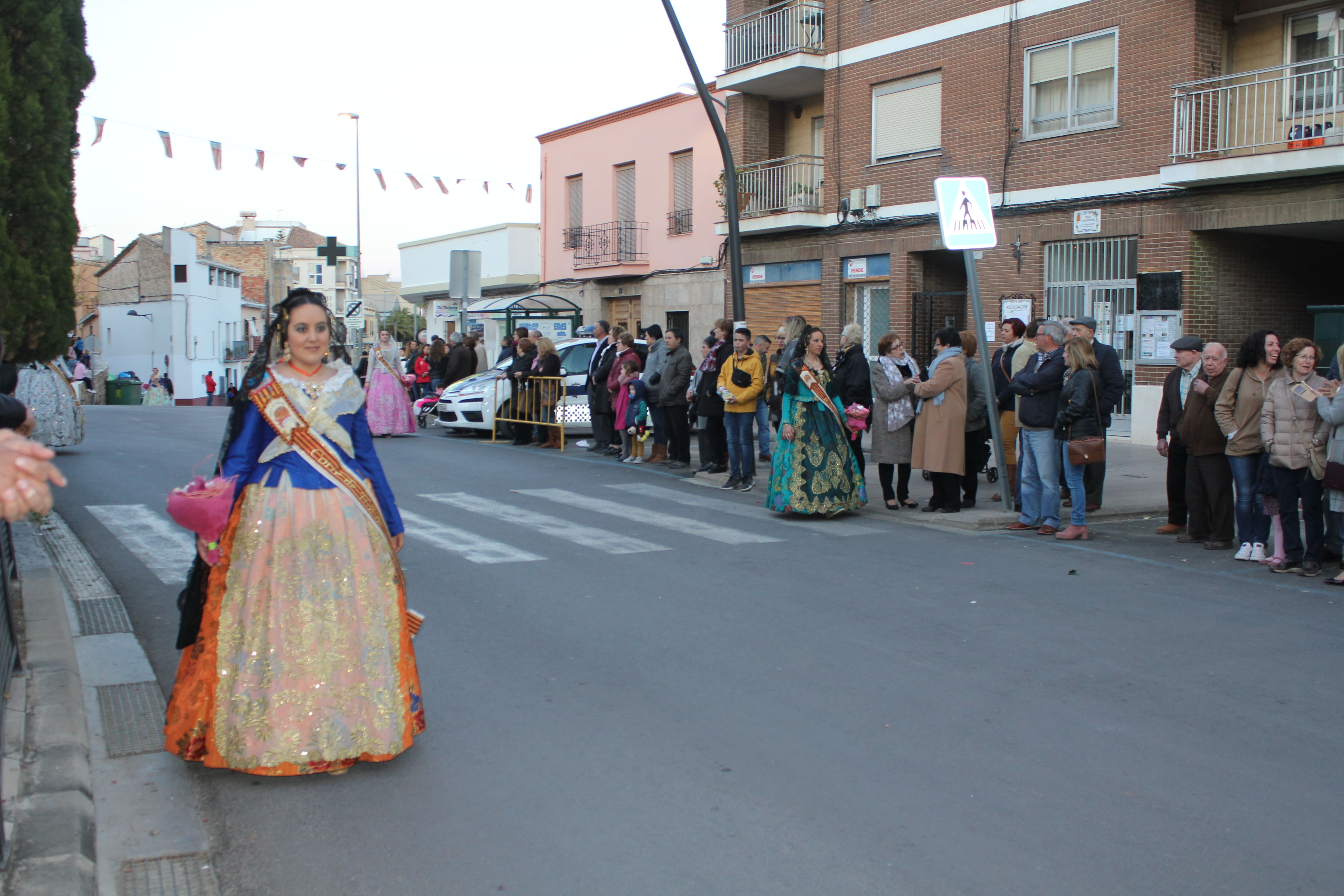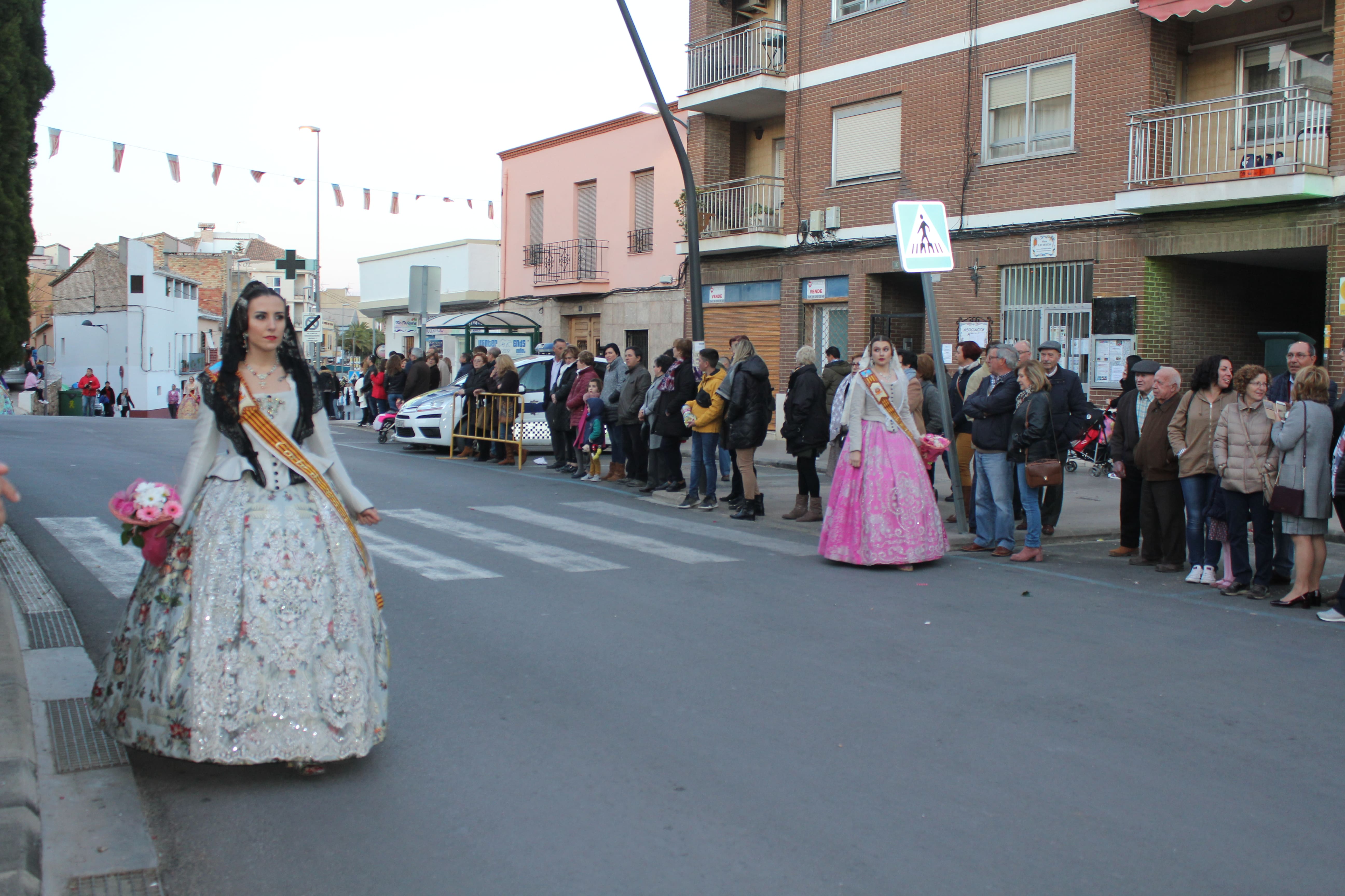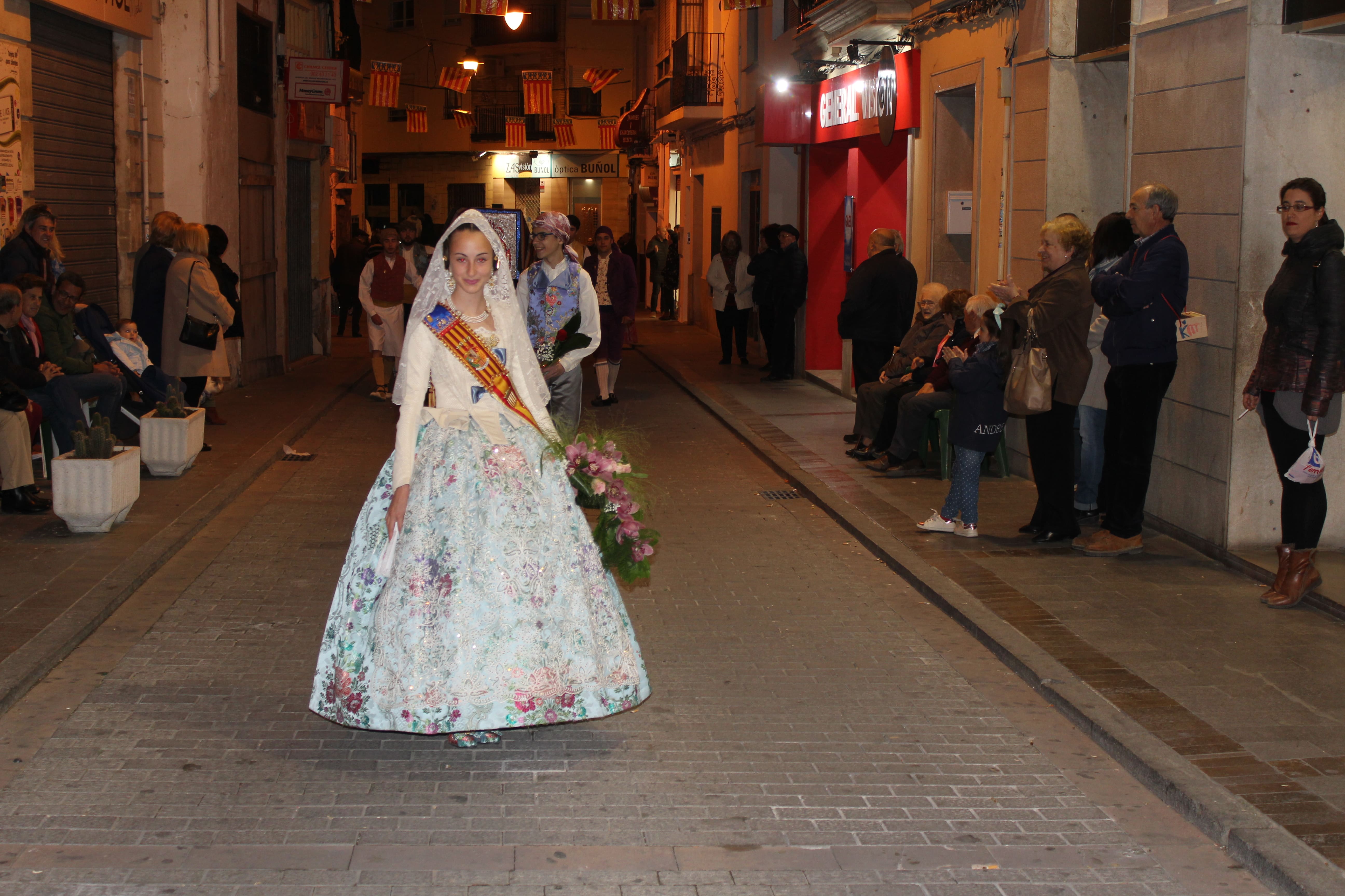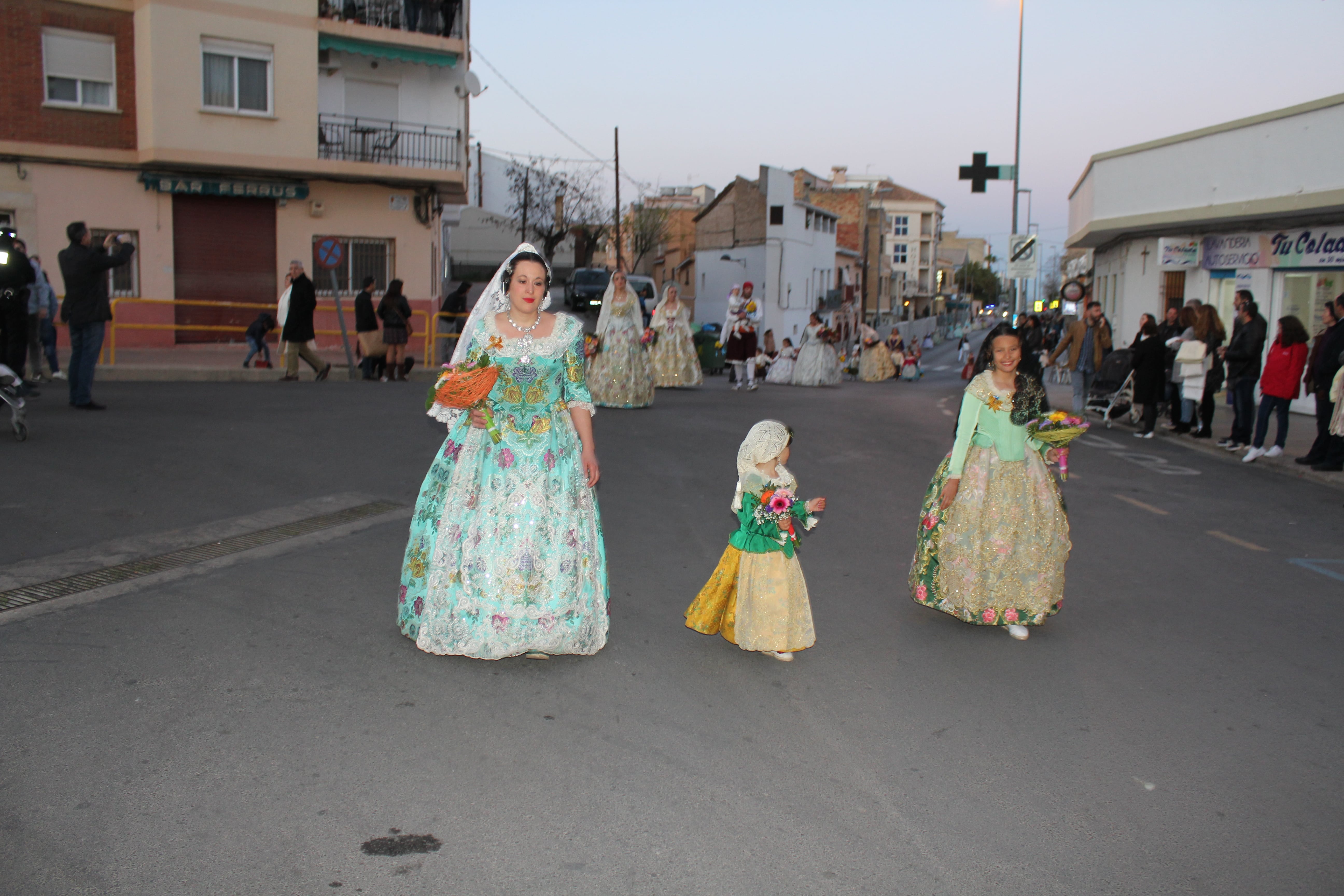 Más tarde, la Fallera Mayor de la Junta Local se trasladó rápidamente a la Avenida de la Violenta desde donde partió la otra de las ofrendas. En esta participaron las fallas Nuevo Buñol, Buñol Pueblo y Reyes Católicos, que han depositado sus ramos, centros y flores, en el retablo colocado en la Iglesia de San Pedro Apóstol, dedicado a la Virgen de los Desamparados. Lara Risueño y Sheila Romero, de Nuevo Buñol, Amparo Gómez, de Reyes Católicos y Claudia Gasull, de Buñol Pueblo, vivieron su momento más especial de estas fiestas, tras ofrendar a la Virgen. Sin duda este es uno de los actos más emotivos de estas fiestas y en el que más participación por parte de todas las comisiones suele haber.