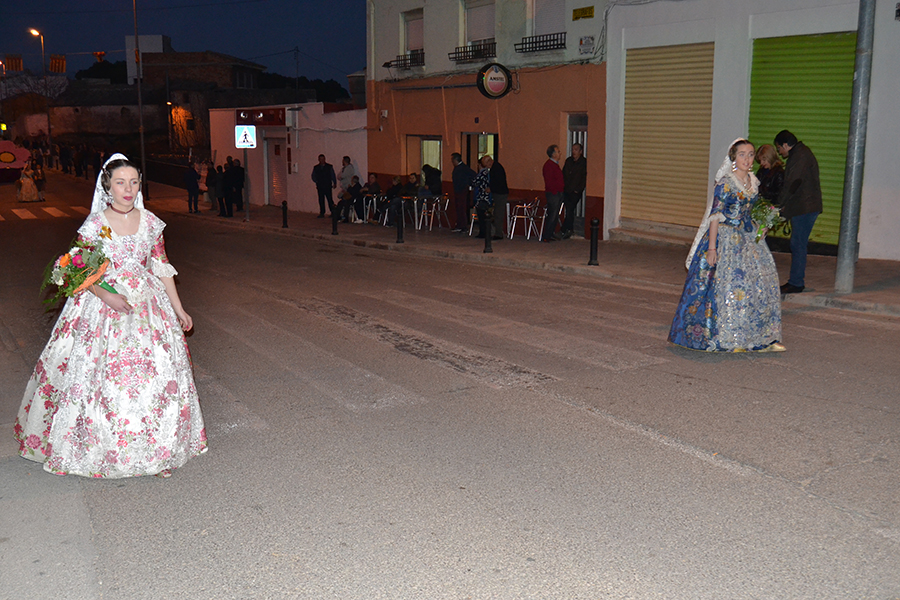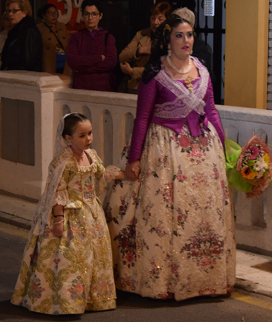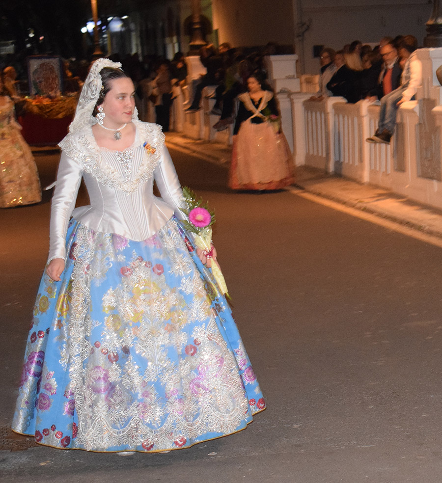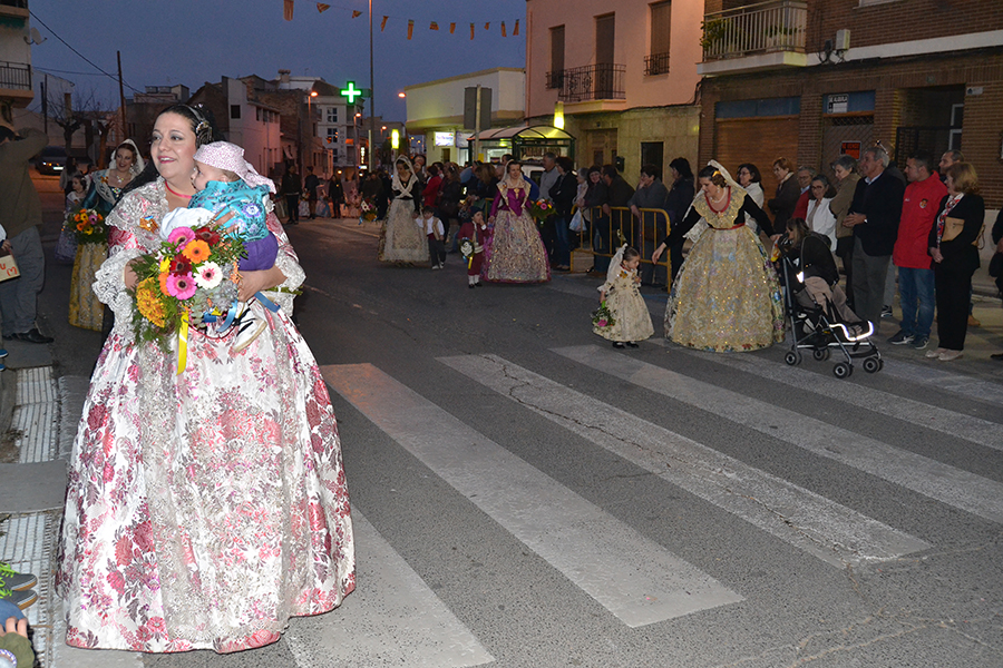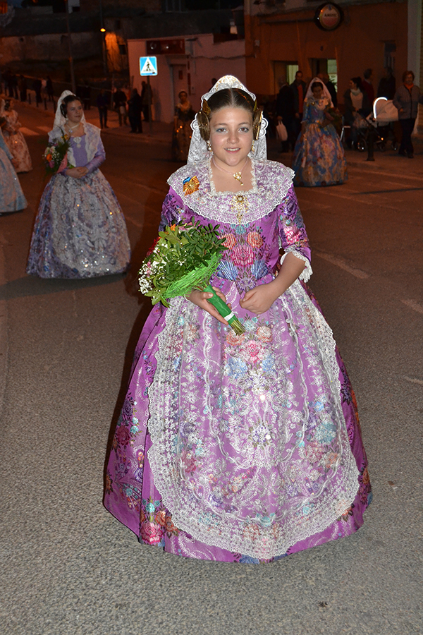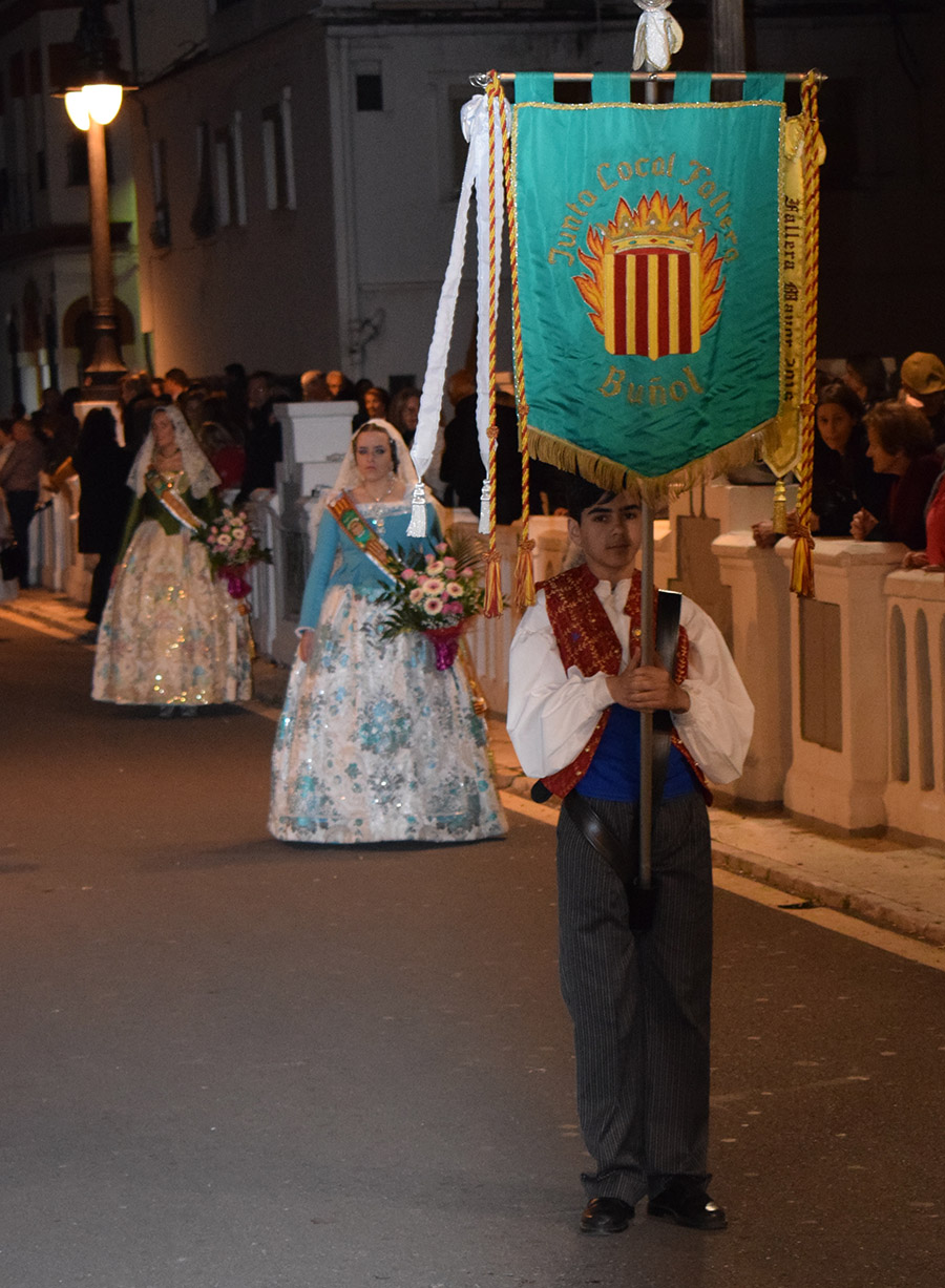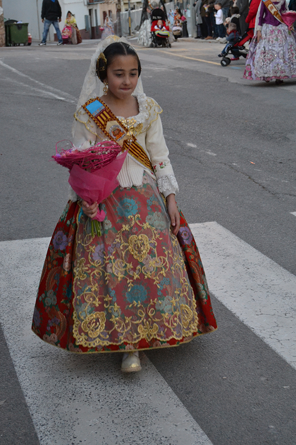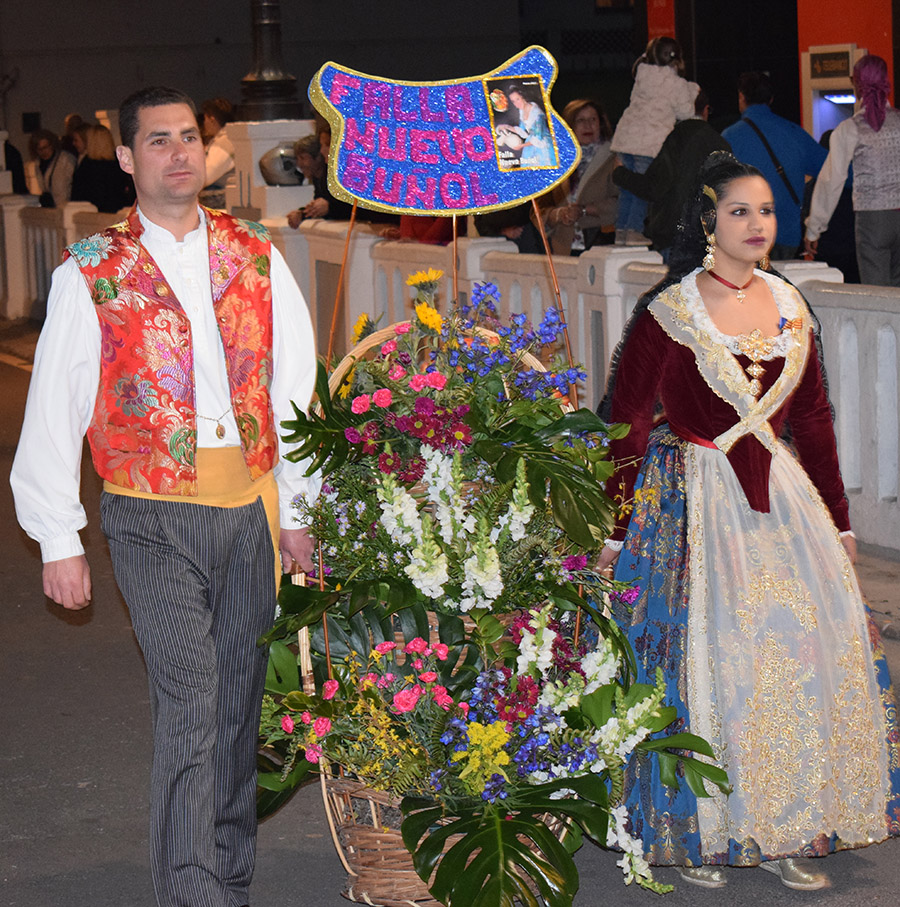 Las Fallas de Buñol han celebrado uno de los actos centrales más emotivos de las fiestas josefinas, la Ofrenda. Este año el acto ha comenzado en la Plaza Rivero,desde donde las comisiones de El Prado y Las Ventas, acompañados de la Fallera Mayor de la Junta Local, Sonia Llopis, que ha encabezado el desfile, han ofrendado a la Virgen de los Dolores. El “puente de la Venta”, así como la Calle Condes de Buñol estaban abarrotadas para observar a decenas de falleros y falleras, en una de las tardes más especiales de las fiestas Josefinas. Nuria Barbancho, llena de emoción depositó su ramo y más tarde se hizo la foto de familia con su comisión de El Prado. Igualmente emocionadas se mostraron, Aurora Medard e Isabel Guillamón de la comisión de Las Ventas, que repitieron instantánea con toda su familia fallera.
