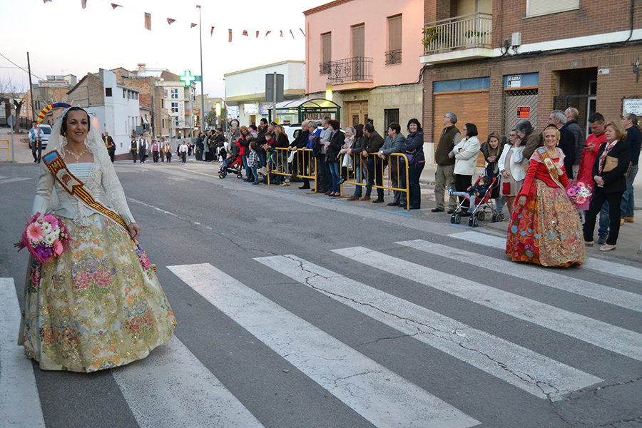 Más tarde, la Fallera Mayor de la Junta Local se trasladó rápidamente a la Avenida de la Violenta desde donde partió la otra de las ofrendas. En esta participaron las fallas Nuevo Buñol, Buñol Pueblo y Reyes Católicos, que han depositado sus ramos, centros y flores, en el retablo colocado en la Iglesia de San Pedro Apóstol, dedicado a la Virgen de los Desamparados. Estefanía Cuesta, de Nuevo Buñol, Silvia Sáez, de Reyes Católicos y Gracia Fuertes, de Buñol Pueblo, vivieron su momento más especial de estas fiestas, tras ofrendar a la Virgen. Sin duda este es uno de los actos más emotivos de estas fiestas y en el que más participación por parte de todas las comisiones suele haber.
