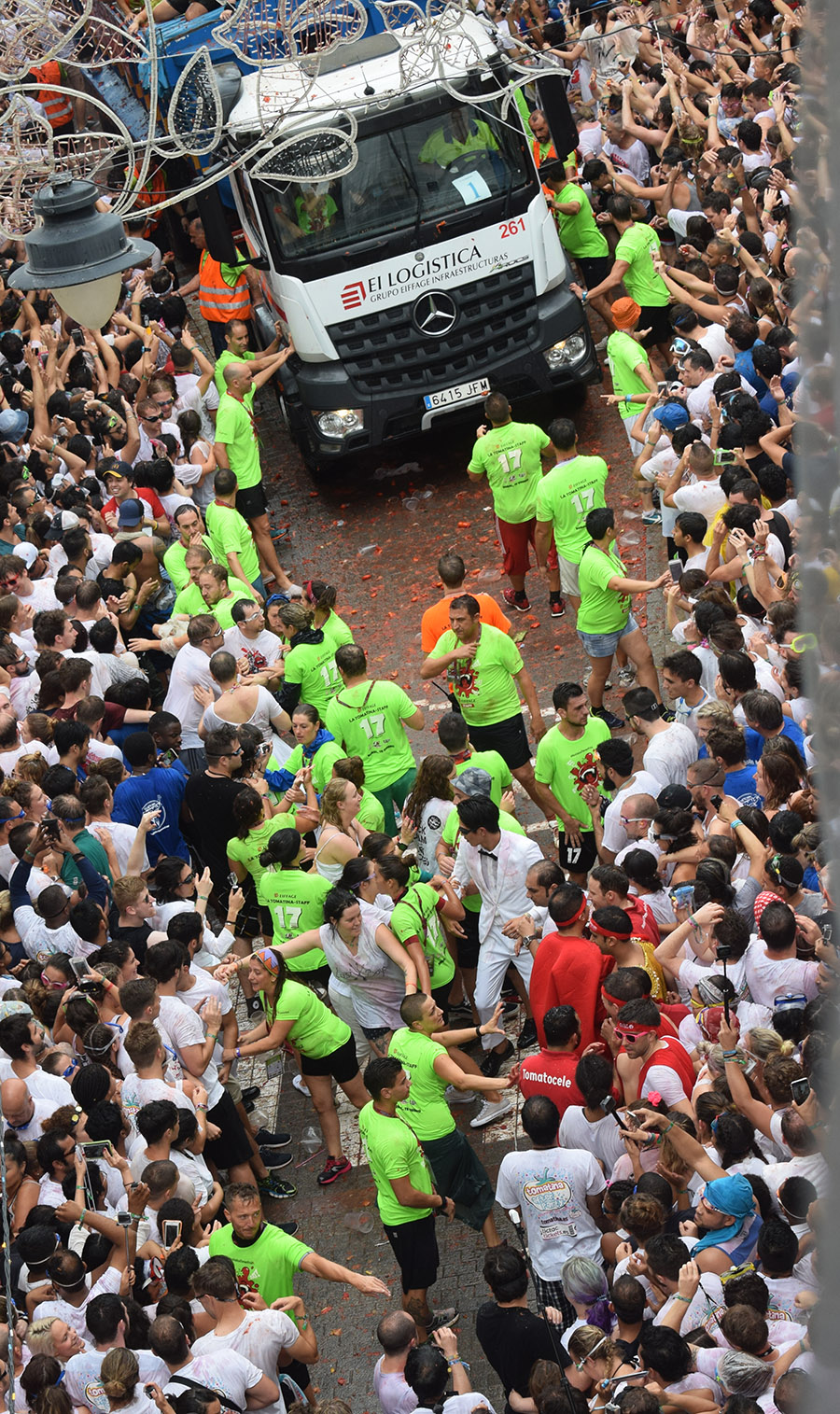 A las 11h sonó la carcasa que daba inicio a la Fiesta de Interés Turístico Internacional, aunque previamente los asistentes se divirtieron en la tradicional cucaña del «palo jabón». El primer camión llegó a la Plaza del Pueblo entre el clamor de los asistentes, que desesperadamente pedían tomate. El frío que se dejó notar a primera hora de la mañana, se transformó en calor, tras una intensa batalla de una hora en la que se descargaron más de 160 toneladas de tomate.