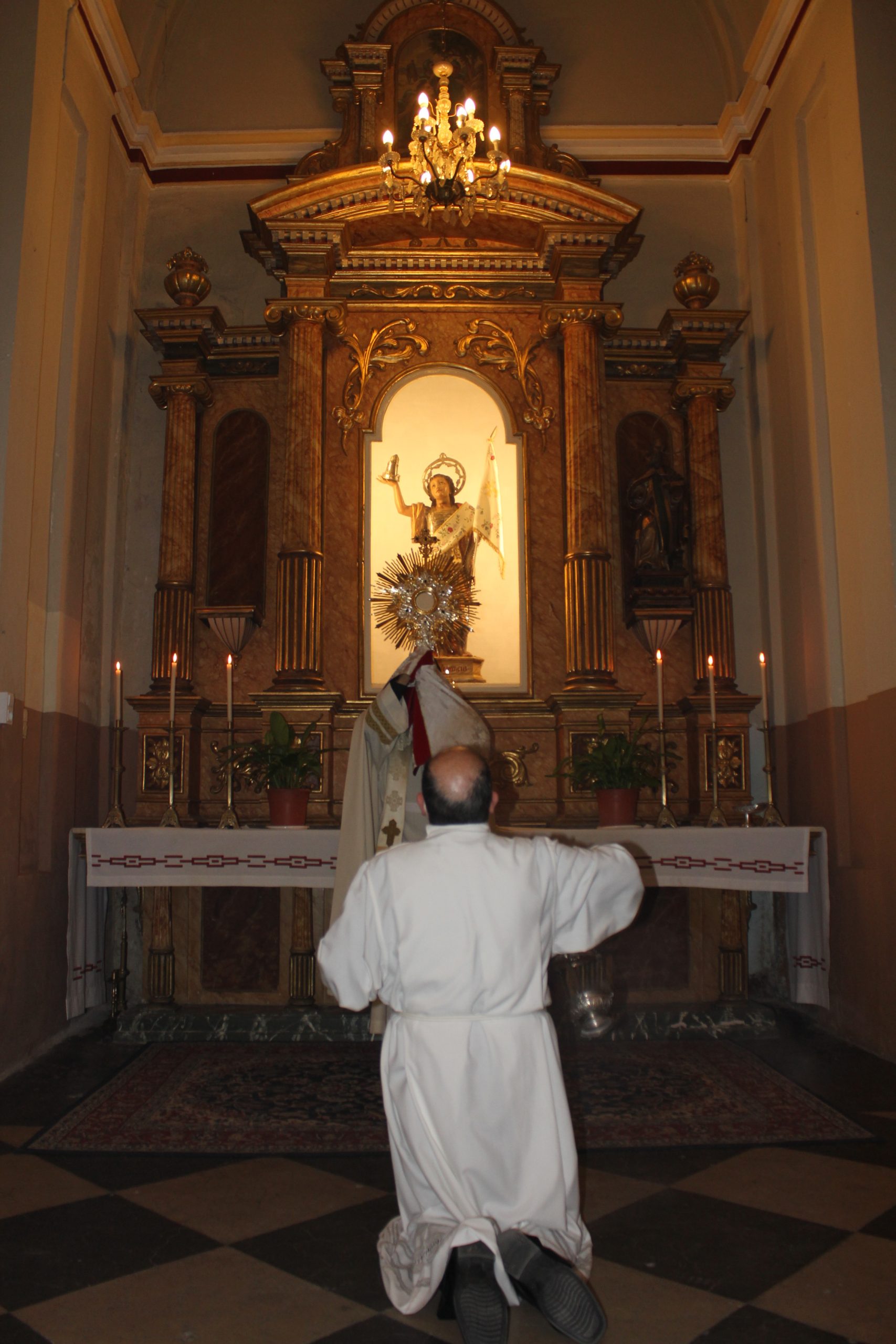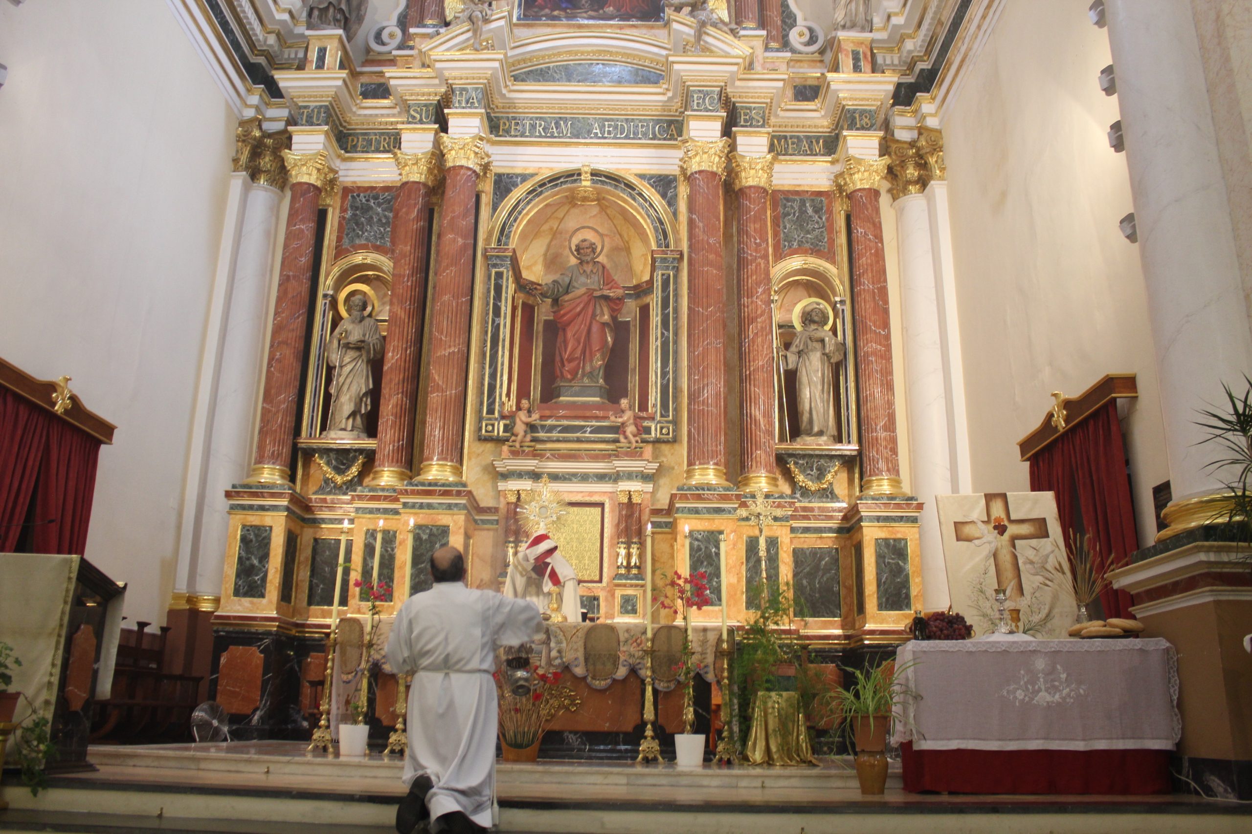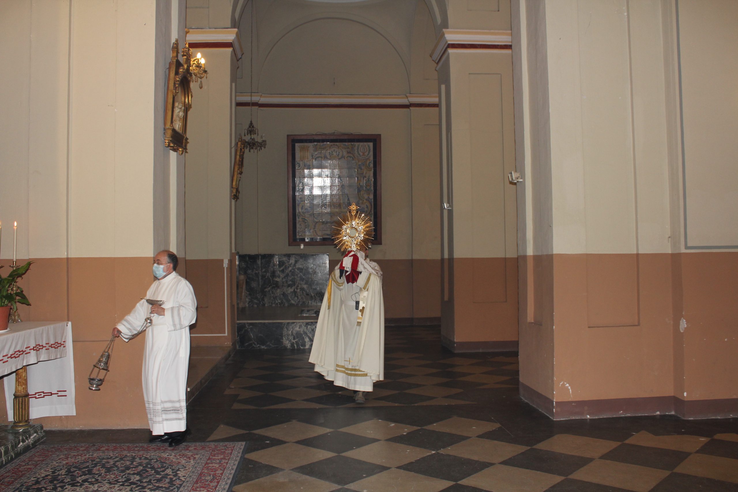 Durante el acto, la Custodia fue portada en la parroquia de San Pedro por el vicario de localidad Alirio y en todo el recorrido fue incensado el sacristán Luis Carrascosa. Por otra parte, en la parroquia Nuestra Señora de los Dolores ofició también el párroco de localidad Enrique Boronat, incensado el sacristán de la parroquia Pepe, siempre respetando las medidas de seguridad.