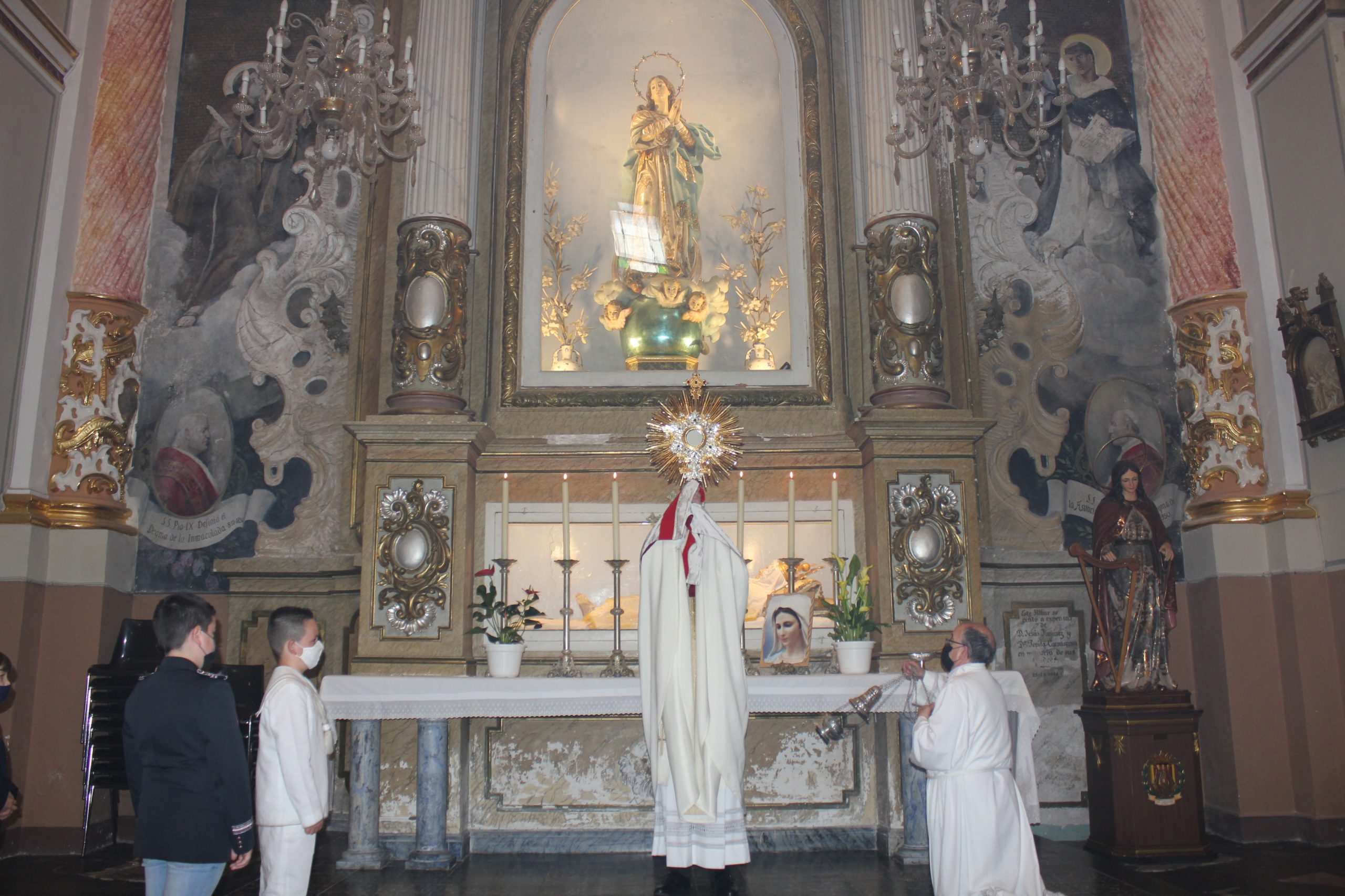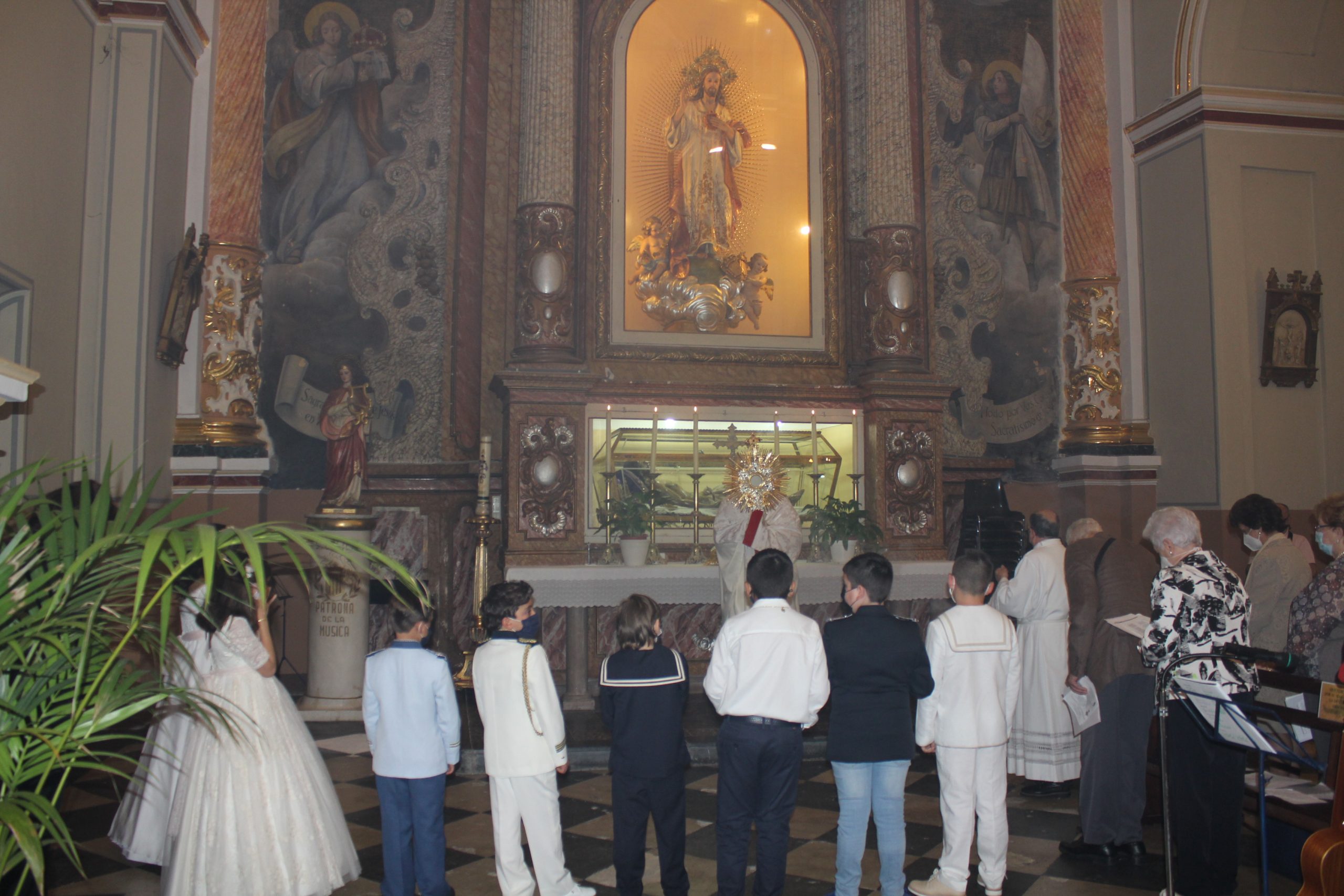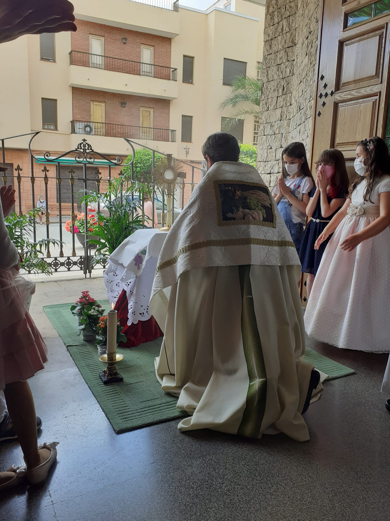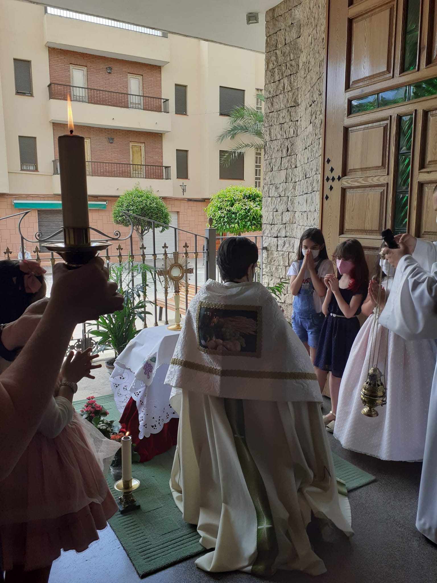 Por otra parte, en la parroquia Nuestra Señora de los Dolores durante la Eucaristía y posterior procesión, los feligreses permanecieron en todo momento en sus bancos mientras la Custodia salía del Altar Mayor portada por el vicario de localidad Borja, incensado el sacristán de la parroquia Pepe. Este también estuvo acompañado por los niños y niñas que este año han tomado su primera comunión en esta parroquia y en la puerta del templo buñolense estaba instalado un pequeño altar.