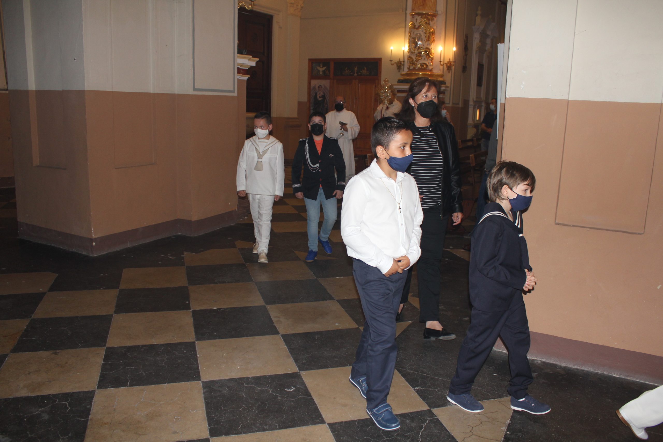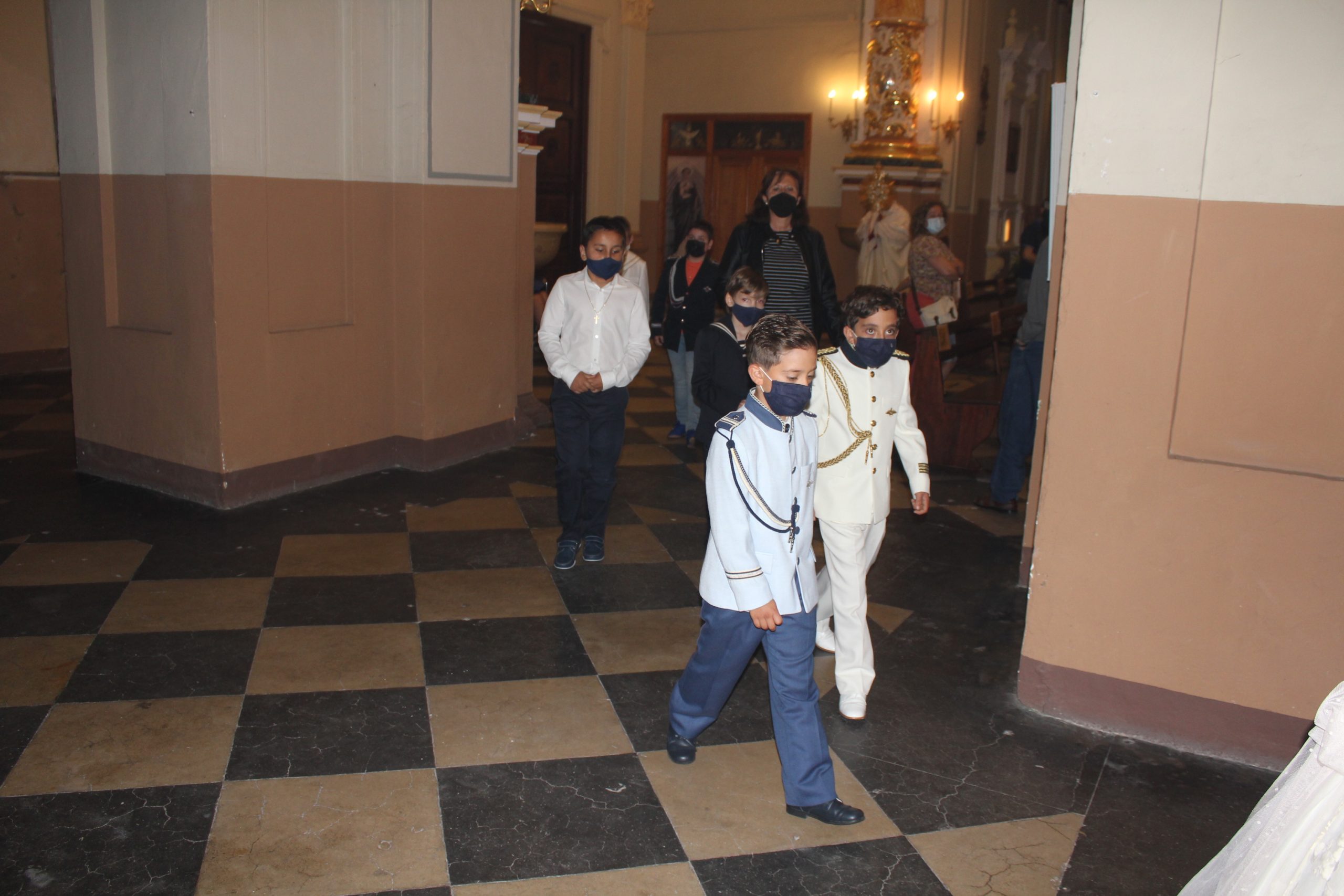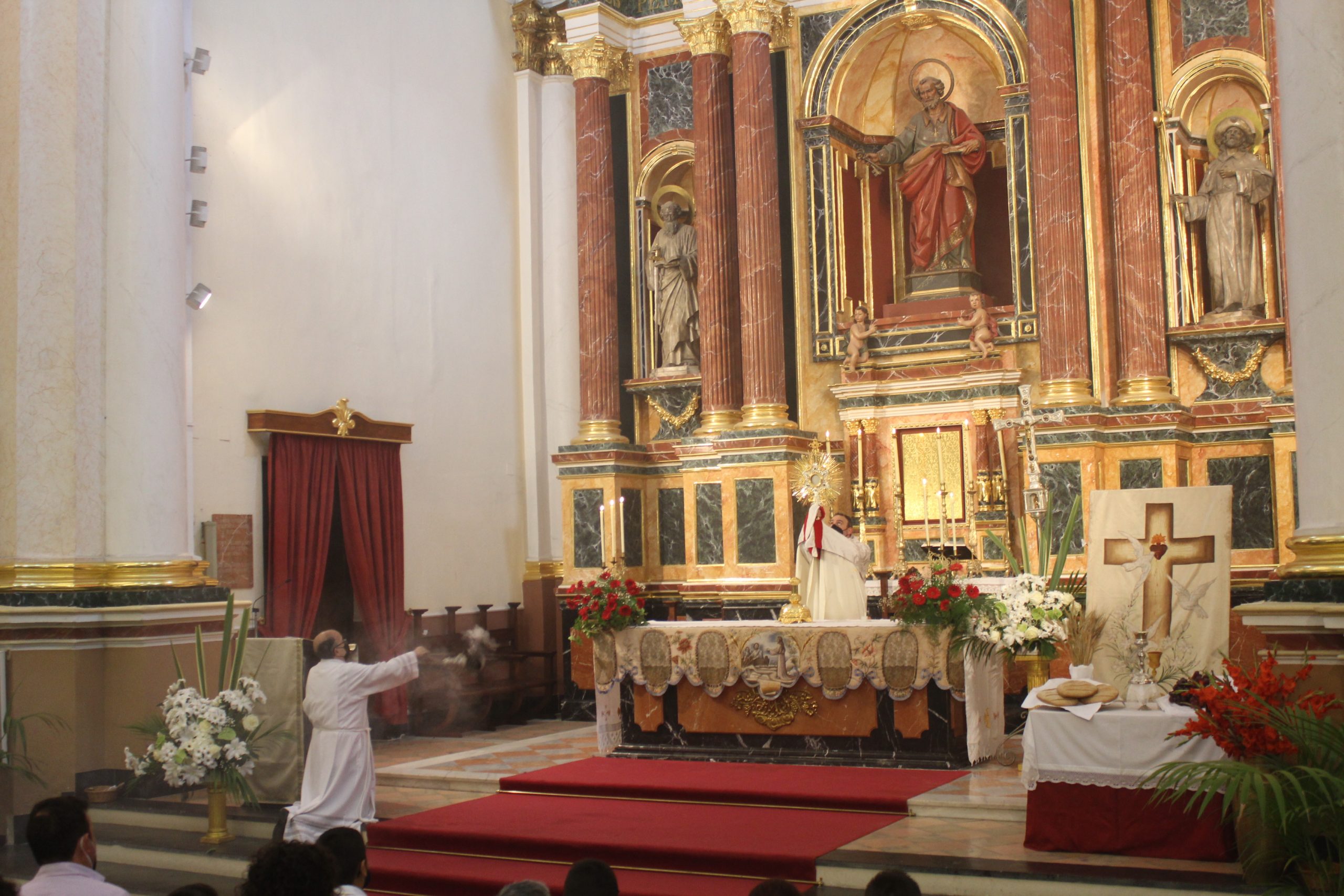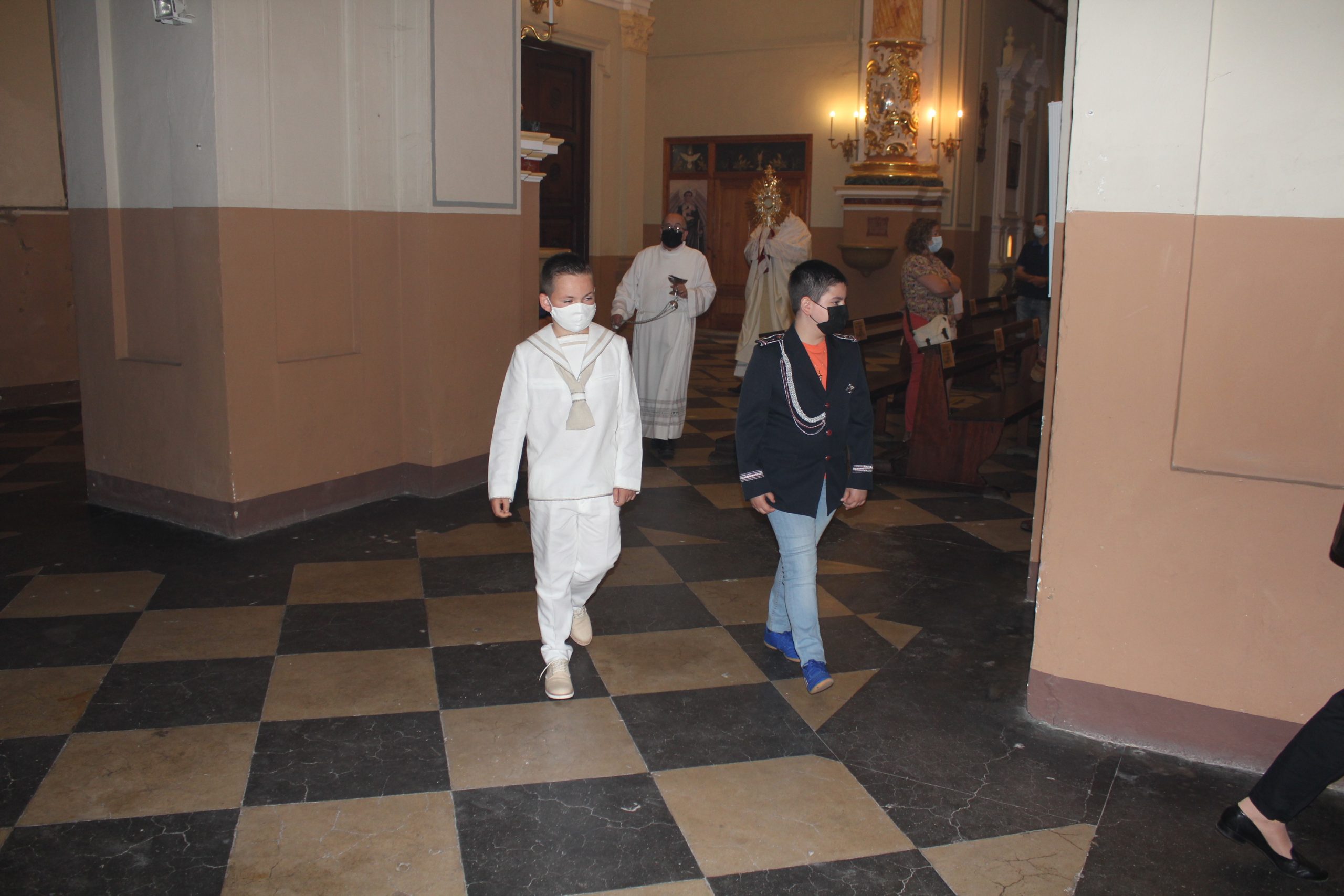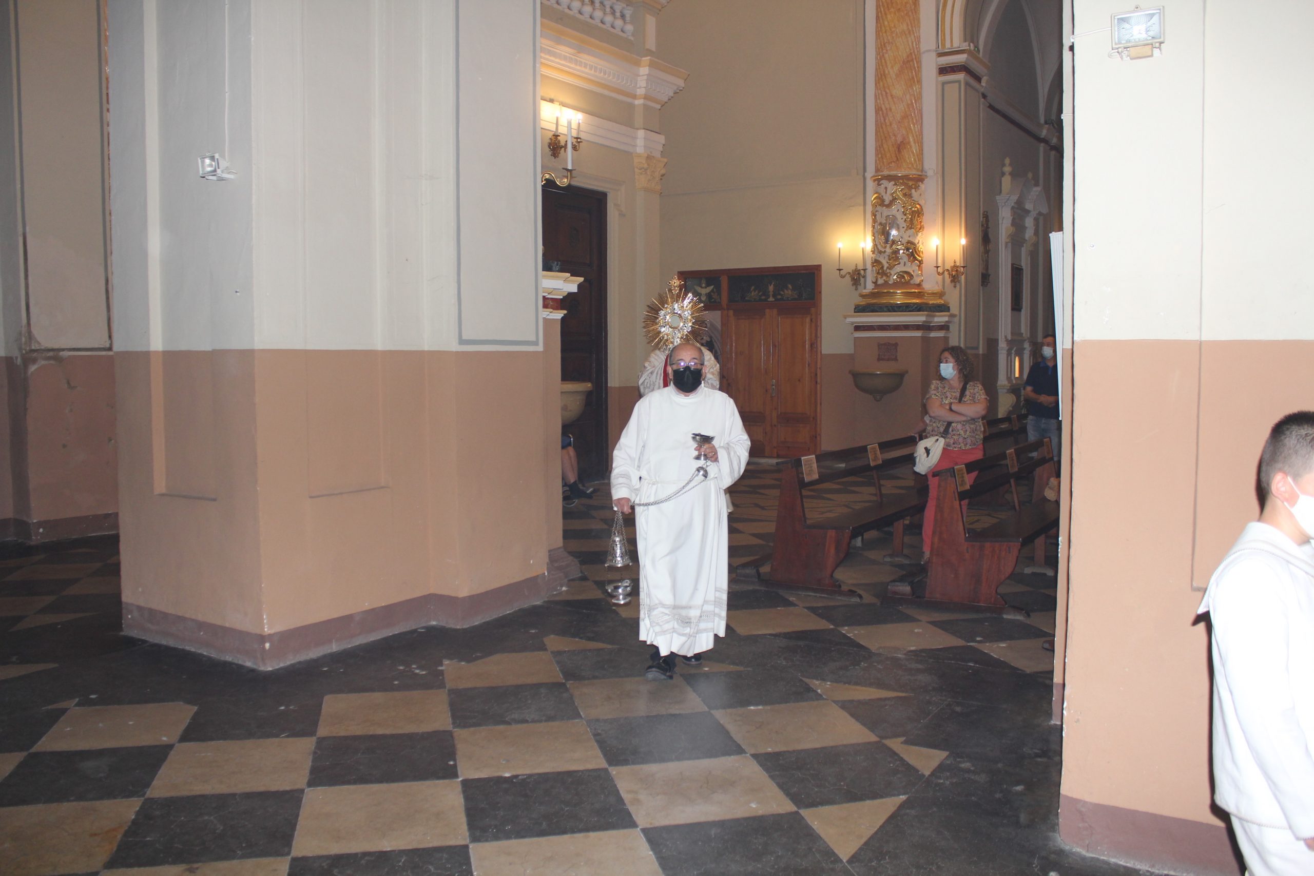La celebración en San Pedro Apóstol, al igual que el año pasado, estuvo condicionada por la pandemia. No en vano, los feligreses permanecieron en todo momento en sus bancos mientras la procesión recorría los pasillos laterales del templo buñolense, parando en varios altares como en el altar mayor.