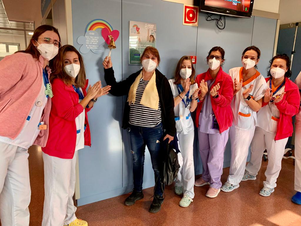Se oye el repique de una campana en la primera planta del Hospital de Manises. Es la señal de que uno de los pacientes hospitalizados en Oncologia ha recibido el alta. Varios sanitarios acompañan al paciente que la hace sonar al final del pasillo y aplauden la salida del paciente que hoy podrá volver a casa. La pequeña campana ha sido instalada en este centro sanitario en colaboración con la Fundación Músicos por la Salud y celebra cada una de las altas de los pacientes hospitalizados. Esta acción se enmarca en el proyecto “Campanas por la Salud”, una iniciativa que busca acompañar a las personas con cáncer durante su tratamiento, especialmente a niños y mujeres y trasladarles así un mensaje de esperanza.