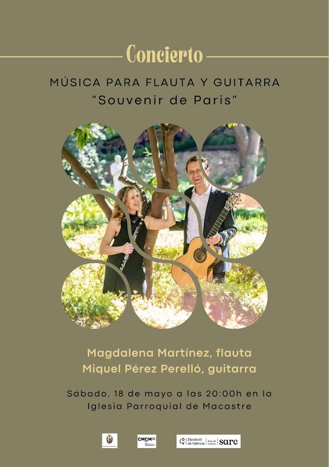 No obstante, la música también llegará el sábado a Macastre. Lo hará con el concierto «Souvenir de París», música para flauta y guitarra, a cargo de Magdalena Martínez y Miguel Pérez Perelló. El espectáculo se podrá disfrutar el sábado a las 20h en la Iglesia Parroquial de la localidad.