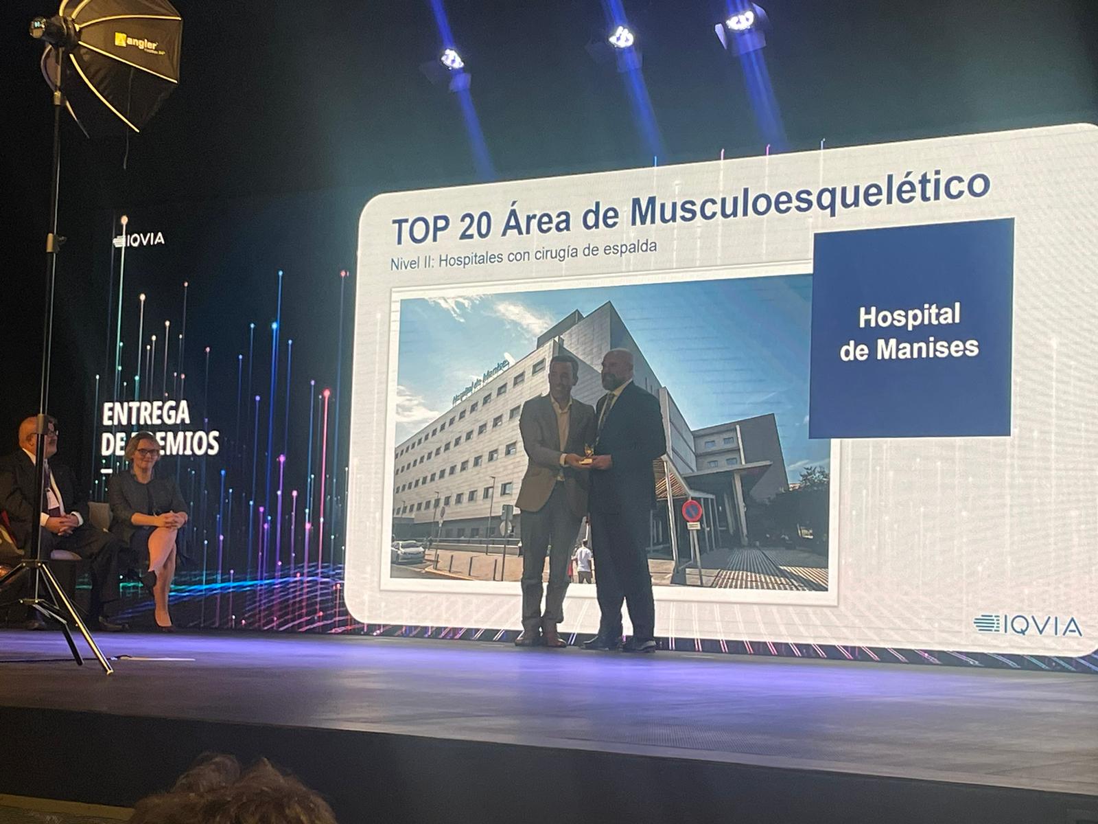 Redacción.- El Departamento de Salud de Manises está de enhorabuena. El Hospital de Manises consolida su liderazgo como centro de referencia en España al haber recibido hoy el galardón que premia a los mejores hospitales del país: los Premios Hospitales TOP 20, otorgados por IQVIA Healthcare. El centro sanitario, que estaba nominado en esta 24ª edición en las categorías de Gestión Hospitalaria Global y en el Área de Musculoesquelético, ha sido premiado en esta última entre los hospitales públicos de su categoría, consiguiendo el reconocimiento por segundo año consecutivo.