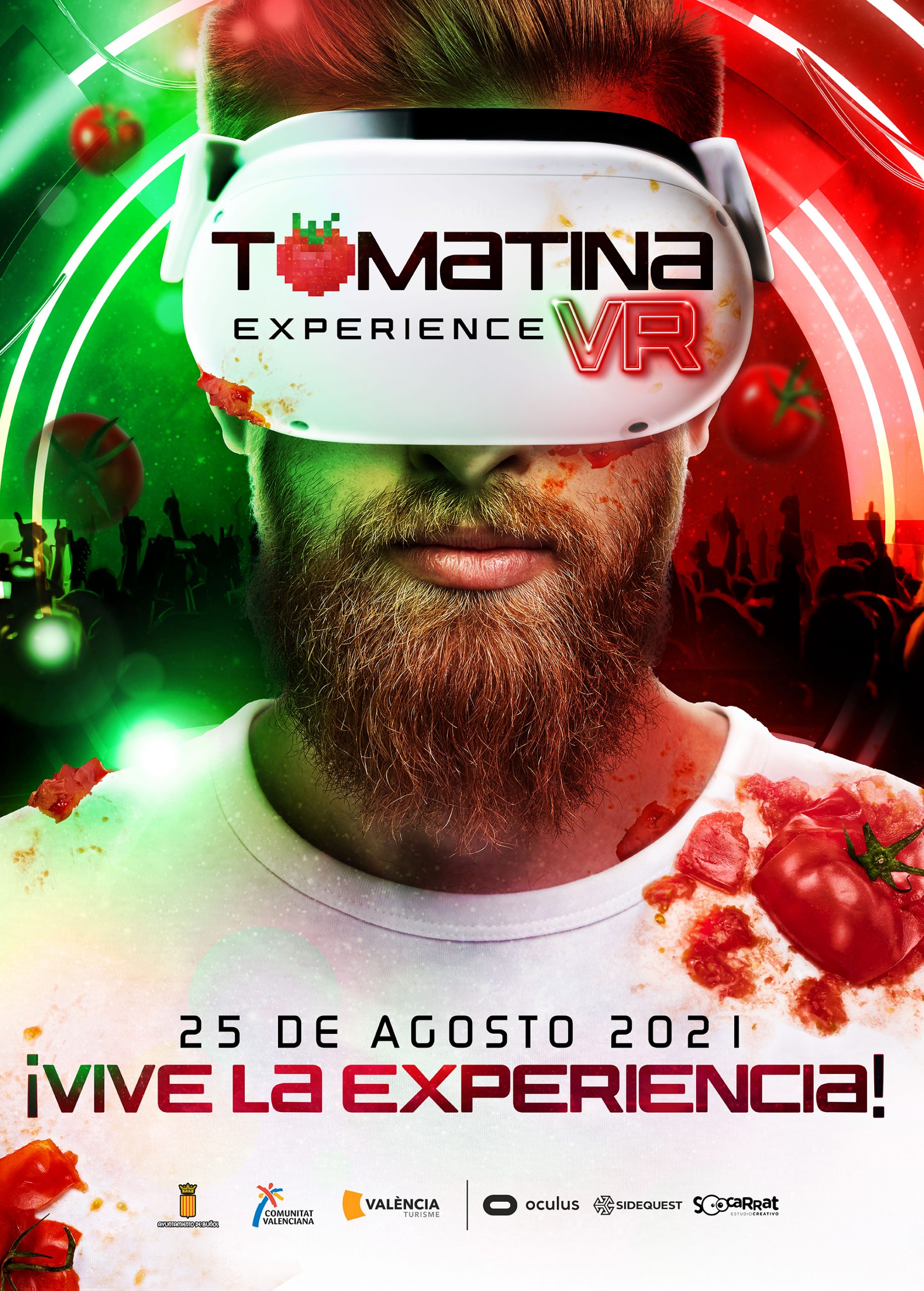 Socarrat Studio junto al estudio de desarrollo VR GorilaPunk, han sido los encargados del diseño y programación de un juego en el que se respira el ambiente de La Tomatina en cada rincón, en las camisetas oficiales de los participantes, en la lonas de los edificios y en las proclamas tradicionales de ese día como el clásico: “Forasteros, no vais a tener frio”. Una experiencia que además incluye como Banda Sonora el tema “Todo del mismo color” del grupo de Buñol “Malsujeto” que llena de ritmo esta experiencia.
