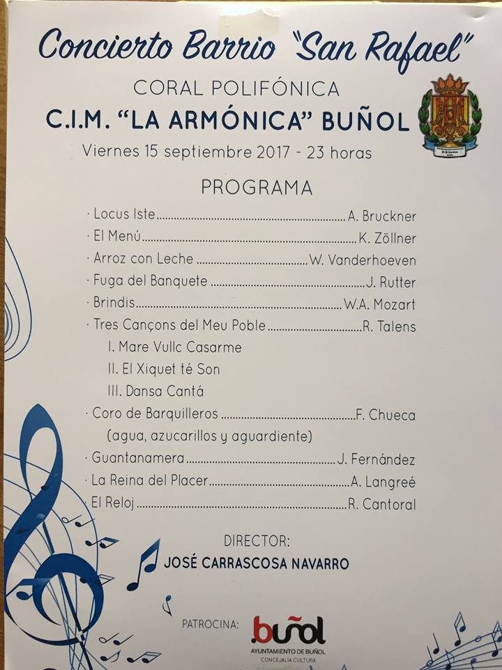 Esta noche a las 23 h., actuará la Coral Polifónica del C.I.M. . La Armónica, patrocinado por el Ayuntamiento de Buñol. Esta agrupación vocal nos ofrecerá un variado programa bajo la dirección de su titular José Carrascosa Navarro.