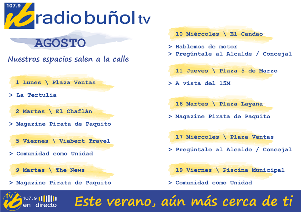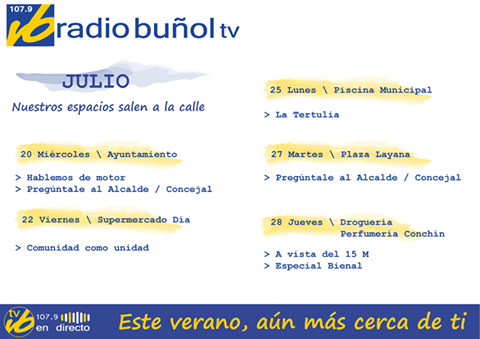 La emisora municipal Radio Buñol saca su programación a la calle y lo hace durante estas semanas de verano. De hecho la programación especial arrancó ayer con Pregúntale al Alcalde, desde el Ayuntamiento de Buñol. La programación se prolongará hasta el 19 de agosto.