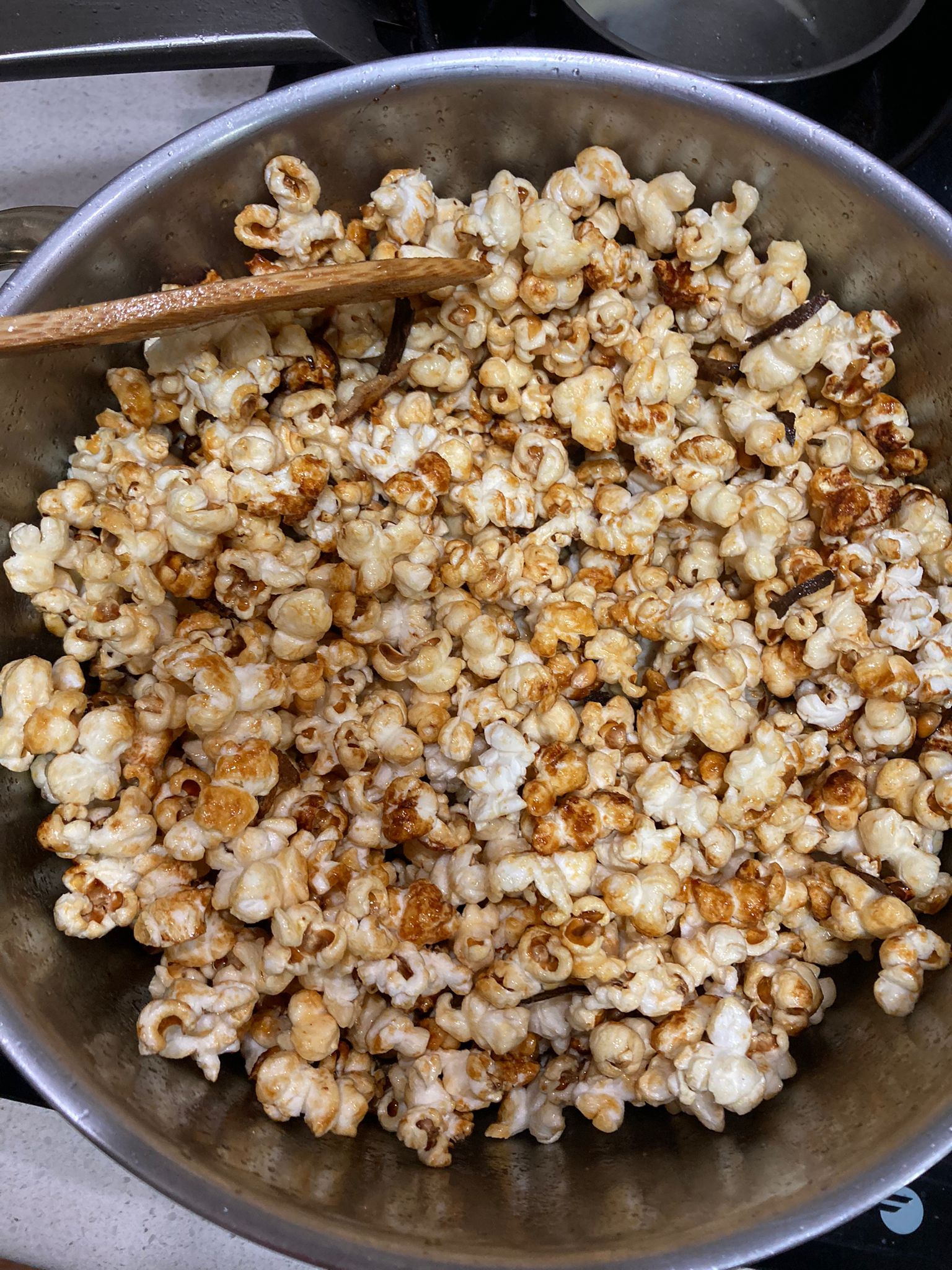 Elaboración: Poner todos los ingredientes en una cacerola o sartén amplia y acercar al fuego, esperar a que empiecen a salir las palomitas y tapar con una tapa. Cuidado que al saltar os podéis quemar con el azúcar que lleva. Una vez estén todas las rosas abiertas pasar a un molde para formar el bloque. Yo pongo una bandeja o fuente honda, le pongo una hoja de papel de horno mojado. Echar las rosas y empezar aplastando con las manos mojadas para que no se os pegue y os queméis. Cuando esté formado, solo tenéis que dejar enfriar.