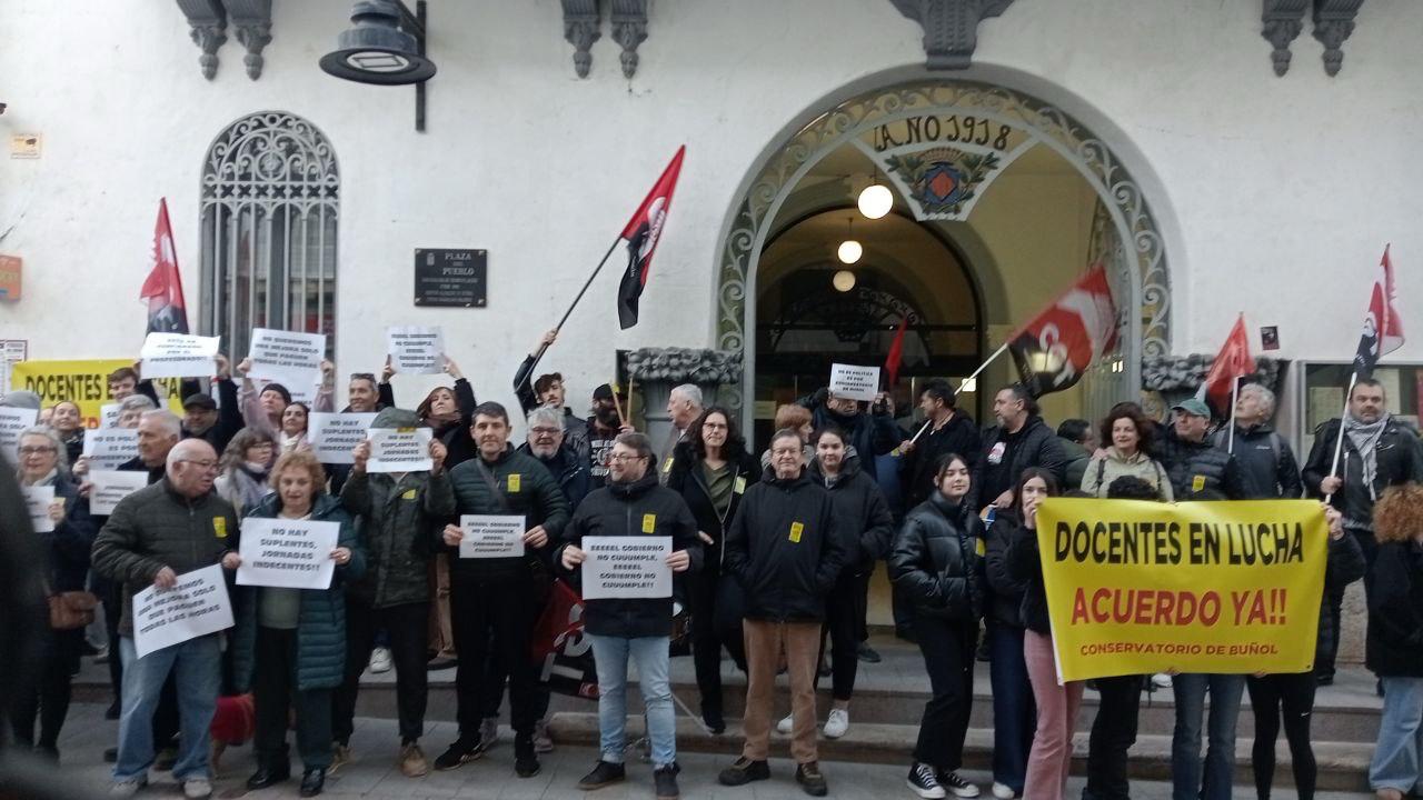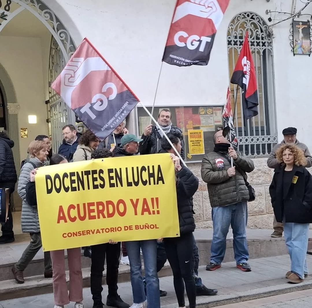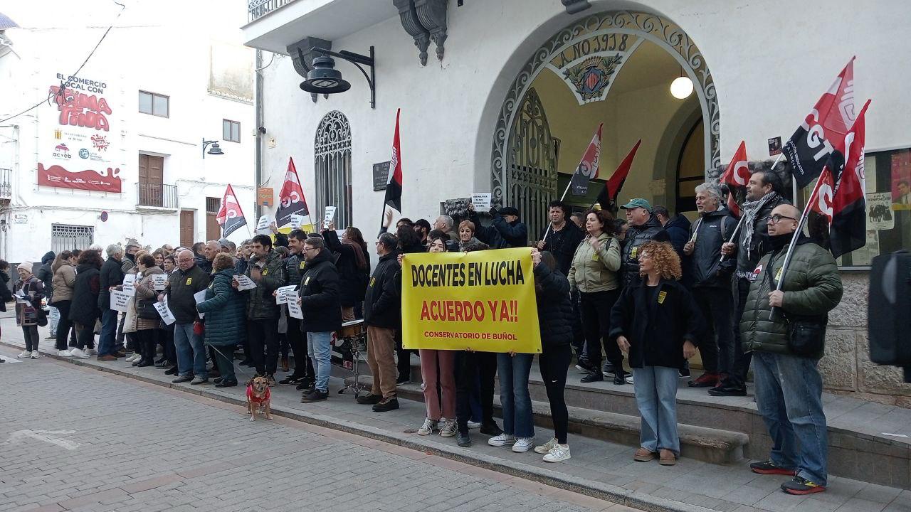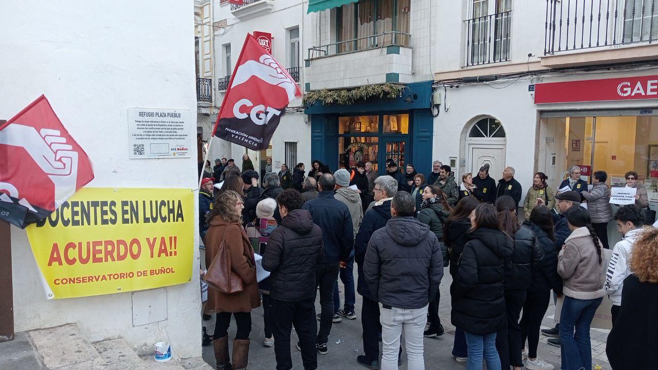 El pasado 28 de enero, la Asamblea de Docentes del Conservatorio Profesional de Música «San Rafael» de Buñol llevó a cabo su segunda jornada de huelga, coincidiendo con la celebración del Pleno ordinario del Ayuntamiento. Durante la protesta, los profesores y profesoras se concentraron a las puertas del consistorio para exigir soluciones a la anomalía en sus jornadas laborales y la falta de cobertura de bajas médicas, que afecta gravemente a la enseñanza del centro.